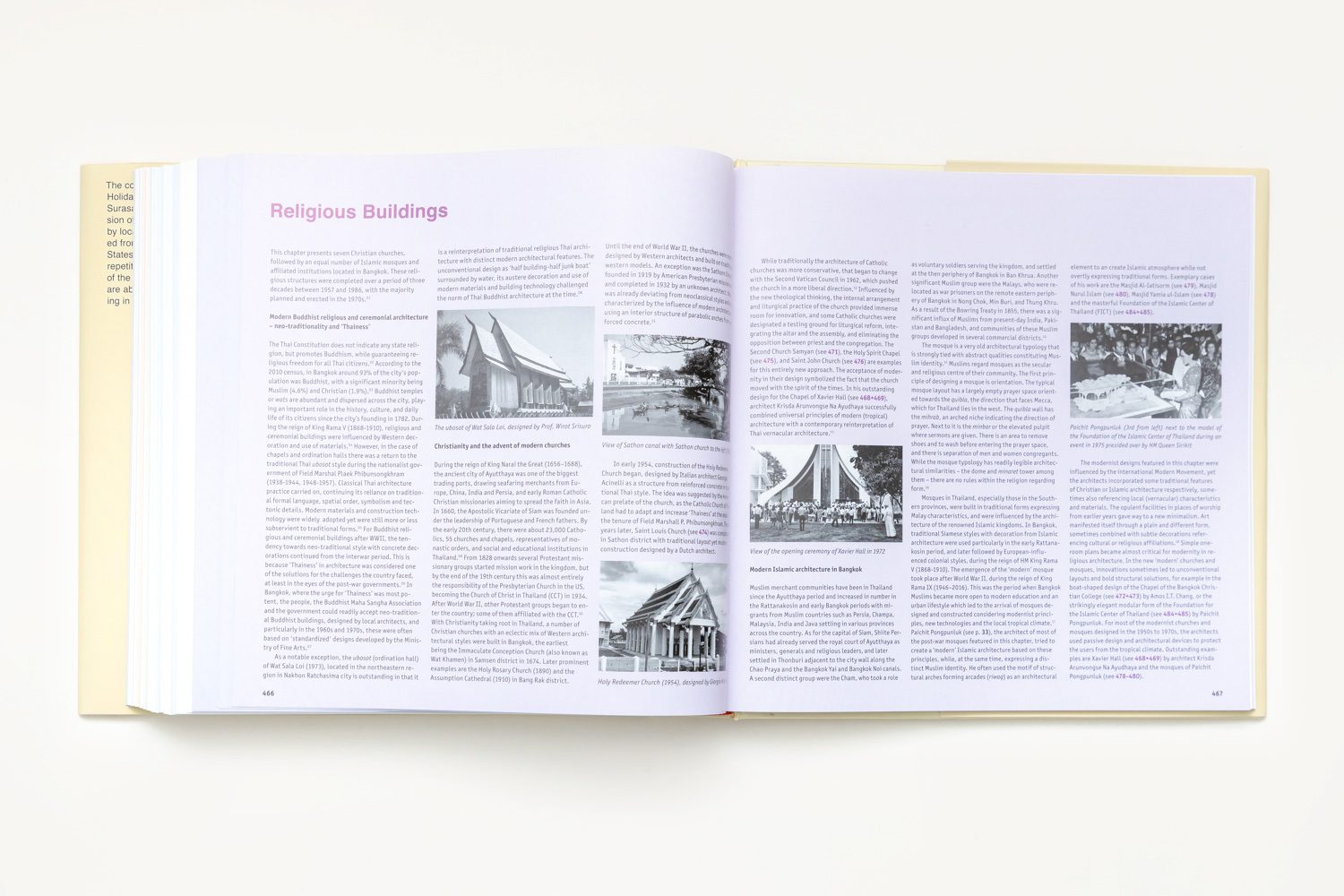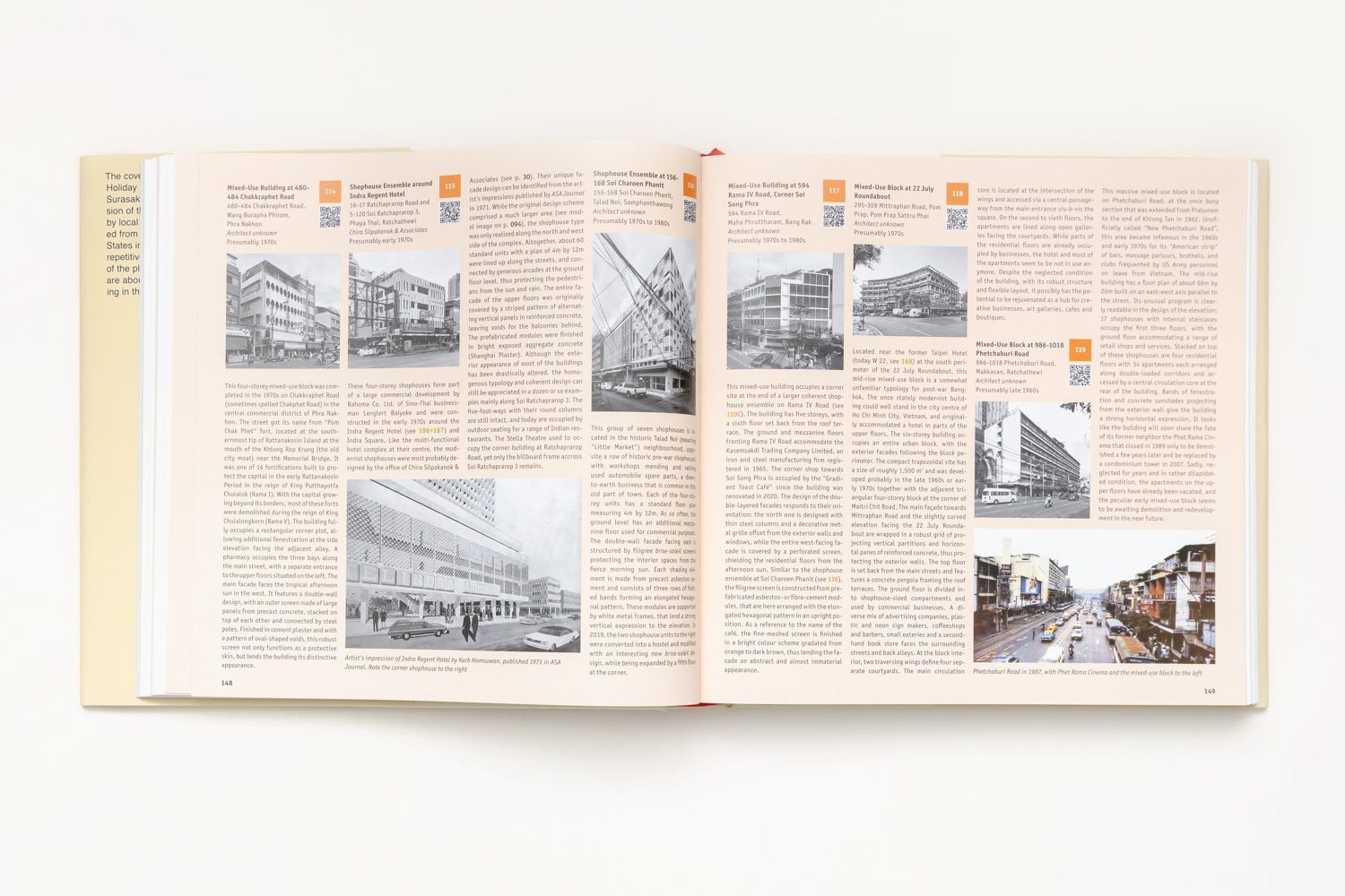 ตามมาเนื้อหาหลักที่เป็นไฮไลต์ ด้วยการแบ่งหมวดของภาพถ่ายสถาปัตยกรรมที่ก่อสร้างในราวทศวรรษ 1950 – 1970 ของกรุงเทพฯ ตามประเภทของอาคาร (โดยใช้สีสันที่แตกต่างกันออกไปในแต่ละหมวด) ร้อยเนื้อด้วยภาพถ่ายอาคารในอดีต แบบแปลนในการก่อสร้าง มาสู่ภาพถ่ายของ façade ทั้งอาคารที่อยู่อาศัย โรงแรม อาคารเชิงพาณิชย์ อาคารกึ่งพาณิชย์กึ่งที่อยู่อาศัย อาคารสาธารณะ อาคารสถานศึกษา และอาคารที่ใช้งานในเชิงศาสนา ทำให้เราสามารถเข้าใจรายละเอียดของอาคารแต่ละพื้นที่ในกรุงเทพฯ ทั้งในเชิงวิชาการของสัดส่วนทางสถาปัตยกรรมยุคโมเดิร์นที่ผสมผสานกับวัสดุที่นิยมอย่างปูนซีเมนต์กับคอนกรีต และความงามที่ซ่อนอยู่ในรายละเอียดแบบมีจังหวะของ façade ที่แปลกตาจนเราอาจคาดไม่ถึง ดูเข้ากันกับสภาพอากาศที่มีความร้อนชื้นของภูมิภาคอย่างลงตัว