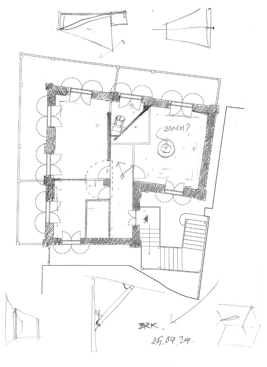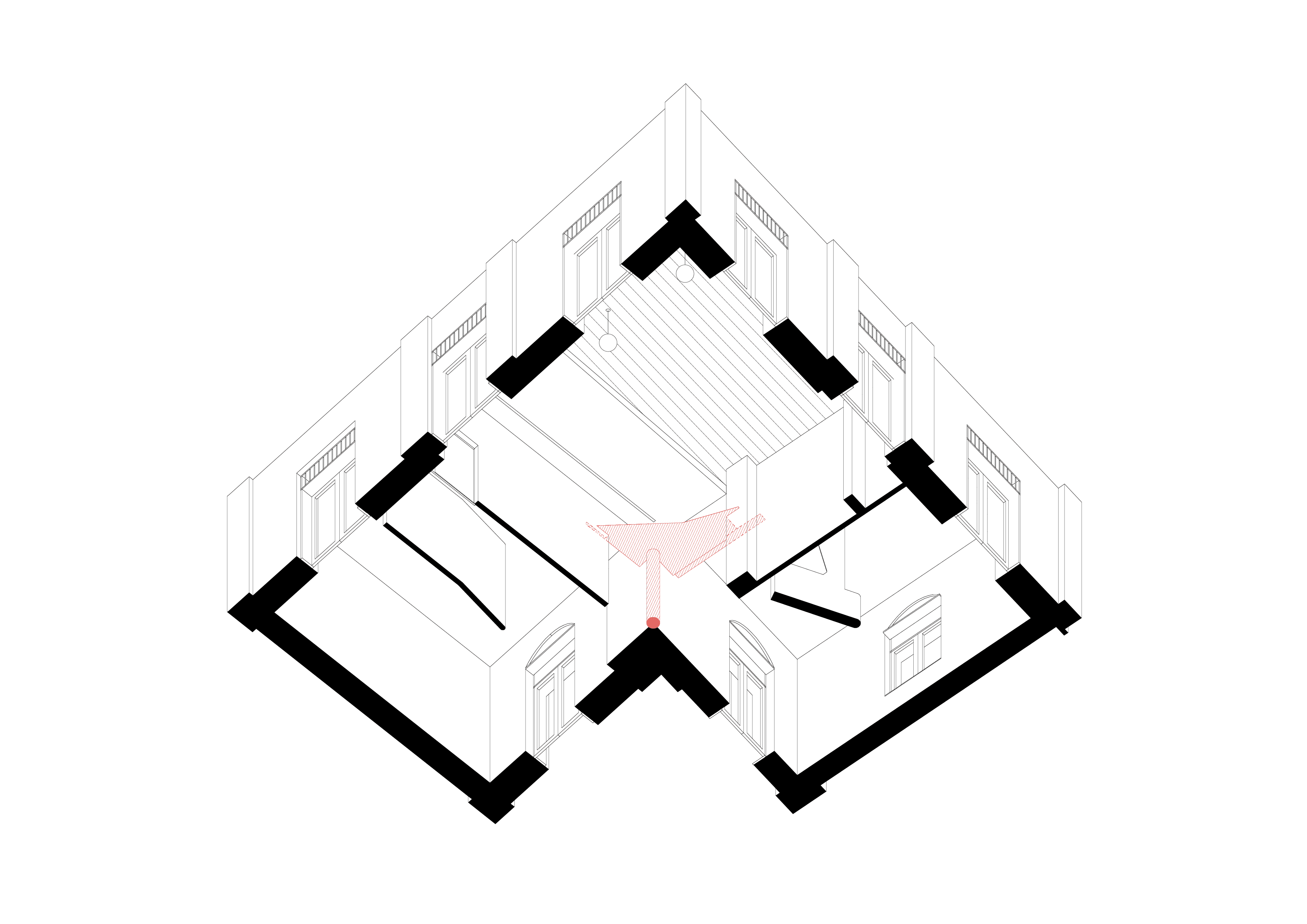 “ตอนที่รับบรีฟชั้น 1 เขาอยากได้ museum shop กับ lobby พอดูที่ตั้งอาคารเราอยู่ที่หัวมุมสามารถเข้าถึงได้จากถนนสองด้านเลยคิดว่ามันดีกว่าถ้า lobby สามารถเข้าได้สองทาง ในขณะเดียวกันก็ต้องมีวิธีการดีลกับ circulation ที่มันไม่ปกติ เพราะว่าถ้าเราเข้ามาตรงนี้ มันจะเข้ามาตรงมุมรูปตัว L ทำยังไงให้เราเข้านิทรรศการที่อยู่ที่ขาตัว L ทั้งสองด้านได้โดยไม่ต้องย้อนไปย้อนมาได้ เราคิดว่ามันน่าจะมีวิธีเล่นกับมุมตัวนี้โดยเปิดมุมสร้าง intervention อะไรสักอย่างเพื่อแสดงว่าในมุมตัวนี้มันจะเป็นทางเข้า” อัศรินทร์เล่าการแก้ปัญหาและสร้างโอกาสใหม่ให้กับ space