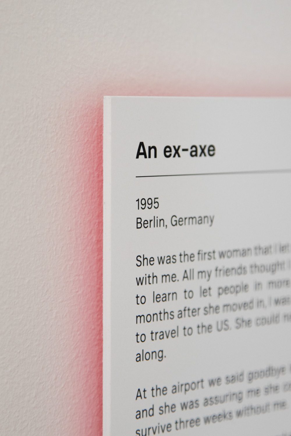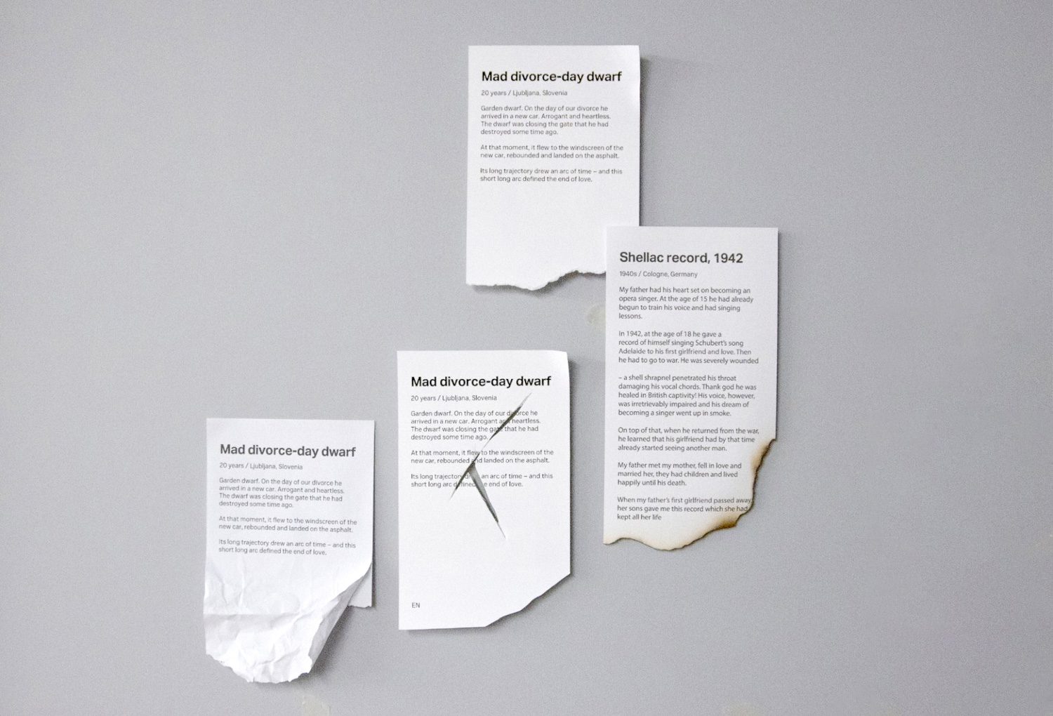 “ตอนนั้นเราได้ทดลอง tag หลายแบบมากทั้งที่ถูกตัดถูกฉีก จนกระทั้งไปถึงจุดหนึ่งเราเห็นแสงเงาของ tag บนกำแพง แล้วจึงนึกถึงการใช้กระดาษสะท้อนแสงด้านหลัง tag ที่จะสะท้อนสีลงบนพื้นสีขาว แนวคิดนี้เรารู้สึกว่ามันลงตัวดีเพราะเนื้อหาทั้งหมดมันมีอารมณ์อยู่ในนั้น ของบางอย่างก็จบแฮปปี้ บางอย่างก็รุนแรงมาก สีต่างๆ เลยสื่ออารมณ์ออกมาเป็น visual ดี และไม่ตรงไปตรงมาเกินไปเทียบกับ visual ของการฉีกขาด”