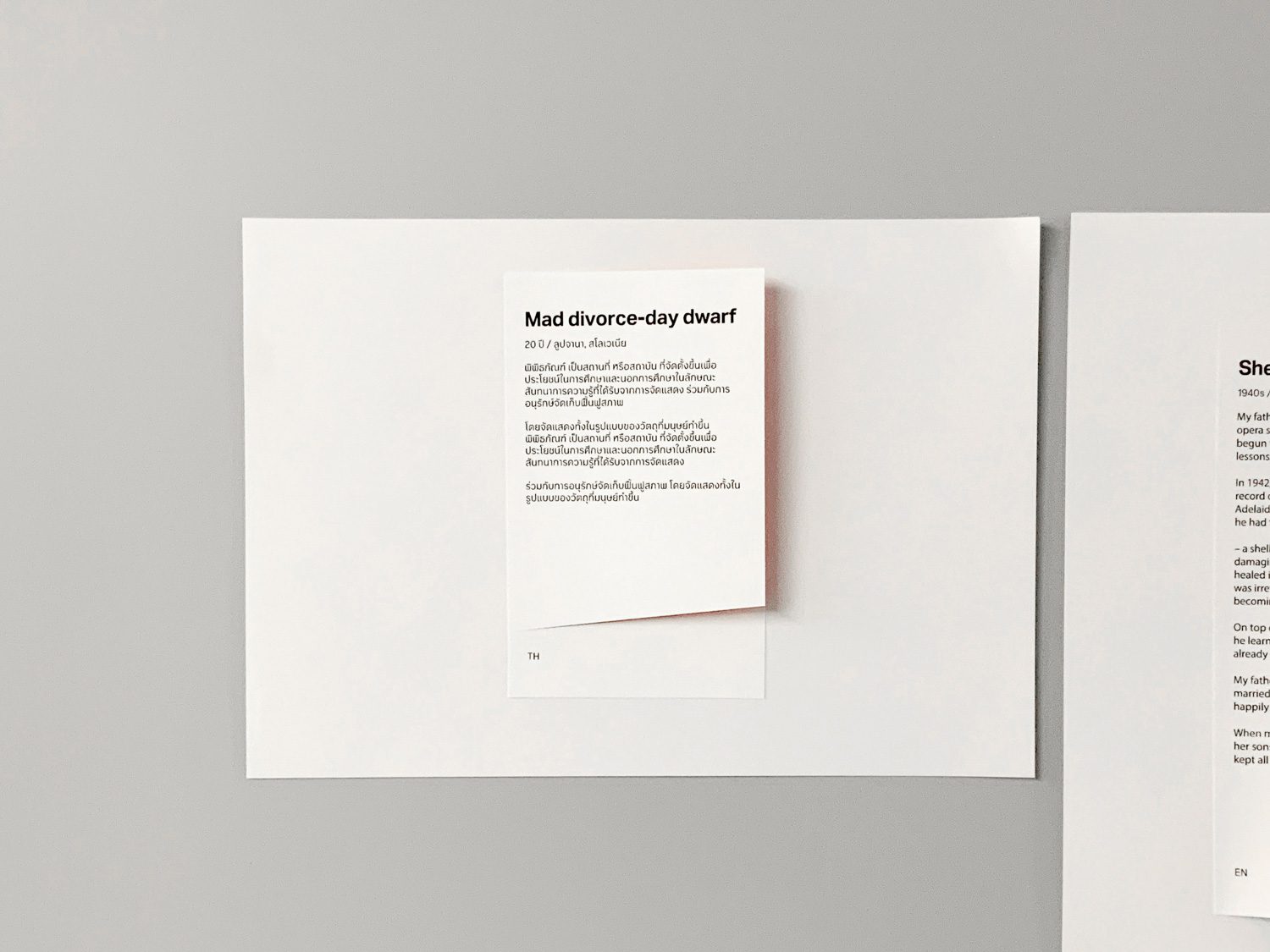 “ถ้าเป็นงาน object ศิลปะทั่วไปตัว tag ข้อมูลจะเรียบที่สุดหรืออยู่ในจุดที่เหมือนไม่มีตัวตนเพราะ object ควรจะเด่นซึ่งงานนี้ตัวเรื่องราวนั้นสำคัญทำให้ tag มันต้องเด่นขึ้นมา แต่ผมก็ไม่อยากให้กราฟิกมันตะโกน อยากให้มันสนับสนุนตัว space มากกว่า” นุภาพผู้รับผิดชอบงานกราฟิกอธิบายความเฉพาะตัวของโครงการ