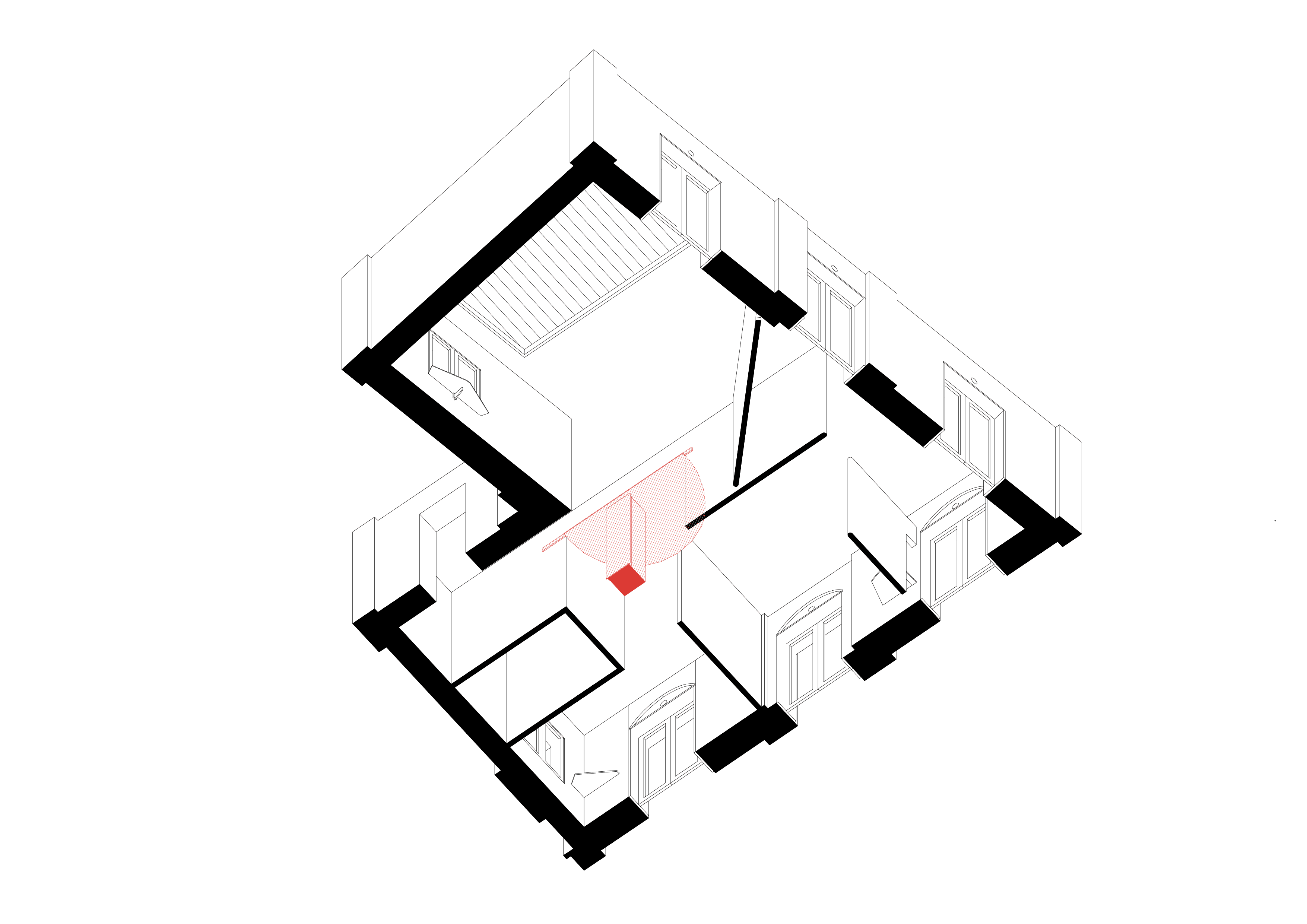 “ก่อนหน้าที่นี่เป็น hostel ห้องชั้น 2 ถูกแบ่งเท่าๆ กันเป็นห้องพัก เราเอาผนังออกเพื่อให้ห้องมีขนาดต่างกันเพื่อสร้างประสบการณ์ และใช้เทคนิคเดิมเหมือนชั้น 1 คือใช้ผนังที่ลอยอยู่กลาง space และเทคนิคการให้เข้าตรงมุมห้องเหมือนข้างล่าง แต่ตัวเชื่อมเราใช้ไม้แทน มันก็จะดูเข้ากับสภาพแวดล้อมของพื้นไม้ชั้น 2 และทำ form วงกลมให้ดูรู้เลยว่าอันนี้ของใหม่นะ”