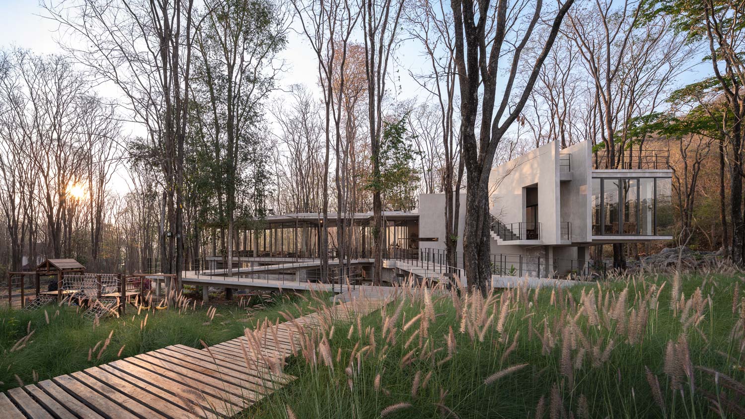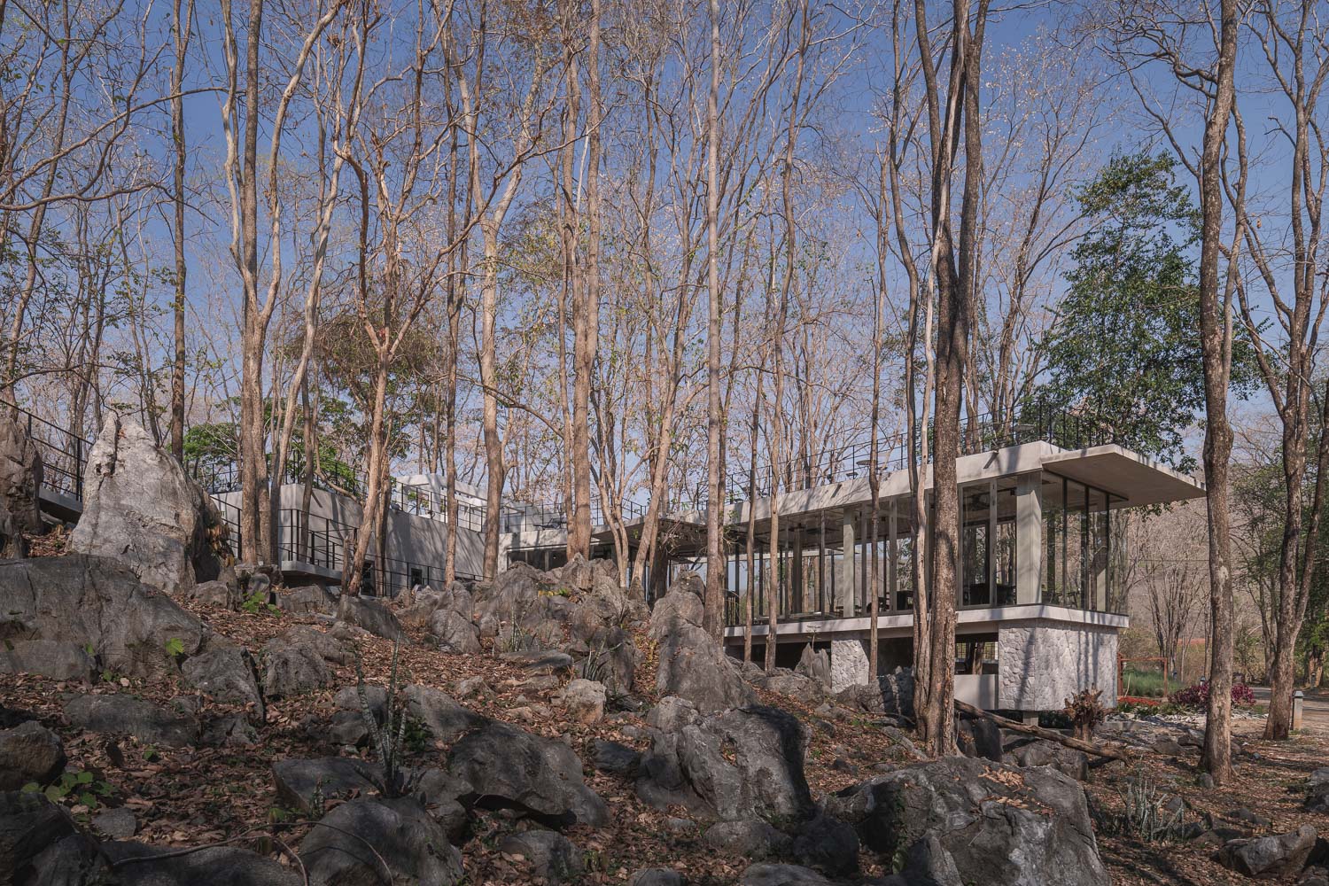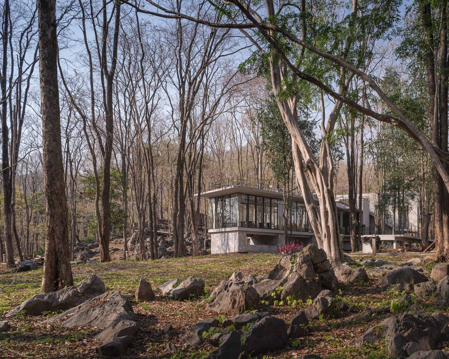 พ้นแนวทุ่งหญ้าเขียวขจีที่โอนไหวตามสายลม คือตัวอาคาร Ravenscale Khaoyai ที่สอดแทรกกลมกลืนไปกับทิวไม้ ผังอาคารถูกวางลงผืนดินอย่างบรรจง ด้วยความระแวดระวังไม่ให้ต้นไม้ต้องถูกย้ายหรือตัดออกไป ผิวผนังปูนเปลือยที่ไม่ผ่านการตกแต่งสะท้อนตัวตนที่เรียบง่าย อาคารเป็นเพียงผืนผ้าใบอันสงบนิ่ง เปิดทางให้ธรรมชาติและแสงแดดที่ส่องผ่านแนวไม้ได้แสดงความงามอย่างเต็มที่ ฐานอาคารกรุผิวด้วยหินเพื่อกลบความกระด้างของโครงสร้าง และเชื่อมโยงกับหินธรรมชาติที่ปะปนบนผืนดินอย่างแนบเนียน พื้นที่รับประทานอาหารโอบล้อมด้วยบานกระจกใส เปิดรับทัศนียภาพธรรมชาติอย่างเต็มที่ และเชื้อเชิญบรรยากาศภายนอกให้ผสมผสานกับภายในอย่างกลมกลืน