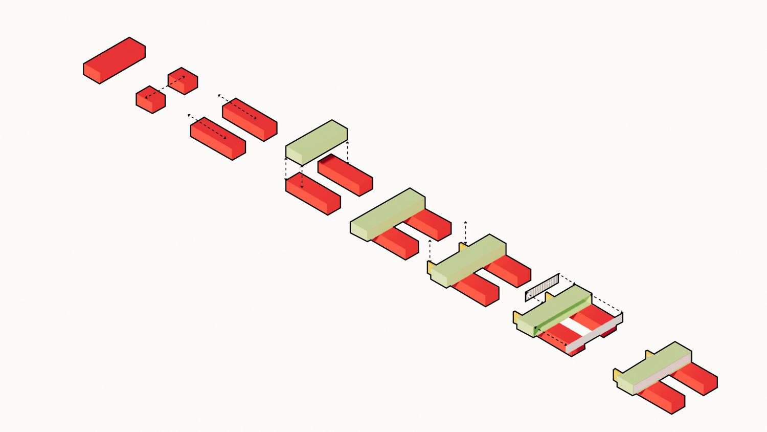 มีชัย เจริญพร สถาปนิกจาก Backyard Architect เล่าว่า การออกแบบเริ่มต้นจากการทั้งความชอบในบ้านทรงตัว U ของผู้ว่าจ้าง ควบคู่ไปกับการจัดเรียง zoning ของกิจกรรมลงไป ก่อนจะลำดับความเป็นส่วนตัวของแต่ละพื้นที่ การออกแบบให้พื้นที่ของทั้งชั้นสอง เป็นพื้นที่ส่วนตัวของครอบครัว การทำกิจกรรมหลักๆ และการพักผ่อนจะเกิดขึ้นในชั้นนี้ต้องสร้างความรู้สึกปลอดภัย นอกจากผู้อยู่อาศัยยังรู้สึกเหมือนได้รับการปกป้องแล้วยังต้องให้ความรู้สึกเบา ไม่ทึบตันจนอึดอัด การใช้ช่องเปิดเพื่อให้ยังเข้าถึงแสงธรรมชาติก็ยังเป็นสิ่งจำเป็น กระบวนการเหล่านี้ทำให้ mass ของบ้านค่อยๆ เห็นเป็นรูปเป็นร่าง ภายหลังจากสื่อสารเพื่อสร้างความเข้าใจต่อผู้ว่าจ้างด้วยการจัดวางบล็อกเลโก้อย่างไม่ซับซ้อน ไอเดียก็ถูกตอบรับอย่างดีและถูกนำไปพัฒนาต่อ โดยผู้ว่าจ้างก็ร่วมหยอดความต้องการเพิ่มเติมว่าอยากให้ตัวบ้านนั้นดูมีความ ‘พิเศษ’ กว่าบ้านทรงกล่องทั่วไป