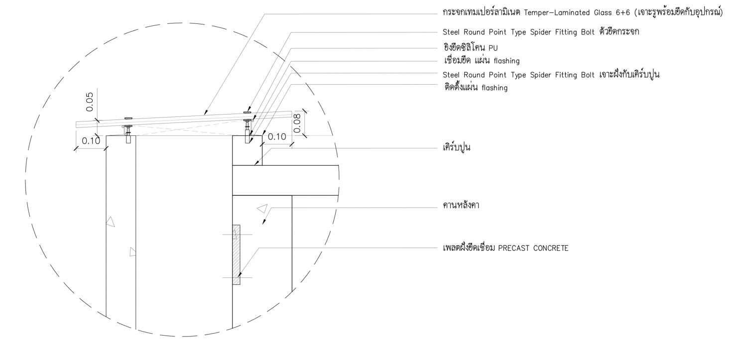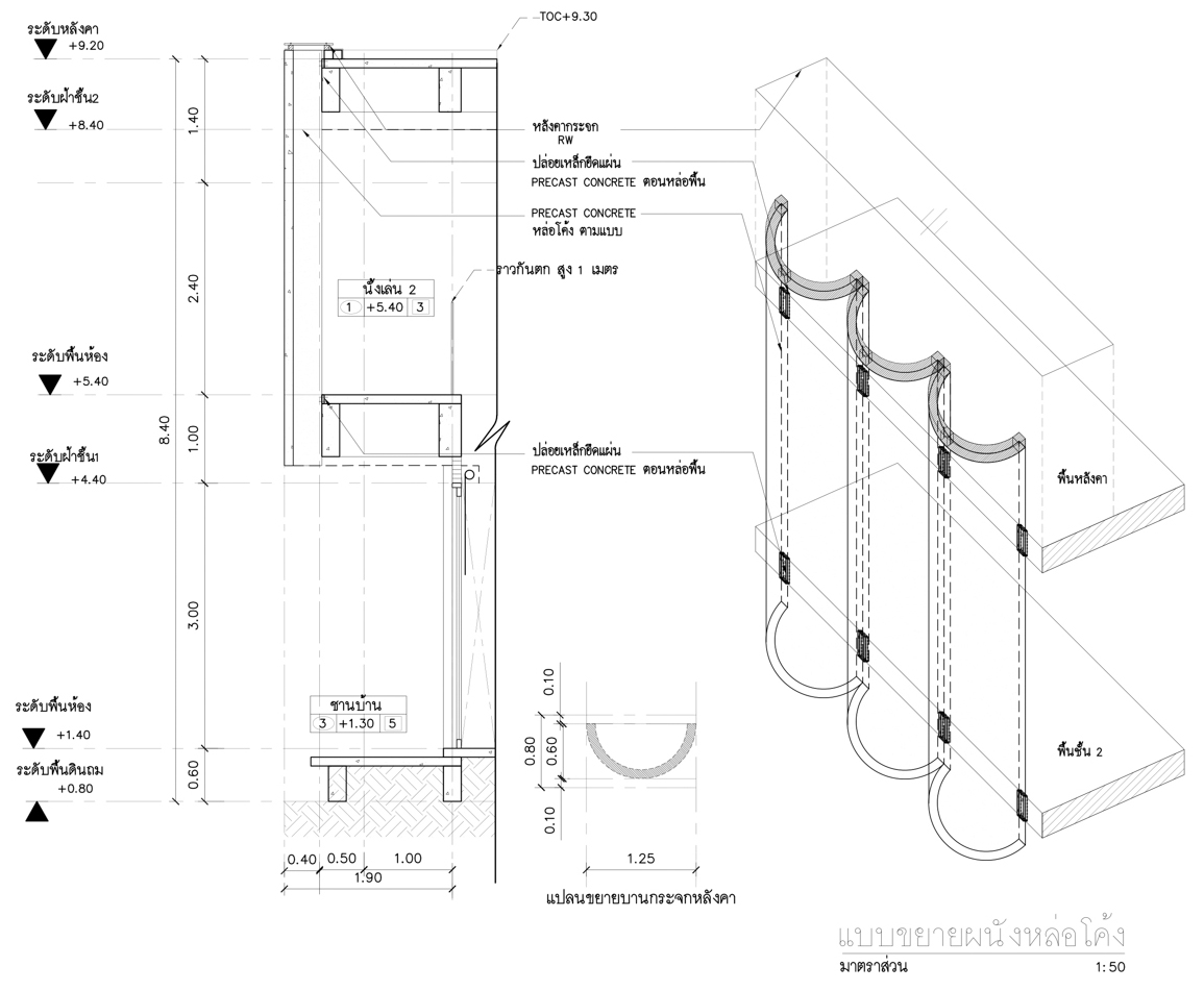 สถาปนิกกล่าวว่า ก่อนหน้านี้ เมื่อพูดถึงงานผนัง precast มักจะนึกถึงงานในกลุ่มอาคารสูงและหมู่บ้านที่ต้องการทำซ้ำในจำนวนมาก การได้เลือกใช้ในครั้งนี้ทำให้ได้เรียนรู้ว่าหากออกแบบอย่างรัดกุมและมีการวางแผนที่ดี การใช้คอนกรีต precast ก็ทั้งประหยัดเวลาและเงินให้กับงานประเภทบ้านแนวราบได้เช่นกัน โดยทางสถาปนิกสามารถออกแบบรูปทรง และการยึดจับแผ่น precast เข้ากับโครงสร้างในลักษณะที่ต้องการ หลังจากนั้นก็ทำการแลกเปลี่ยน-ปรึกษาข้อมูลกับโรงงาน precast อย่างละเอียด เพื่อเตรียมขึ้นแบบจริง ในระหว่างนี้ก็จำเป็นที่จะต้องให้ทีมของโรงงาน precast เข้ามาวัดพื้นที่ติดตั้งหน้างาน เพื่อป้องกันความผิดพลาดที่อาจเกิดขึ้นเมื่อยกแผ่นมาติดตั้ง แต่ถึงอย่างนั้น ก็มีบางจุดที่ออกมาเหนือความคาดหมายไปบ้าง เช่นระยะความยาวของแผ่น precast ที่ไม่ครอบคลุมความสูงของทั้งชั้นสอง (รวม 5 เมตร) ซึ่งเพิ่มขึ้นจากการความต้องการของเจ้าของบ้านที่ขอเพิ่มระยะฝ้าในชั้นสอง โดย mold หล่อทำได้ยาวสุดที่ 4.8 เมตร และการเพิ่มความยาว mold ให้ยาวขึ้นในงานที่ volume ไม่มากก็ต้องเพิ่มต้นทุนอีกเท่าตัว การติดตั้งแผ่นผนังหน้างานจริงจึงเกิด gap ระหว่างบริเวณรอยต่อของ mass ชั้นหนึ่งและสอง ทำให้เกิด effect ที่เหมือนก้อน mass ชั้นสองดู ‘ลอยขึ้น’ และ ‘เบา’ อย่างแปลกตา