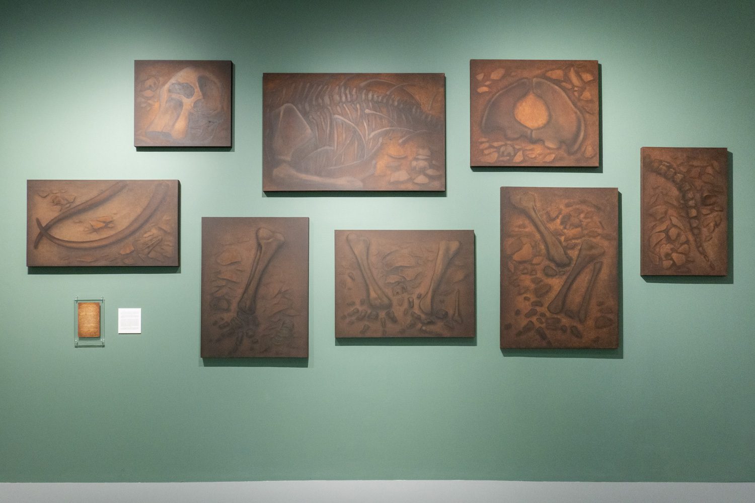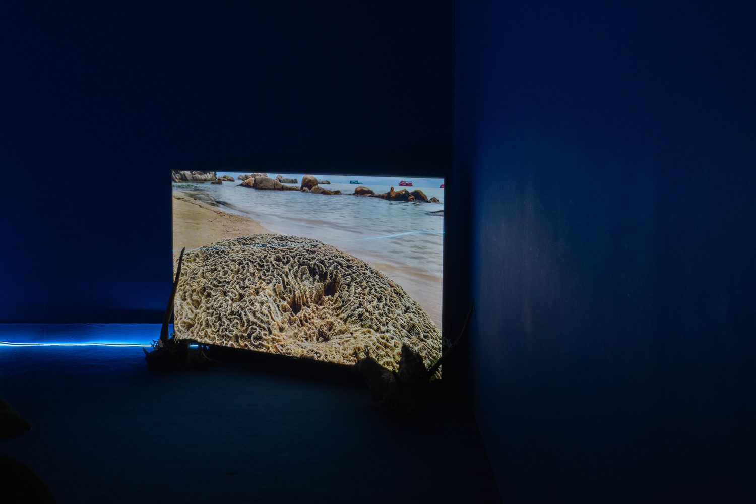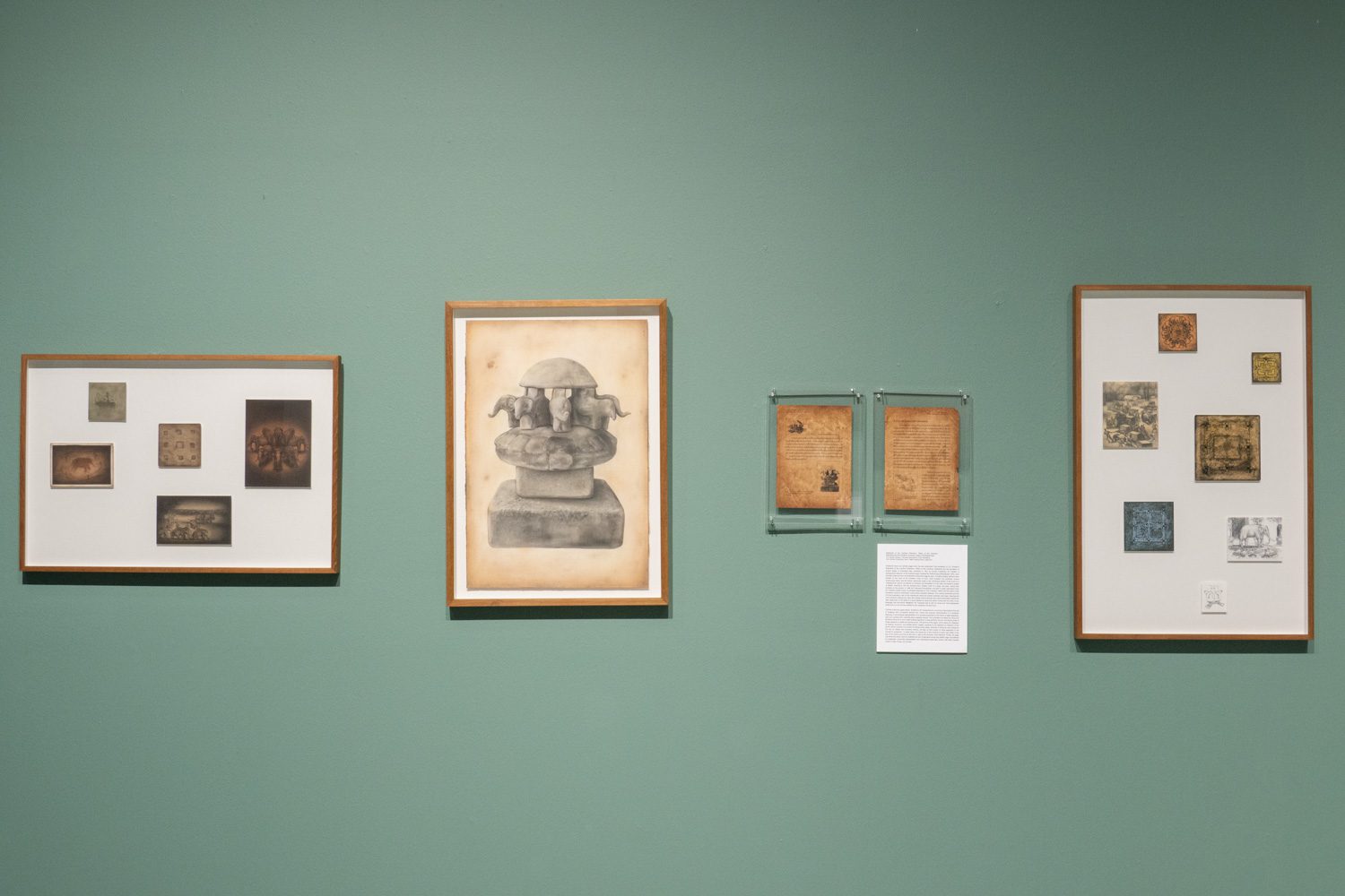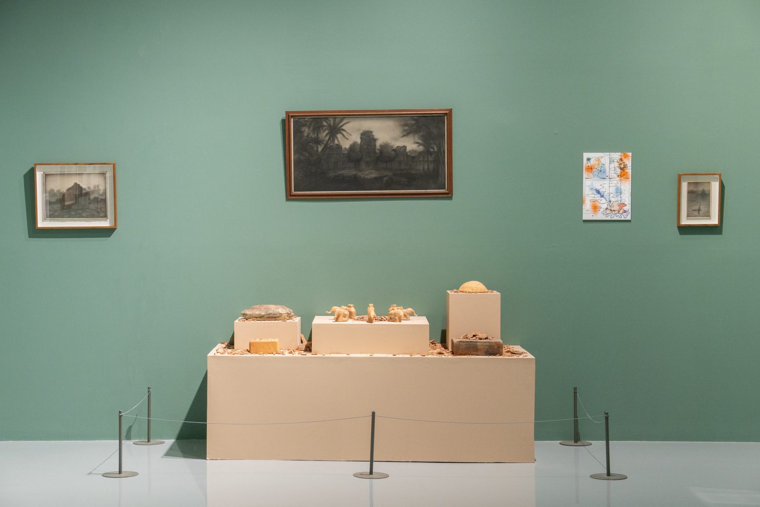 ‘The Elephant Cosmology: Fossils and Civilizations’ (2025) โดย ธนวัฒน์ นุ่มเจริญ เป็นอีกผลงานที่ศิลปินเลือกนำเอาเรื่องราวจากถิ่นกำเนิดมานำเสนอ นั่นคือเรื่อง ‘ช้าง’ ที่ปรากฏอยู่ในตำนานเรื่องเล่าตามคติพุทธ-ฮินดูในเอเชียตะวันออกเฉียงใต้ เช่น คติความเชื่อทางจักรวาลวิทยาที่เชื่อว่าโลกมีลักษณะเป็นแผ่นแบนขนาดใหญ่และตั้งอยู่บนหลังช้าง 4 เชือกที่แบกสัณฐานของโลกไว้ และตำนานการสถาปนาเมืองศรีสะเกษ บ้านเกิดของธนวัฒน์ ที่ว่ากันว่ามีช้างเผือกที่เป็นสัญลักษณ์แห่งบุญบารมีของกษัตริย์จากอยุธยาหลงมาและได้ควาญช้างที่ศรีสะเกษช่วยกันจับไว้ หรืออีกเรื่องหนึ่งที่ไม่ใช่ตำนานความเชื่อ แต่ศิลปินนำมาพูดถึงในผลงานเช่นกันคือ ความจริงที่ว่าช้างคือสัตว์สำคัญที่ถูกใช้เป็นแรงงานในการก่อร่างสร้างอาณาจักรในอดีต รวมทั้งใช้ในการขนส่งสินค้าเศรษฐกิจ
