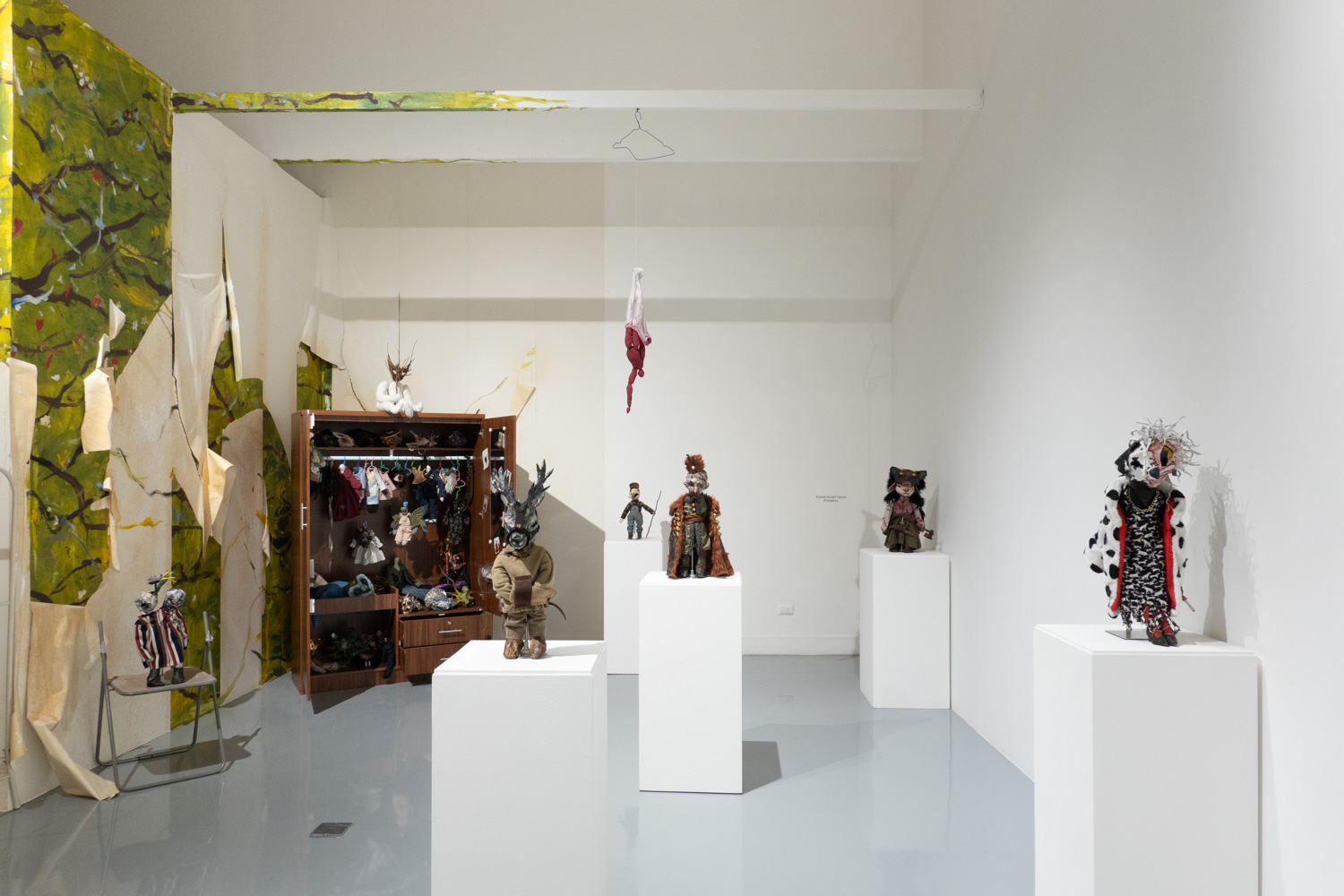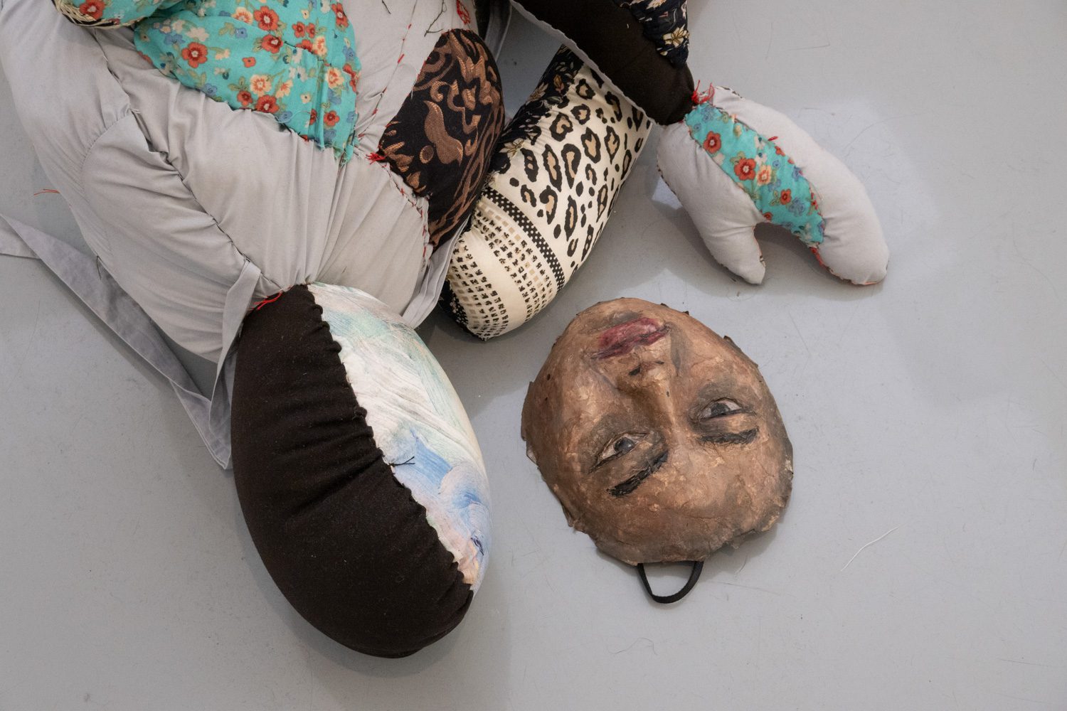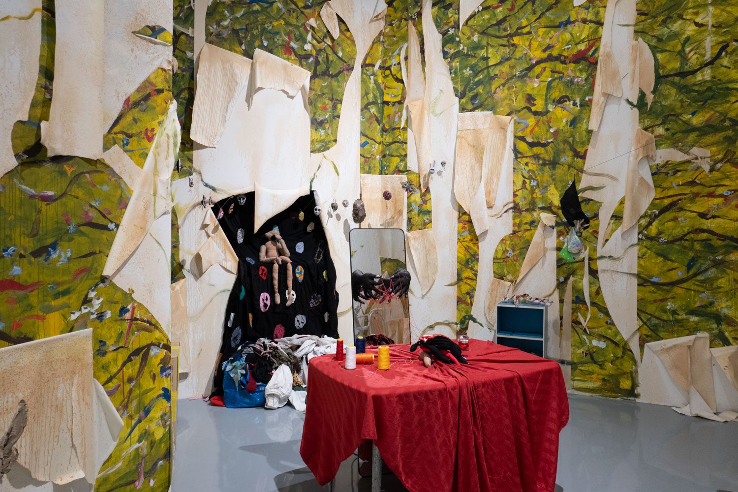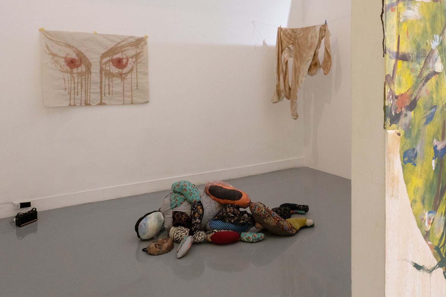 พิพัฒน์พงศ์ ศรีเพ็ง เป็นอีกคนที่นำเอาเรื่องราวจากประสบการณ์ในครอบครัวและความรู้สึกที่ซ่อนอยู่ด้านในมาสร้างสรรค์เป็นศิลปะ ‘Persona’ (2024-2025) ของเขา จัดแสดงอยู่ในพื้นที่ที่สร้างขึ้นเป็นห้องเล็กๆ ภายในแกลเลอรี และทันทีที่เราเดินเข้าไปด้านในนั้น ก็รู้สึกทันทีว่าเหมือนเดินเข้ามาภายในจิตใต้สำนึกของเขา ผลงานของพิพัฒน์พงศ์มีทั้งสิ่งทอ ตุ๊กตาเปเปอร์มาเช่ ภาพวาดฝาผนัง ดรออิ้ง สิ่งของเหลือใช้ และเสียง ซึ่งทั้งหมดทำงานร่วมกันได้อย่างลงตัว และแสดงได้ดีถึงความรู้สึกของเขาที่ต้องรับมือกับความคาดหวังจากครอบครัวและสังคม ทำให้ต้องปกปิดตัวตนที่แท้จริง โดยส่วนหนึ่งก็คือเพศสภาพของตนเอง