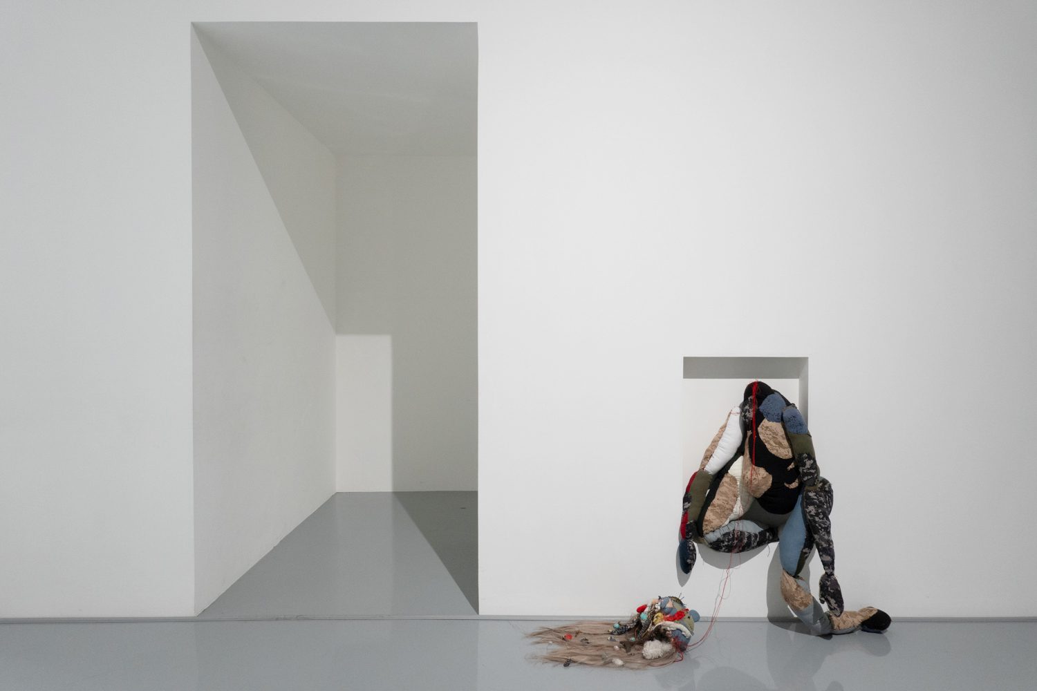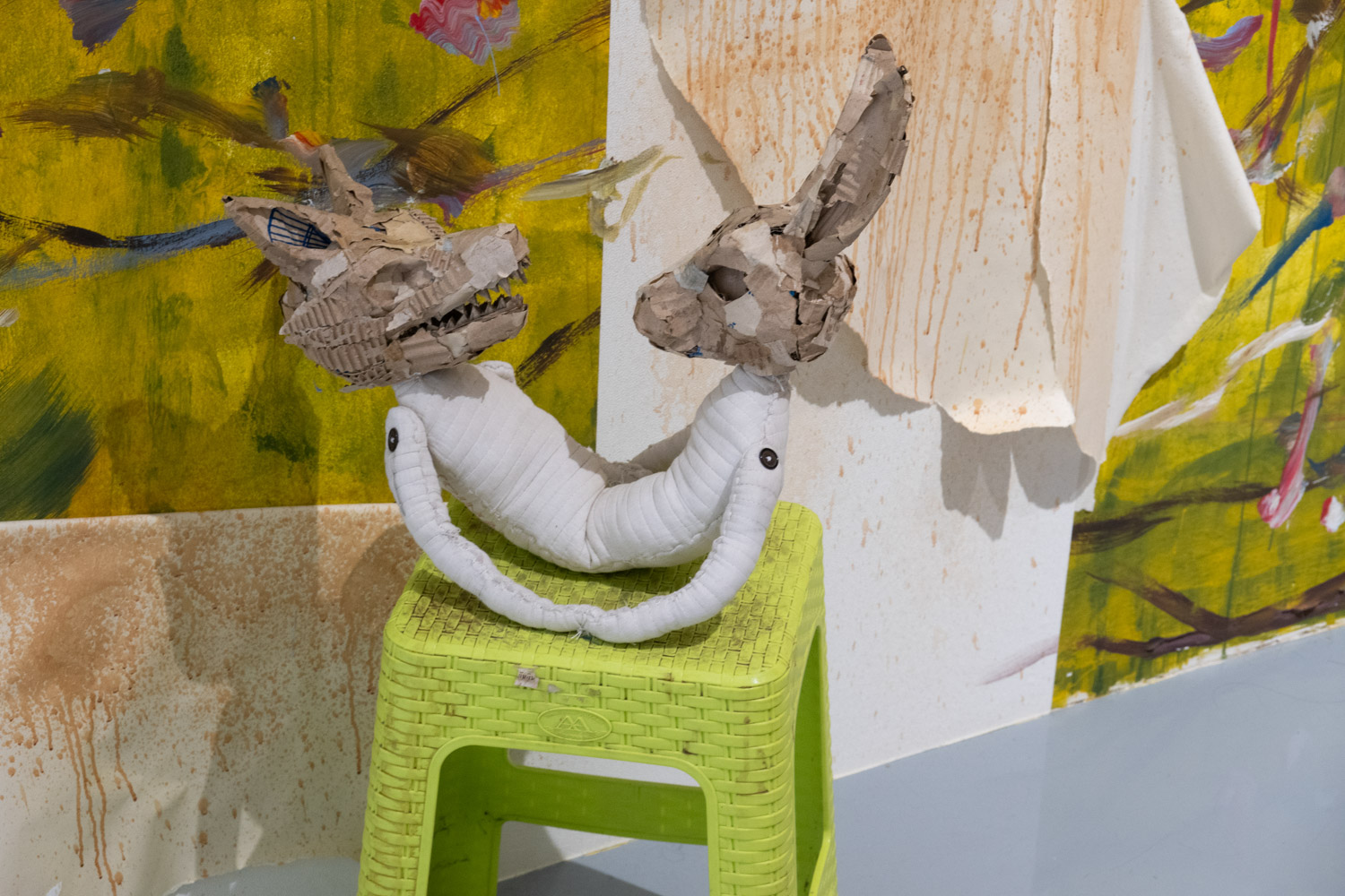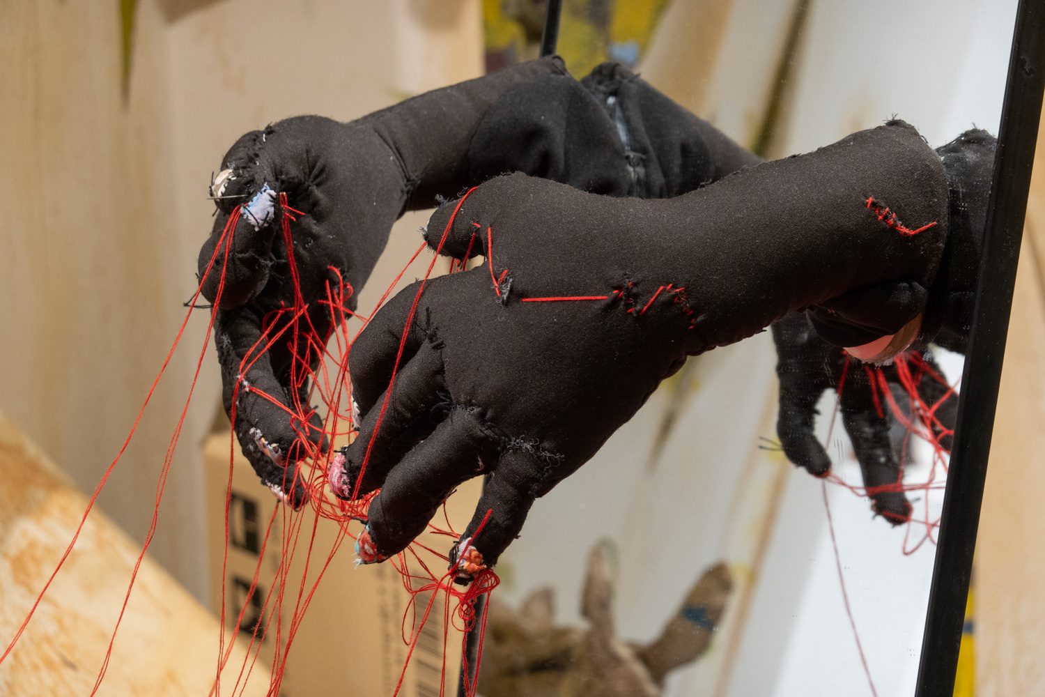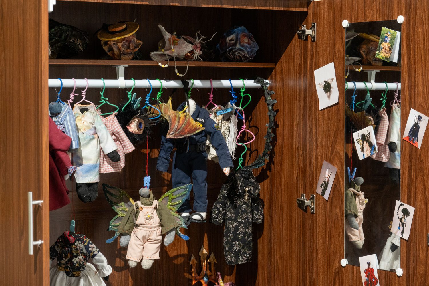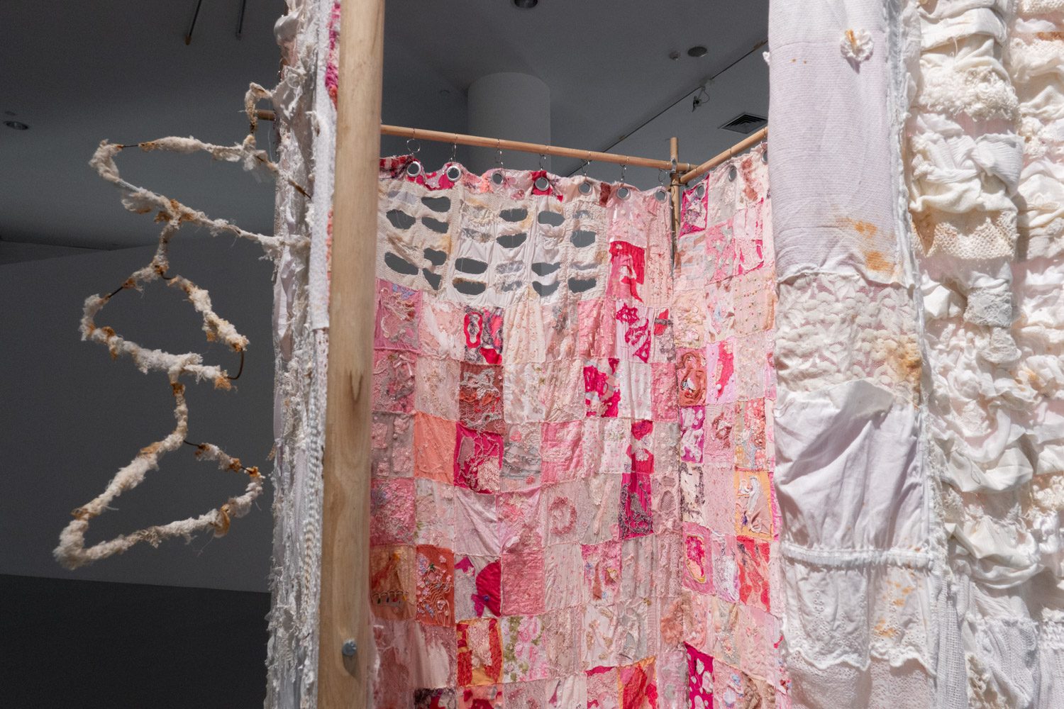 พิพัฒน์พงศ์ ศรีเพ็ง เป็นอีกคนที่นำเอาเรื่องราวจากประสบการณ์ในครอบครัวและความรู้สึกที่ซ่อนอยู่ด้านในมาสร้างสรรค์เป็นศิลปะ ‘Persona’ (2024-2025) ของเขา จัดแสดงอยู่ในพื้นที่ที่สร้างขึ้นเป็นห้องเล็กๆ ภายในแกลเลอรี และทันทีที่เราเดินเข้าไปด้านในนั้น ก็รู้สึกทันทีว่าเหมือนเดินเข้ามาภายในจิตใต้สำนึกของเขา ผลงานของพิพัฒน์พงศ์มีทั้งสิ่งทอ ตุ๊กตาเปเปอร์มาเช่ ภาพวาดฝาผนัง ดรออิ้ง สิ่งของเหลือใช้ และเสียง ซึ่งทั้งหมดทำงานร่วมกันได้อย่างลงตัว และแสดงได้ดีถึงความรู้สึกของเขาที่ต้องรับมือกับความคาดหวังจากครอบครัวและสังคม ทำให้ต้องปกปิดตัวตนที่แท้จริง โดยส่วนหนึ่งก็คือเพศสภาพของตนเอง
