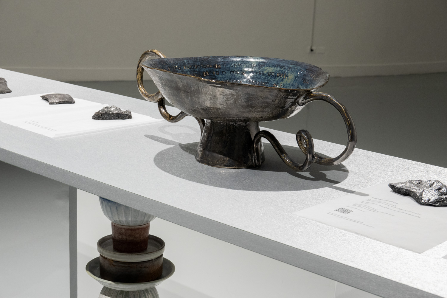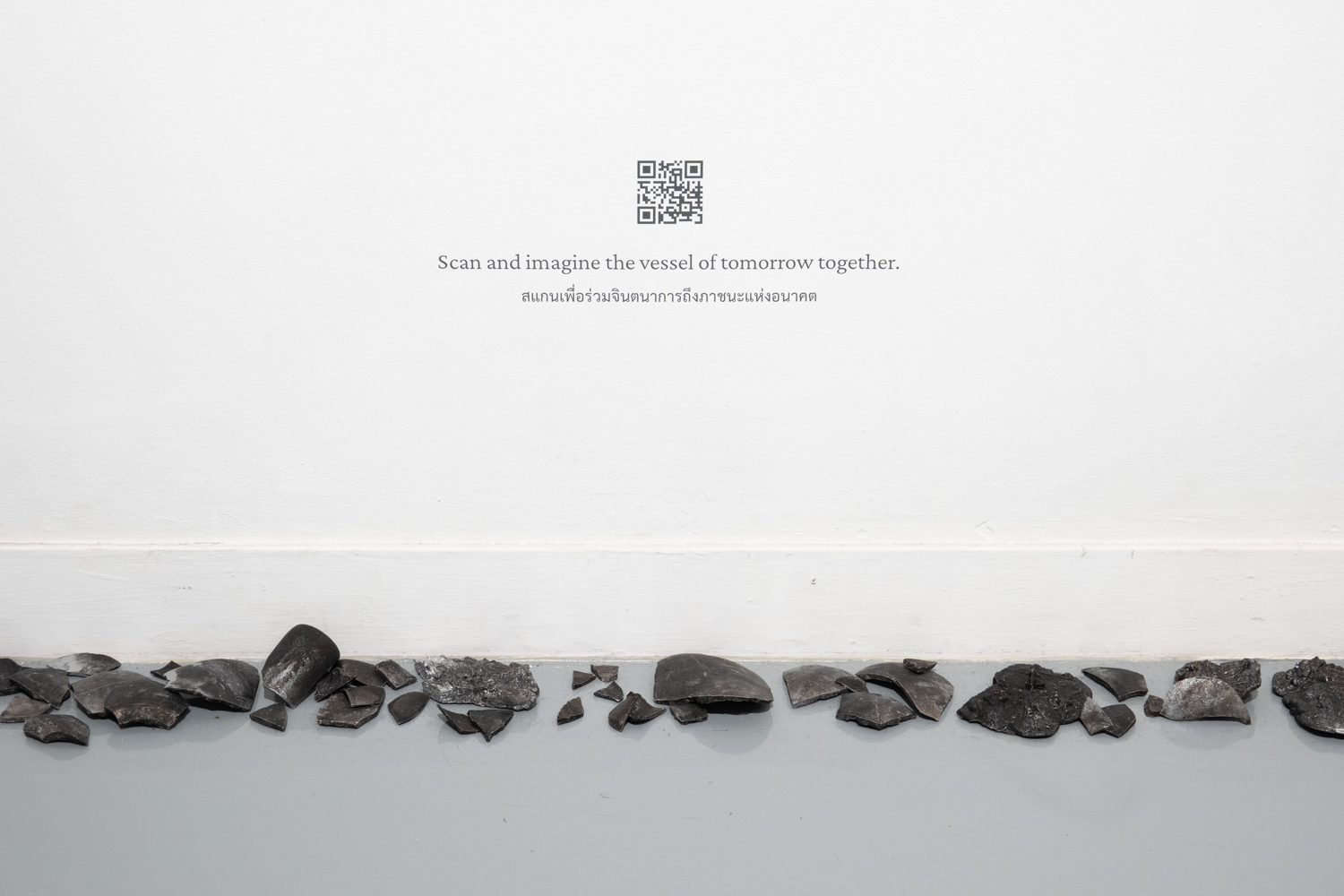 ถ้าว่ากันที่โทนสนุก ผลงานชุด ‘Vessel’ (2025) ของ ภาพิมล หล่อตระกูล น่าจะเป็นผลงานที่ใช้จินตนาการบวกกับความสนใจเฉพาะเรื่องออกมาได้สนุกที่สุด ภาพิมลสนใจวัตถุอย่าง ‘ภาชนะ’ ในแง่ที่มันเป็นของใช้พื้นฐานในชีวิตประจำวันของมนุษย์และเป็นสิ่งของที่บอกเล่าประวัติศาสตร์ของมนุษย์ในทุกอารยธรรม ในขณะเดียวกัน ภาชนะยังเป็นสัญลักษณ์สื่อถึงความหมายต่างๆ ในหลากหลายวัฒนธรรม รวมทั้งในความเห็นของศิลปิน ภาชนะคือตัวแทนของความต้องการเติมเต็มความรู้สึกที่ขาดหายไปของมนุษย์ ในผลงานชุดนี้ ภาพิมลสร้างภาชนะขึ้นมา 6 ชิ้น โดยแต่ละชิ้นมีรูปร่างหน้าตาและลูกเล่นที่แตกต่างกันไป (เช่น ชิ้นหนึ่งสั่นได้ด้วย) ภาชนะทั้ง 6 มาพร้อม 6 เรื่องราวจากจินตนาการของเธอถึงโลกอนาคตที่ออกไปในแนวดิสโทเปีย เช่น อนาคตที่เอเลียนบุกมาครองโลกและมนุษย์กลายเป็นแค่แรงงานที่ไม่มีความทรงจำใดๆ หลงเหลือ อนาคตที่มีฝนกรดตกลงมาตลอดเวลา ไม่มีศิลปะ ไม่มีเสียงเพลง ผู้คนไม่อยากมีลูก ทำให้ผู้มีอำนาจต้องหาทางเพิ่มประชากรขึ้นมาจากการสังเคราะห์วิธีอื่น และโลกอนาคตที่เทคโนโลยีบันทึกความฝันได้และนำมาเป็นข้อมูลขายเพื่อสร้างกำไร ฯลฯ เรื่องที่ถูกแต่งขึ้นมาทั้งหมดนี้แม้จะเสพเป็นความบันเทิงได้สนุก แต่ในอีกมุมหนึ่งก็สะท้อนให้เห็นถึงความสงสัยใคร่รู้ที่ศิลปินมีต่ออนาคตของมนุษยชาติ ในฐานะเจเนอเรชันใหม่อีกคนหนึ่งที่จะเป็นเจ้าของอนาคตนั้น