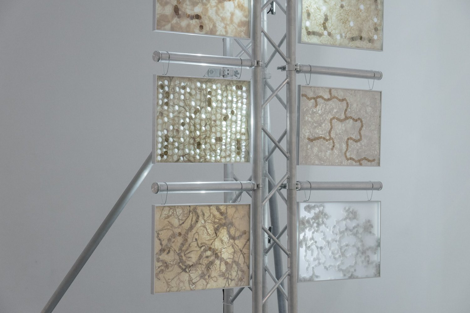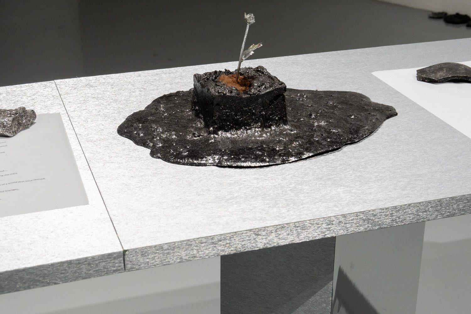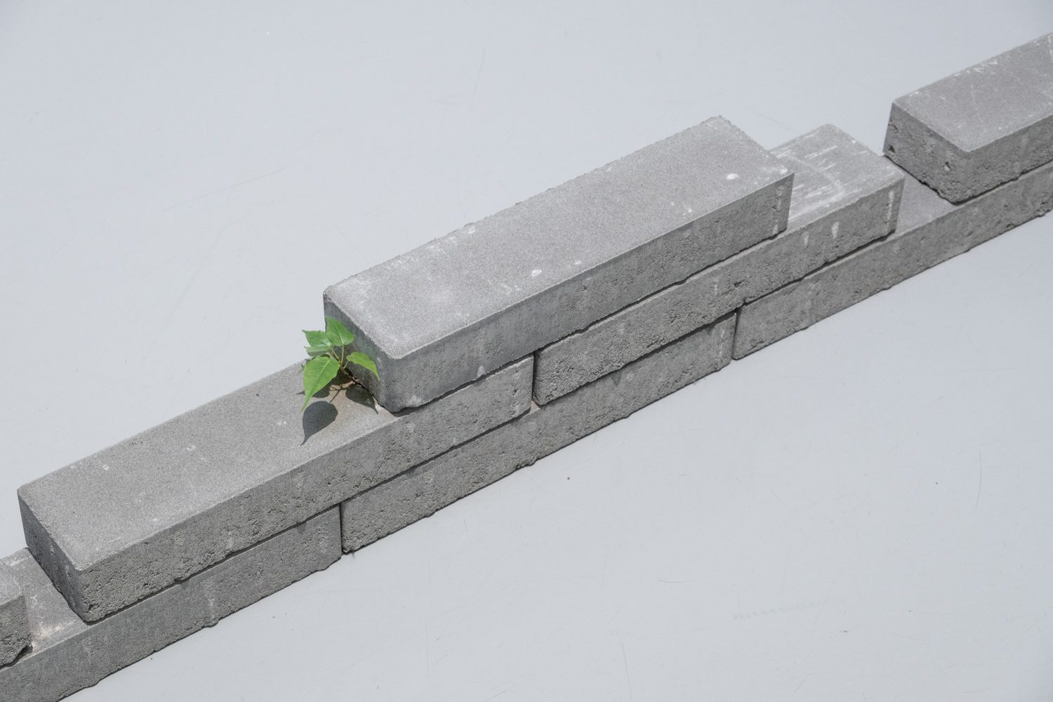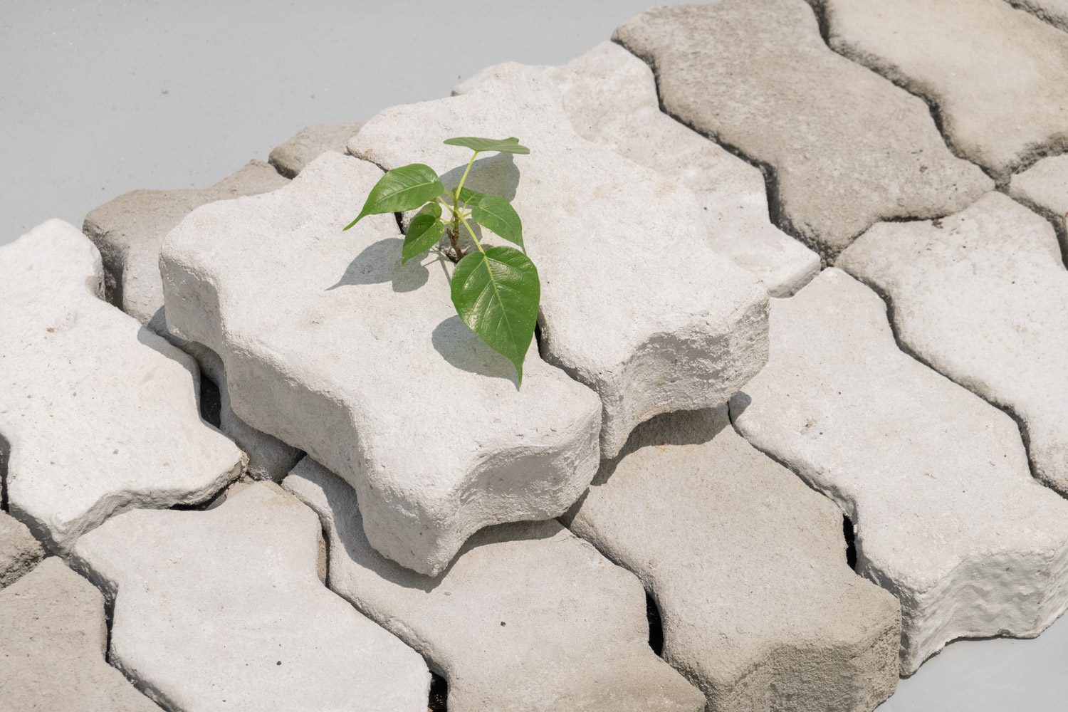 ใกล้กันกับผลงานของยศสุนทรคือ ‘Unexpected Growth’ (2025) โดย อภิสรา ห่อไพศาล ที่พาเราออกห่างจากบรรยากาศสังเคราะห์ของโลกดิจิทัลเข้าสู่ความน้อยและเรียบง่าย ผลงานของเธอประกอบไปด้วยอินสตอลเลชันชิ้นเล็กที่นำก้อนอิฐมาเรียงต่อกัน โดยบางชิ้นมีวัชพืชต้นเล็กงอกออกมา บางชิ้นมีหนังสือปกสีเทาวางอยู่ร่วมกันอย่างกลมกลืน นอกจากนั้น ผลงานอีกส่วนเป็นกระดาษทำจากวัชพืชในกรอบอะคริลิกจัดวางอยู่บนโครงสร้างทรัส โดยกระดาษแต่ละแผ่นปรากฏรูปทรงออแกนิก เหมือนนำเอาพืชหรือสิ่งมีชีวิตมาขยายเซลล์ออกมาเป็นภาพใหญ่ อภิสราเริ่มทำงานชิ้นนี้จากการสังเกตเห็นสิ่งเล็กๆ ที่ถูกมองข้ามในเมืองใหญ่ นั่นคือ วัชพืชที่ขึ้นแทรกอยู่ตามทางเดินที่ปูด้วยก้อนอิฐ และเมื่อเห็นความพยายามที่จะมีชีวิตอยู่ในเมืองที่แห้งแล้งและแข็งกระด้าง เธอจึงนำเอาวัชพืชเหล่านั้นมาทดลองทำเป็นกระดาษ เกิดเป็นกระบวนการทำงานที่มีความหมายและทำให้เธอมองเห็นความเชื่อมโยงของสิ่งรอบข้างมากขึ้น