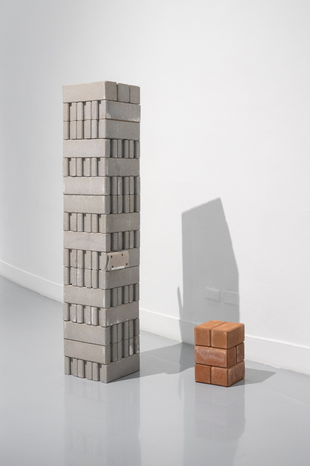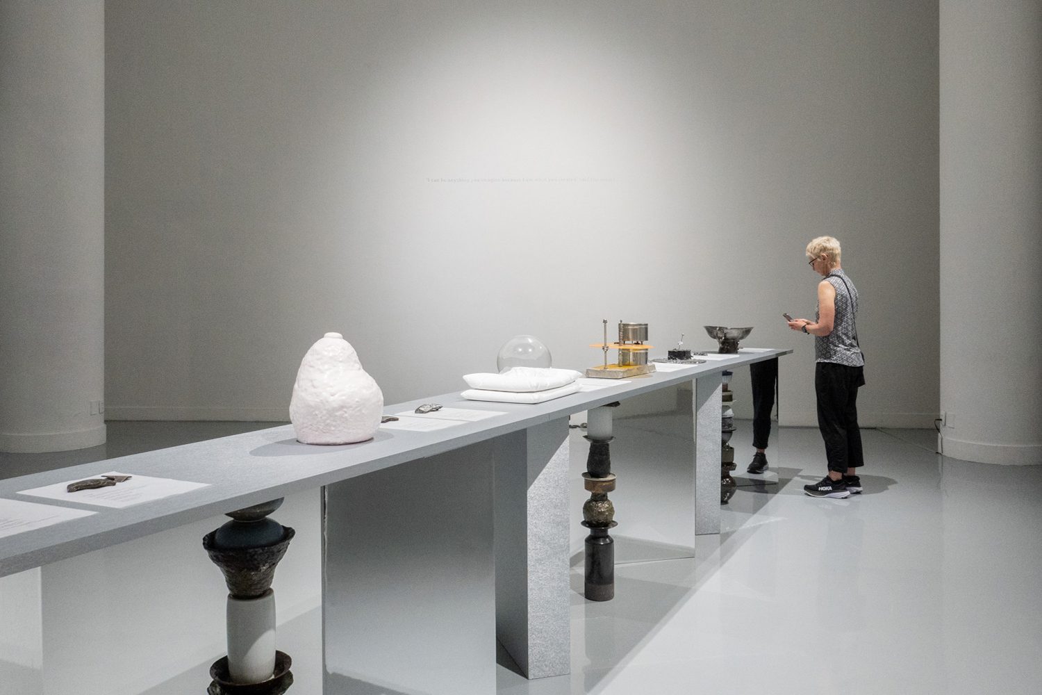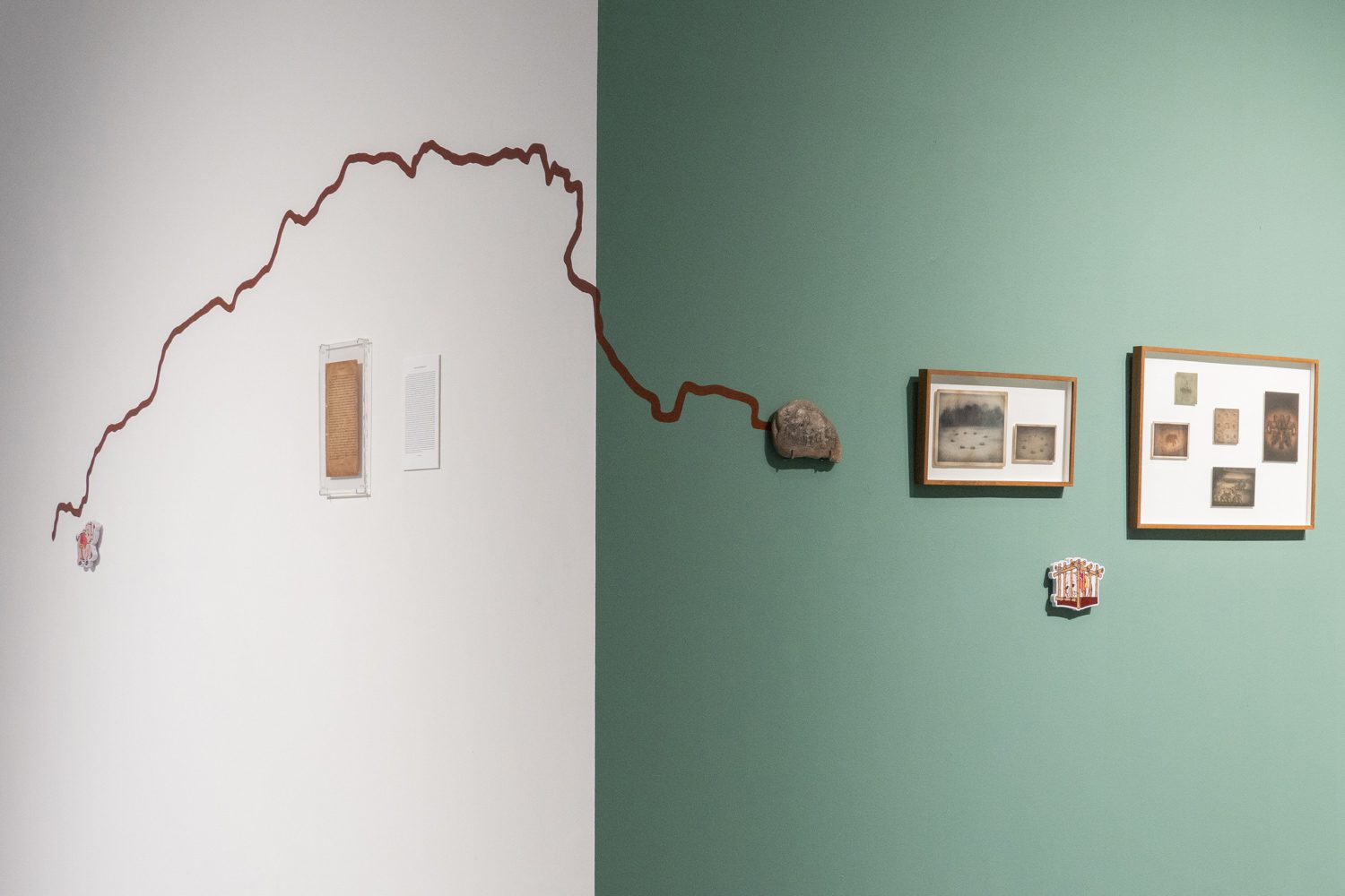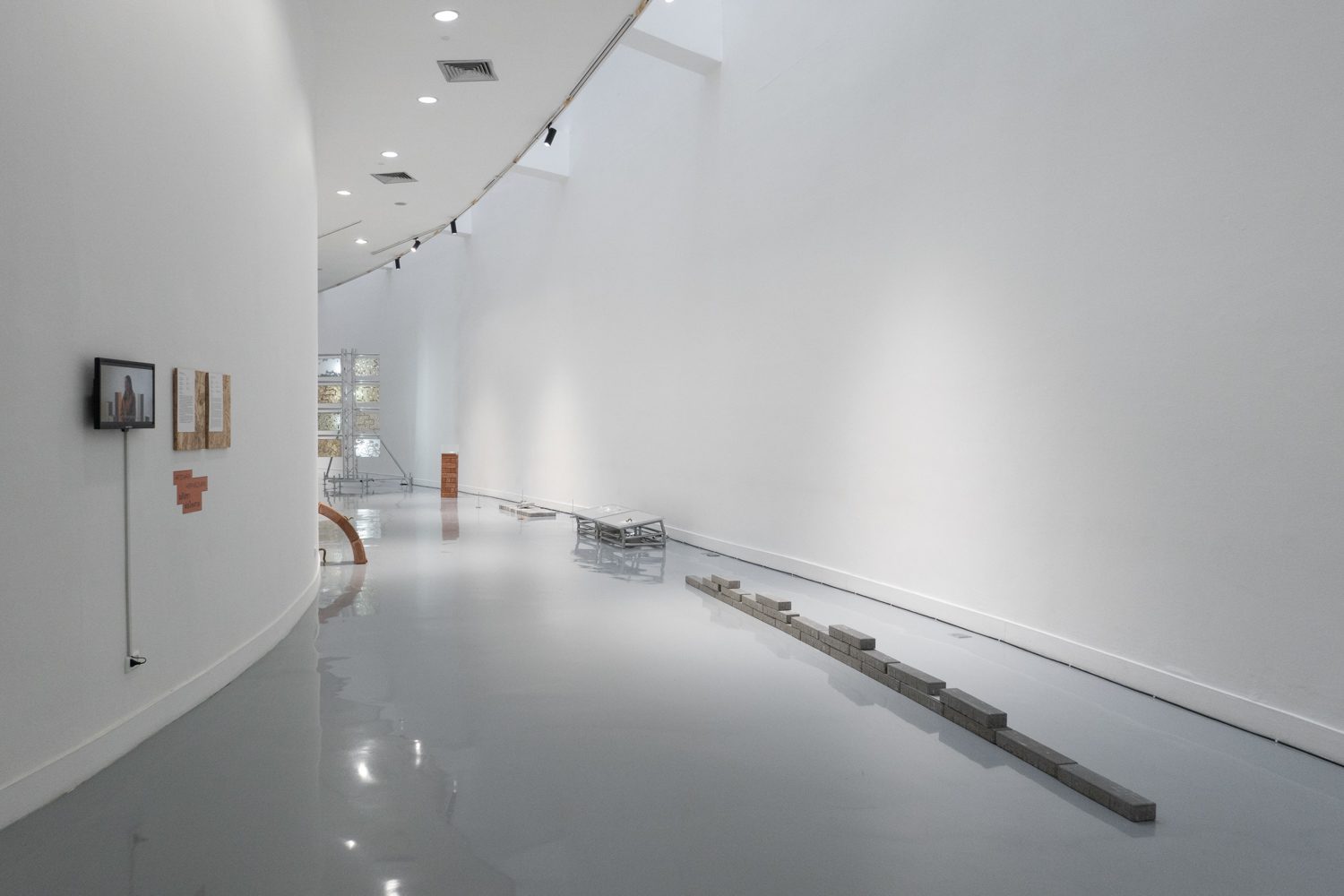 ใกล้กันกับผลงานของยศสุนทรคือ ‘Unexpected Growth’ (2025) โดย อภิสรา ห่อไพศาล ที่พาเราออกห่างจากบรรยากาศสังเคราะห์ของโลกดิจิทัลเข้าสู่ความน้อยและเรียบง่าย ผลงานของเธอประกอบไปด้วยอินสตอลเลชันชิ้นเล็กที่นำก้อนอิฐมาเรียงต่อกัน โดยบางชิ้นมีวัชพืชต้นเล็กงอกออกมา บางชิ้นมีหนังสือปกสีเทาวางอยู่ร่วมกันอย่างกลมกลืน นอกจากนั้น ผลงานอีกส่วนเป็นกระดาษทำจากวัชพืชในกรอบอะคริลิกจัดวางอยู่บนโครงสร้างทรัส โดยกระดาษแต่ละแผ่นปรากฏรูปทรงออแกนิก เหมือนนำเอาพืชหรือสิ่งมีชีวิตมาขยายเซลล์ออกมาเป็นภาพใหญ่ อภิสราเริ่มทำงานชิ้นนี้จากการสังเกตเห็นสิ่งเล็กๆ ที่ถูกมองข้ามในเมืองใหญ่ นั่นคือ วัชพืชที่ขึ้นแทรกอยู่ตามทางเดินที่ปูด้วยก้อนอิฐ และเมื่อเห็นความพยายามที่จะมีชีวิตอยู่ในเมืองที่แห้งแล้งและแข็งกระด้าง เธอจึงนำเอาวัชพืชเหล่านั้นมาทดลองทำเป็นกระดาษ เกิดเป็นกระบวนการทำงานที่มีความหมายและทำให้เธอมองเห็นความเชื่อมโยงของสิ่งรอบข้างมากขึ้น