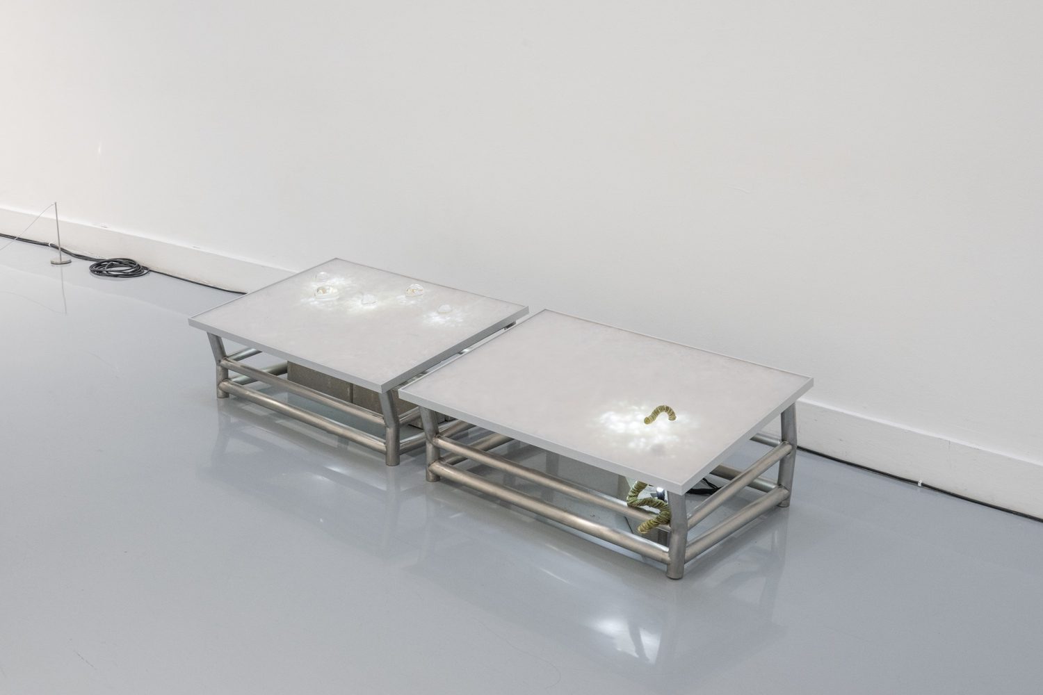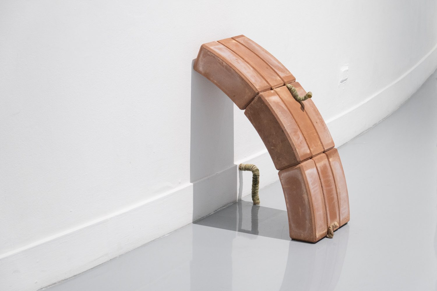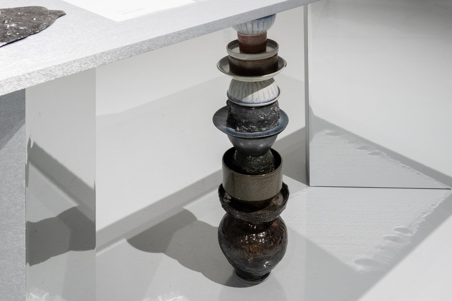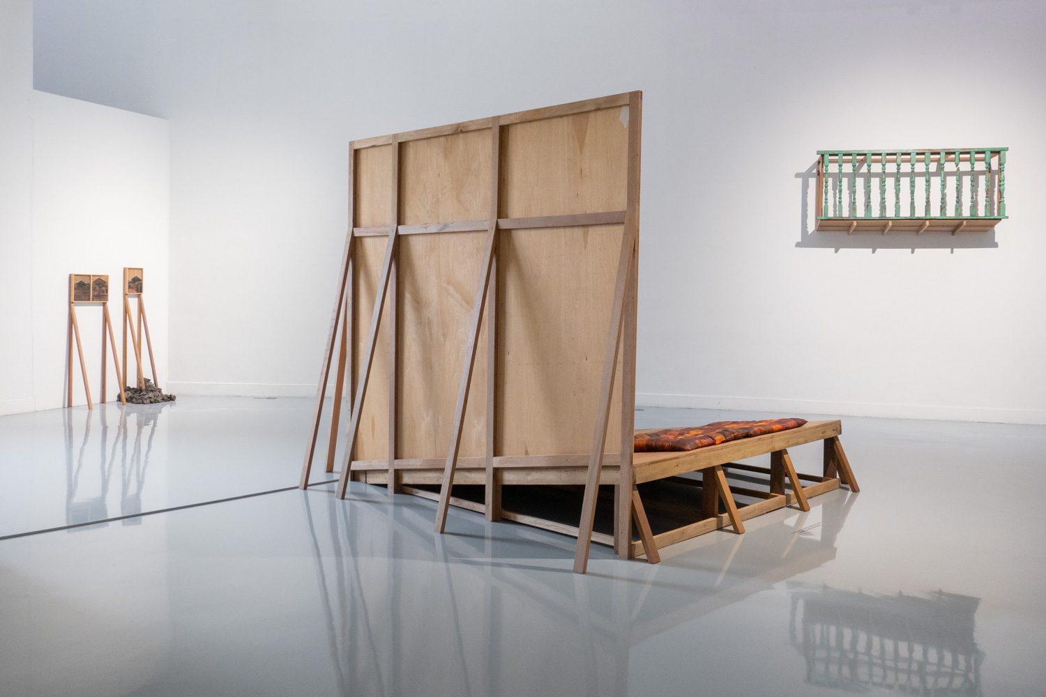 ใกล้กันกับผลงานของยศสุนทรคือ ‘Unexpected Growth’ (2025) โดย อภิสรา ห่อไพศาล ที่พาเราออกห่างจากบรรยากาศสังเคราะห์ของโลกดิจิทัลเข้าสู่ความน้อยและเรียบง่าย ผลงานของเธอประกอบไปด้วยอินสตอลเลชันชิ้นเล็กที่นำก้อนอิฐมาเรียงต่อกัน โดยบางชิ้นมีวัชพืชต้นเล็กงอกออกมา บางชิ้นมีหนังสือปกสีเทาวางอยู่ร่วมกันอย่างกลมกลืน นอกจากนั้น ผลงานอีกส่วนเป็นกระดาษทำจากวัชพืชในกรอบอะคริลิกจัดวางอยู่บนโครงสร้างทรัส โดยกระดาษแต่ละแผ่นปรากฏรูปทรงออแกนิก เหมือนนำเอาพืชหรือสิ่งมีชีวิตมาขยายเซลล์ออกมาเป็นภาพใหญ่ อภิสราเริ่มทำงานชิ้นนี้จากการสังเกตเห็นสิ่งเล็กๆ ที่ถูกมองข้ามในเมืองใหญ่ นั่นคือ วัชพืชที่ขึ้นแทรกอยู่ตามทางเดินที่ปูด้วยก้อนอิฐ และเมื่อเห็นความพยายามที่จะมีชีวิตอยู่ในเมืองที่แห้งแล้งและแข็งกระด้าง เธอจึงนำเอาวัชพืชเหล่านั้นมาทดลองทำเป็นกระดาษ เกิดเป็นกระบวนการทำงานที่มีความหมายและทำให้เธอมองเห็นความเชื่อมโยงของสิ่งรอบข้างมากขึ้น