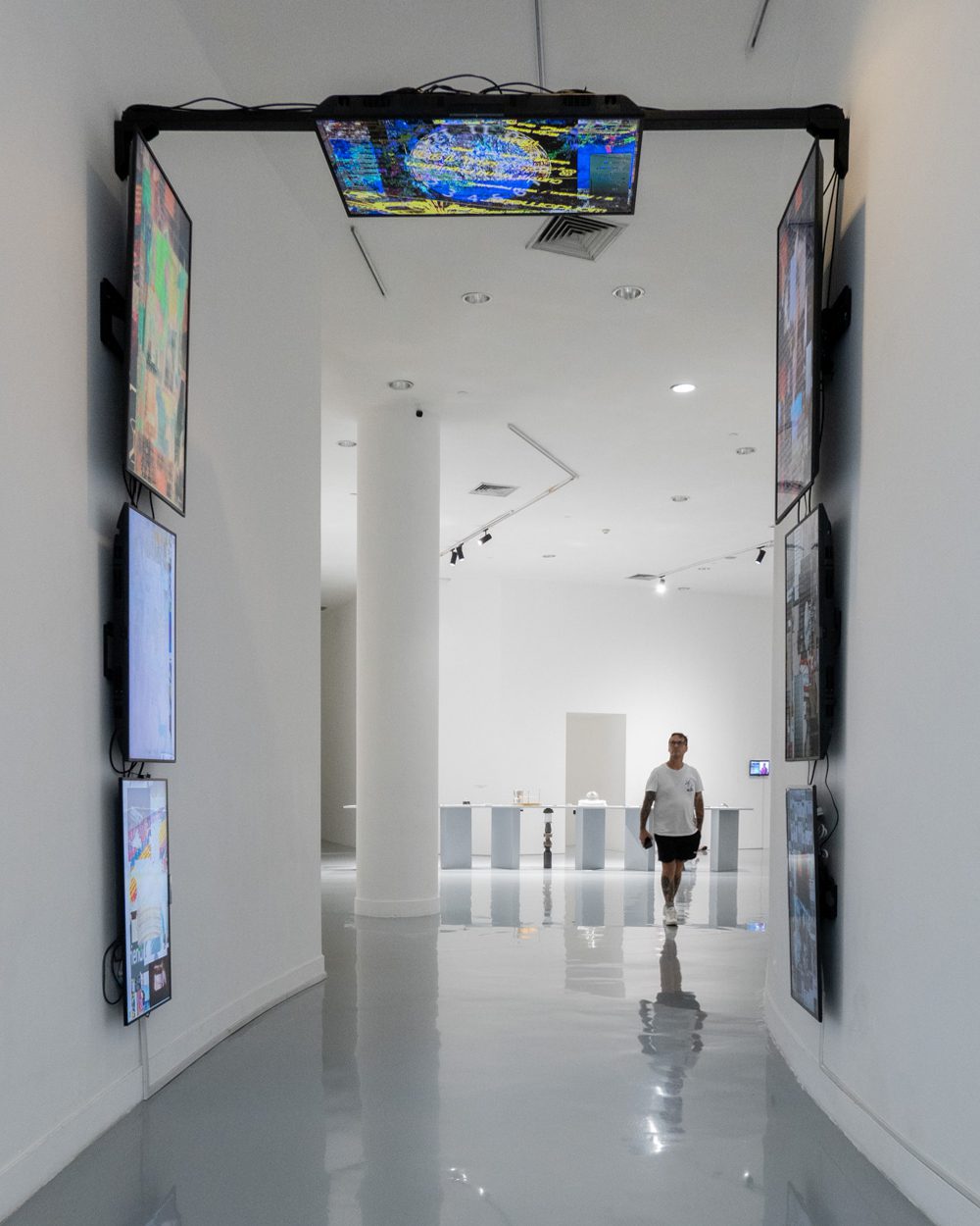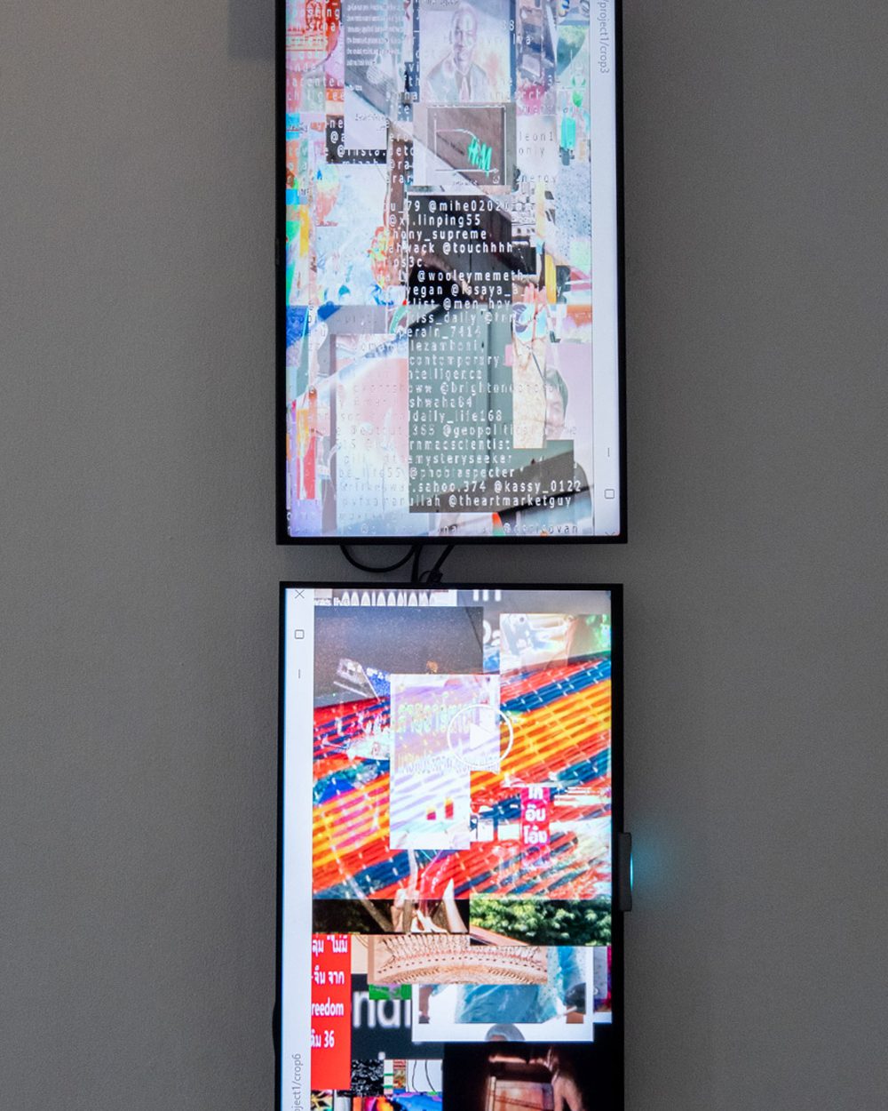 ยศสุนทร รัตตประดิษฐ์ เป็นอีกคนที่ตั้งคำถามเกี่ยวกับการสื่อสารยุคดิจิทัลที่ส่งผลกระทบต่อความคิดและพฤติกรรมของคนในสังคม ประติมากรรมวิดีโอแบบไม่เล่าเรื่อง ‘Hyperlink Inter Me’ (2025) ของเขา ประกอบไปด้วยจอทีวีหลายจอที่เรียงต่อกันเป็นเหมือนซุ้มประตูโค้ง โดยภาพบนหน้าจอที่มีตัวอักษร ตัวเลข มีภาพ แต่ไม่มีเรื่องราวก็คล้ายเนื้อหาในโซเชียลมีเดียทุกวันนี้ที่ไม่ได้เน้นสาระ แต่เป็นการก่อให้เกิดผลทางอารมณ์ระยะสั้น นอกจากนั้น เมื่อผู้ชมเดินผ่านซุ้มประตูโค้ง ก็ให้ความรู้สึกเหมือนว่ากำลังเดินผ่านอุโมงค์ MRI ที่จะประมวลผลสร้างเป็นภาพอวัยวะภายในของเรา แต่สำหรับอุโมงค์จอทีวีของยศสุนทรนี้คือ algorithm ที่ประมวลผลลัพธ์ออกมาจากข้อมูลที่เราเลือกบริโภคผ่านสื่อออนไลน์ และสุดท้ายพฤติกรรมการใช้สื่อออนไลน์ของเราก็กลายเป็นข้อมูลที่มีมูลค่าทางการตลาด