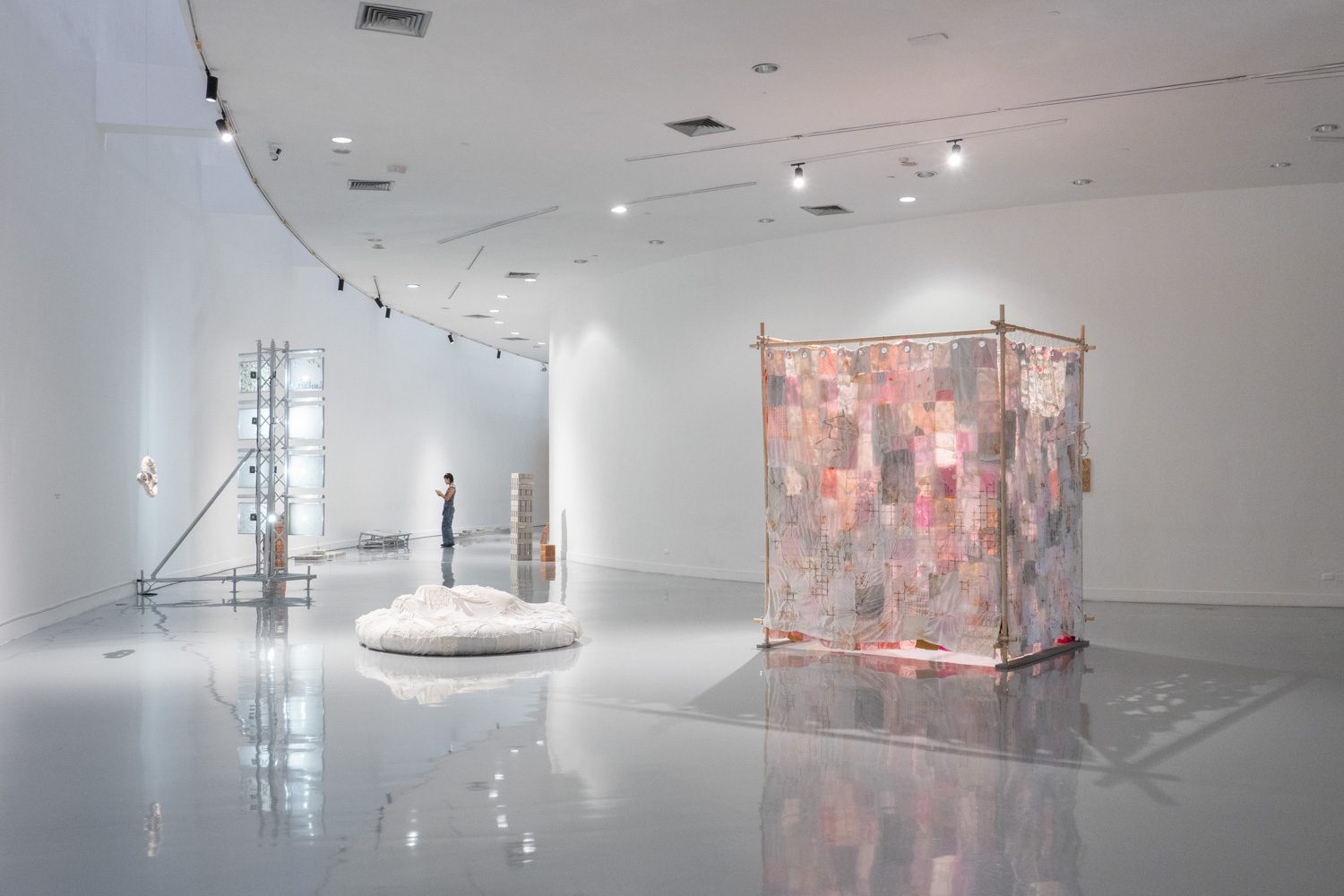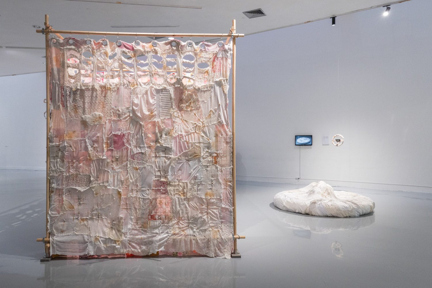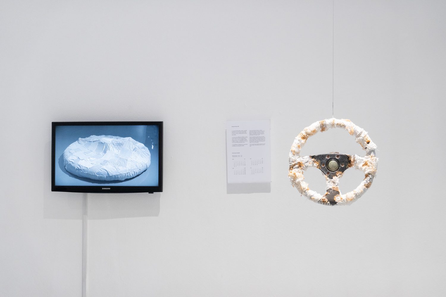 นอกจากผลงาน visual arts แล้ว ใน EYP ปีนี้ ยังมีการแสดงสดรวมอยู่ด้วย ‘Things left to forget’ (2025) คือ ผลงานของ พิชชาภา หวังประเสริฐกุล ที่ประกอบไปด้วยข้าวของหลายชิ้น เช่น หมอน ตะปู ไม้แขวนเสื้อ พวงมาลัยรถ ที่สร้างขึ้นใหม่โดยใช้งานผ้าโทนสีอ่อนหวาน ลูกไม้ และงานถักที่ให้ความรู้สึกอ่อนโยน ข้าวของเหล่านี้ล้วนเกี่ยวข้องกับความรุนแรงในครอบครัวที่ศิลปินเคยประสบ และยังส่งผลกระทบต่อจิตใจและร่างกายของเธอต่อเนื่องมาอีกหลายปีถัดจากนั้น โดยหมอนที่เธอใช้ประกอบการแสดงนั้น ถูกขยายขนาดให้ใหญ่ขึ้นเพื่อสื่อถึงผลกระทบของความรุนแรงที่มากกว่าที่คนในครอบครัวของเธอหรือใครๆ อาจเคยคาดคิด ในขณะเดียวกัน การที่เธอเลือกใช้วัสดุผ้าในโทนสีอ่อนหวานห่อหุ้มวัตถุเหล่านั้นไว้ก็เป็นเสมือนการป้องกันไม่ให้พวกมันสามารถสร้างอันตรายต่อเธอได้อีก