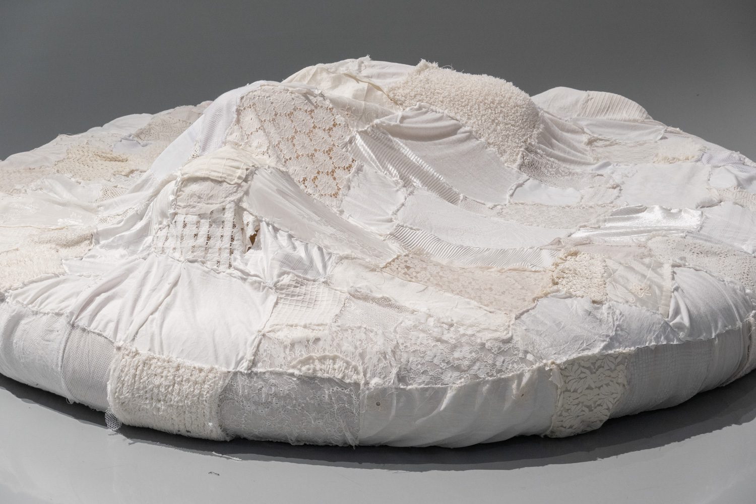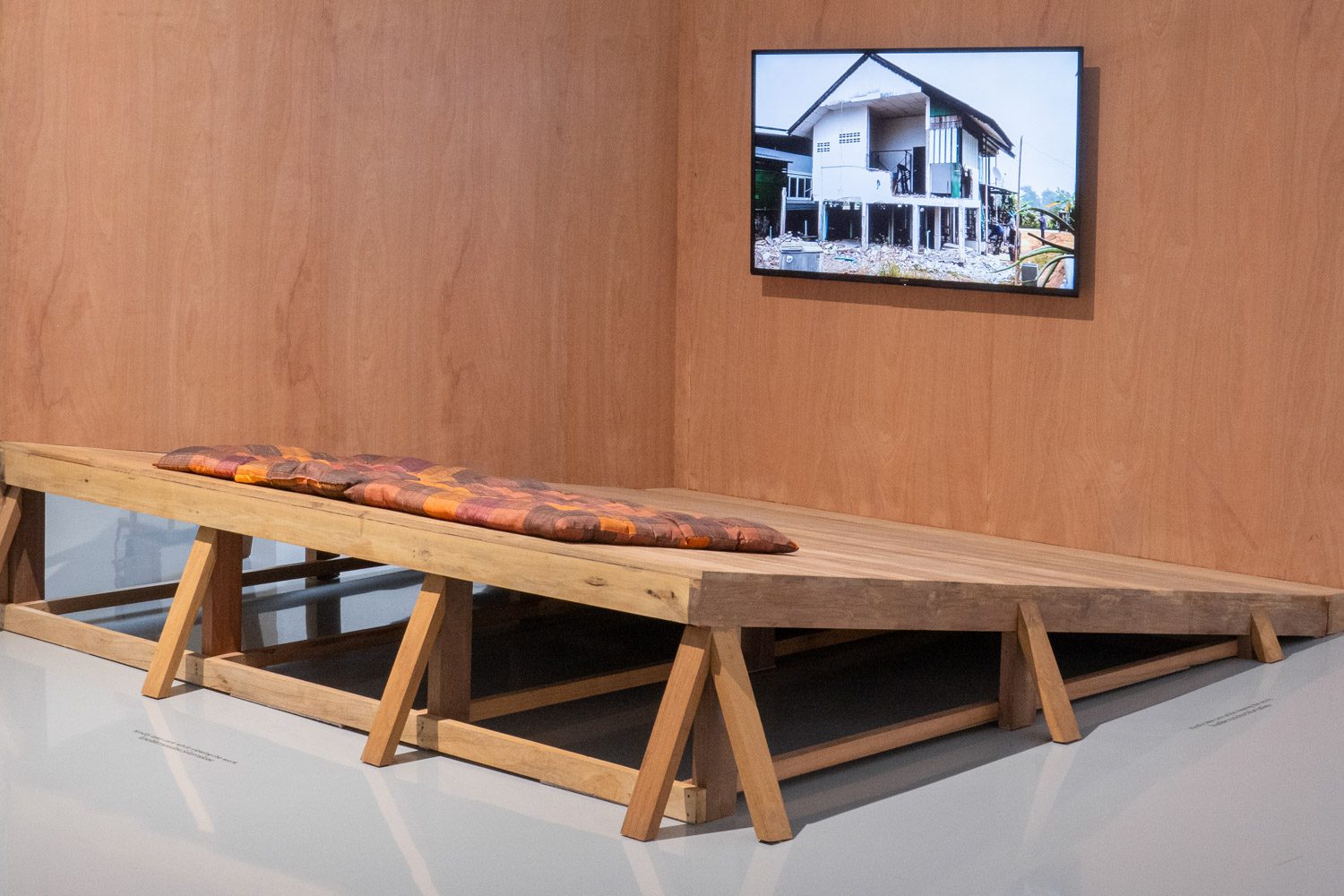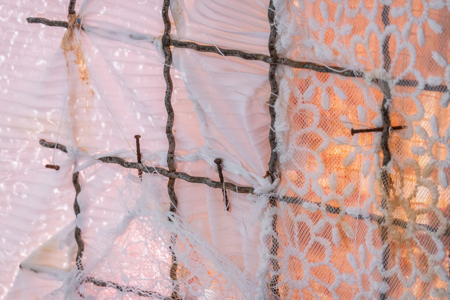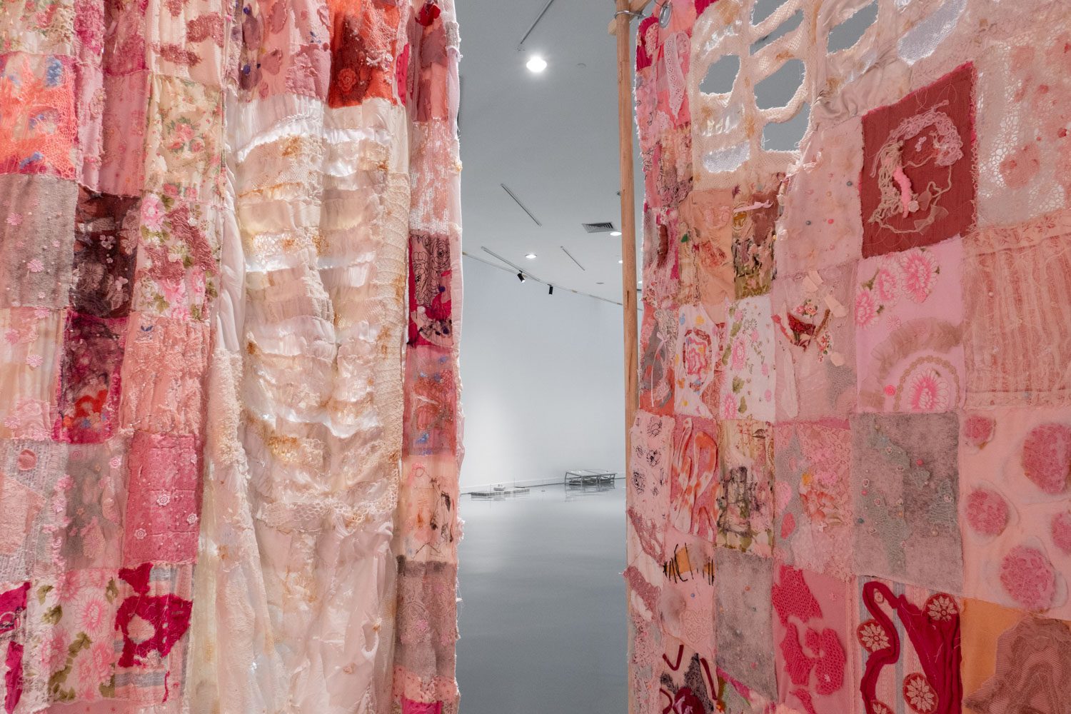 นอกจากผลงาน visual arts แล้ว ใน EYP ปีนี้ ยังมีการแสดงสดรวมอยู่ด้วย ‘Things left to forget’ (2025) คือ ผลงานของ พิชชาภา หวังประเสริฐกุล ที่ประกอบไปด้วยข้าวของหลายชิ้น เช่น หมอน ตะปู ไม้แขวนเสื้อ พวงมาลัยรถ ที่สร้างขึ้นใหม่โดยใช้งานผ้าโทนสีอ่อนหวาน ลูกไม้ และงานถักที่ให้ความรู้สึกอ่อนโยน ข้าวของเหล่านี้ล้วนเกี่ยวข้องกับความรุนแรงในครอบครัวที่ศิลปินเคยประสบ และยังส่งผลกระทบต่อจิตใจและร่างกายของเธอต่อเนื่องมาอีกหลายปีถัดจากนั้น โดยหมอนที่เธอใช้ประกอบการแสดงนั้น ถูกขยายขนาดให้ใหญ่ขึ้นเพื่อสื่อถึงผลกระทบของความรุนแรงที่มากกว่าที่คนในครอบครัวของเธอหรือใครๆ อาจเคยคาดคิด ในขณะเดียวกัน การที่เธอเลือกใช้วัสดุผ้าในโทนสีอ่อนหวานห่อหุ้มวัตถุเหล่านั้นไว้ก็เป็นเสมือนการป้องกันไม่ให้พวกมันสามารถสร้างอันตรายต่อเธอได้อีก