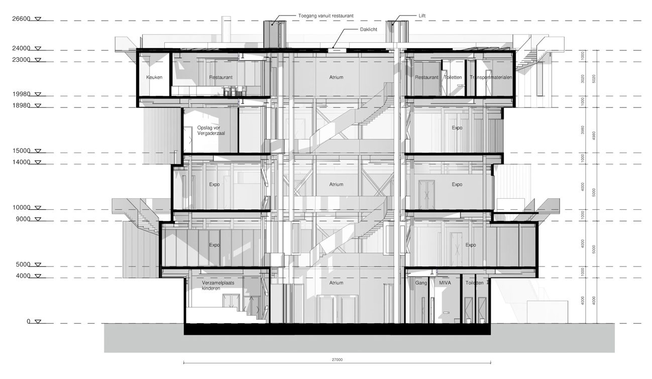 และ MVRDV เองก็ได้กลายมาเป็นผู้ชนะการประกวดแบบในครั้งนี้ ด้วยอาคารก้อนสี่เหลี่ยมห้าก้อนวางซ้อนหมุนเยื้องกัน ราวกับตู้คอนเทนเนอร์ไม่มีผิด พร้อมด้วยบันไดสีแดงที่พันร้อยโดยรอบ เป็นสถาปัตยกรรมที่มีรูปทรงโดดเด่น แฝงด้วยสีสันและองค์ประกอบสนุกสนาน ไม่ต่างจากงานออกแบบหลายๆ งานที่ผ่านมาของ MVRDV ผนังอาคารแต่ละชั้นจะมีบานหน้าต่างขนาดใหญ่ มุมหมุนของก้อนอาคารแต่ละชั้นที่ต่างกัน ช่วยให้บานหน้าต่างเปิดทิวทัศน์ออกไปหาองค์ประกอบในท่าเรือที่สอดคล้องกับเนื้อหานิทรรศการข้างใน