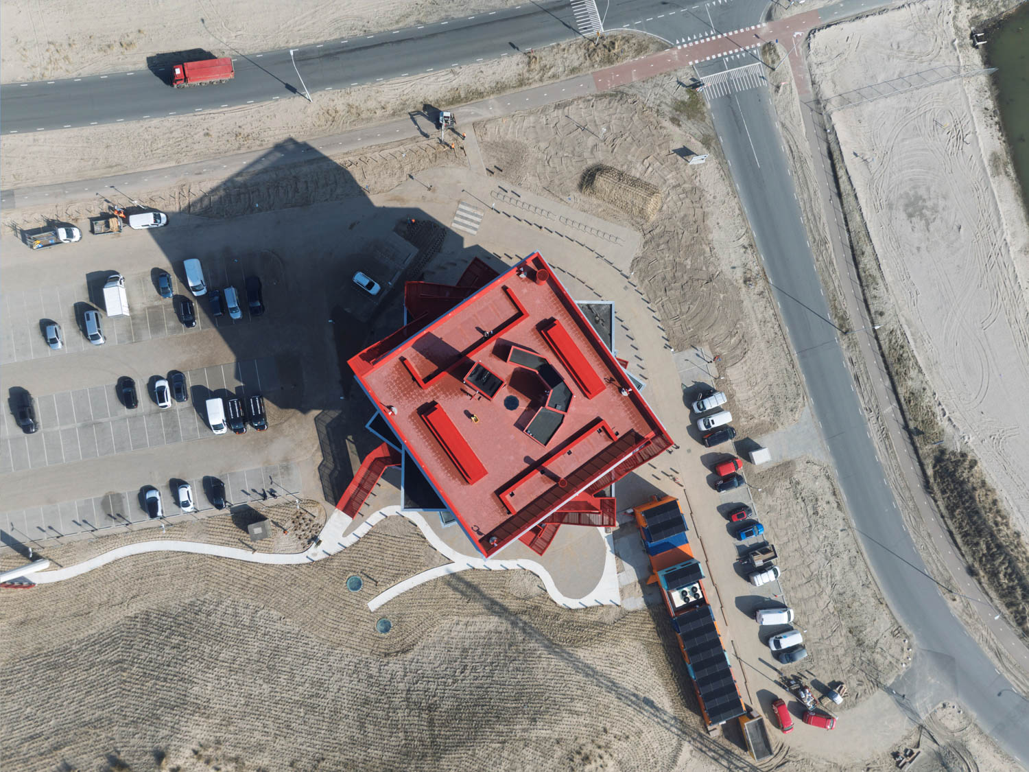 วัสดุของอาคารเป็นวัสดุอุตสาหกรรมที่เรียบง่าย ตอบรับกับเป้าหมายด้านความยั่งยืนของท่าเรือ อาคารกรุด้วยแผ่น Sandwich Panel ที่ทนทานต่อสภาพอากาศริมทะเล สีเงินอันเจิดจ้ายังทำให้อาคารเปล่งประกายท่ามกลางชายหาดกว้างใหญ่เวิ้งว้าง แผ่น facade รวมถึงโครงสร้างสามารถถอดออกและนำไปใช้ใหม่ได้เมื่ออาคารรื้อถอนลง ระบบทำความร้อนและฉนวนที่มีประสิทธิภาพช่วยลดการใช้พลังงานภายใน เมื่อประกอบการติดตั้งกังหันลมและแผ่นโซลาร์เซลล์ 266 แผ่นเพิ่มเติม อาคารก็สามารถสร้างพลังงานได้มากกว่าที่ใช้ถึง 30%