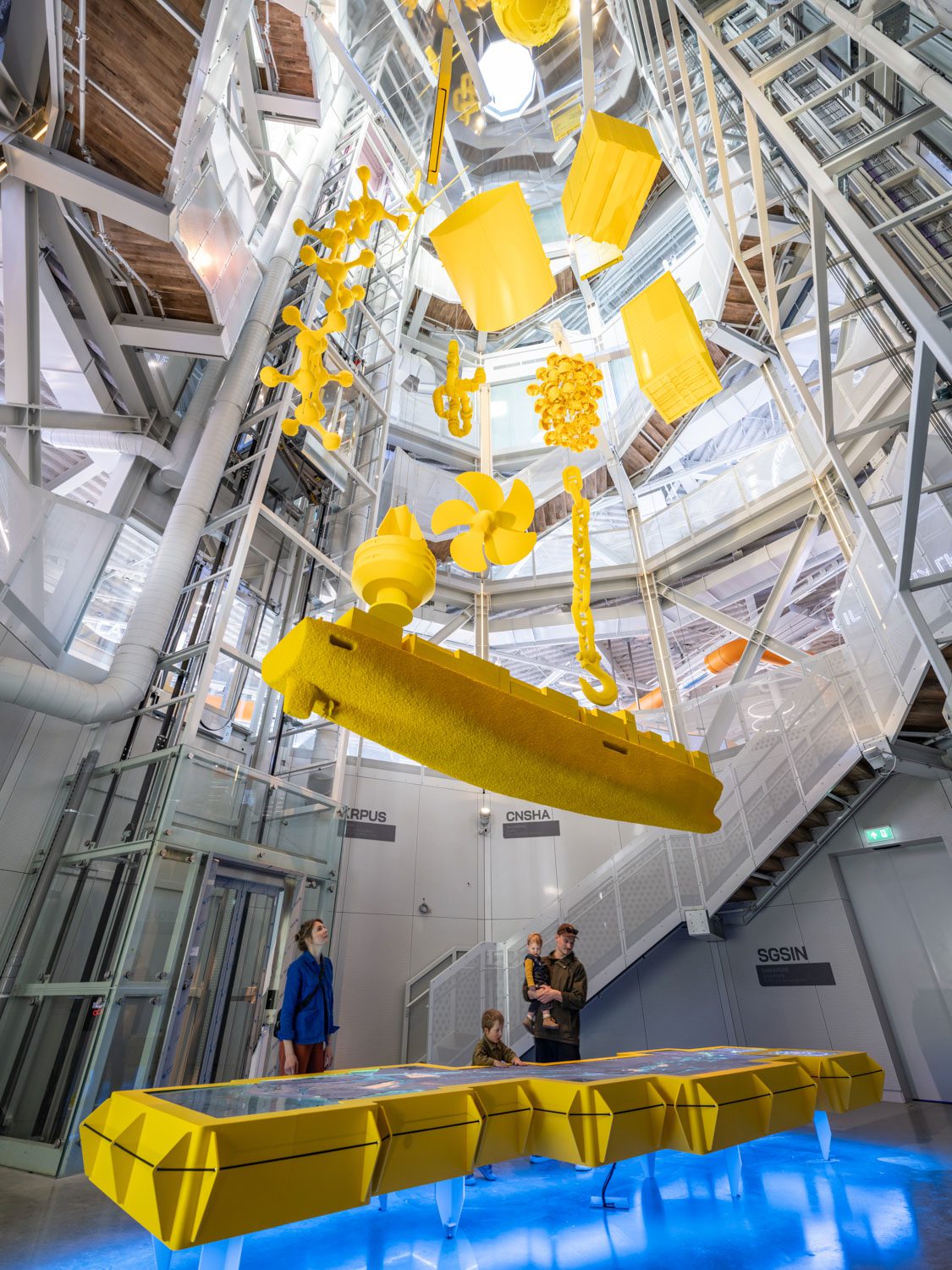 โครงสร้างของอาคารด้านในเช่นคานเหล็ก ท่อแอร์ ท้องพื้น ถูกเผยให้เห็นอย่างหมดจดในพื้นที่ภายใน เป็นฉากหลังให้องค์ประกอบสีสันสดใสที่เป็นส่วนหนึ่งของนิทรรศการ ในชั้นแรกของอาคารคือเอเทรียมกลางสูงกว่า 22 เมตรและประติมากรรมเด่นตรงกลางที่นำชิ้นส่วนจำลองของเรือมาย้อมสีเหลืองอ๋อย ชิ้นส่วนเคลื่อนตัวขึ้นลงเล่นไปมาอย่างสนุกสนาน สร้างผลลัพธ์ประติมากรรมที่แตกต่างกันไปแต่แต่ละช่วงเวลาของวัน ในชั้นเดียวกันยังเป็นคาเฟ่ ที่รับวิวเนินทรายอันใกล้ชิดด้านนอกแบบพาโนรามาผ่านบานกระจกใส