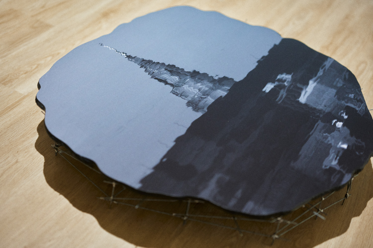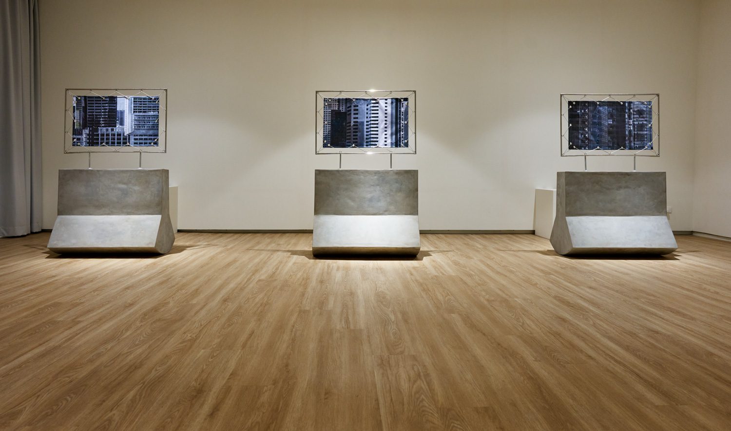 ด้านข้างถนน จัดแสดงแบริเออร์ 3 อันที่แกว่งไขวไปมา ด้านบนแบริเออร์มีภาพถ่ายอาคารคอนโดมิเนียม และอาคารสำนักงานติดขึงไว้ ภาพตึกสูงระฟ้าเบียดตัวกันหนาแน่น ถ่ายจากระดับความสูงของสวนดาดฟ้า บนอาคารสามย่านมิตรทาวน์ใจกลางเมือง สัญลักษณ์ของความเจริญก้าวหน้า และโลกอนาคต กลับกลายเป็นเพียงสิ่งล่องลอย ไร้น้ำหนัก จับต้องไม่ได้ เพราะรากฐานไม่มั่นคง โอนเอน แบริเออร์ที่ควรจะหนักแน่น กลับเบาหวิว เช่นเดียวกับก้อนรอยแตกร้าวบนถนน แบริเออร์ที่โยกเยกไปมา ส่อนัยถึงการเคลื่อนไหว แต่กลับไม่ได้ขยับไปไหนเลย