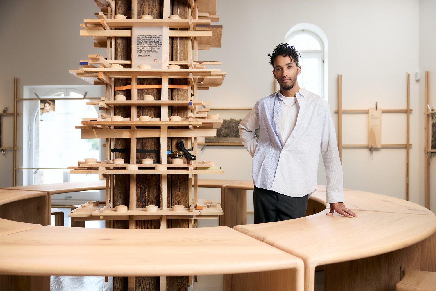 นักออกแบบจากลอนดอนอย่าง Andu Masebo นั้นให้ความสนใจกับสิ่งที่มนุษย์เราสร้าง วิธีที่สร้าง รวมถึงกลไกแวดล้อมที่สิ่งๆ นั้นจะเข้าไปเป็นส่วนหนึ่งเมื่อถูกสร้างขึ้นมาแล้ว สำหรับ ‘No.1 Common’ นี้ Masebo ได้ออกแบบชุดโต๊ะที่ใช้ส่วนโค้ง 1 ใน 8 ของวงกลมมาสร้างสรรค์ โดยการจัดวางของพวกมันจะถูกเปลี่ยนแปลงไปตลอดระยะเวลา 3 วันที่จัดงาน