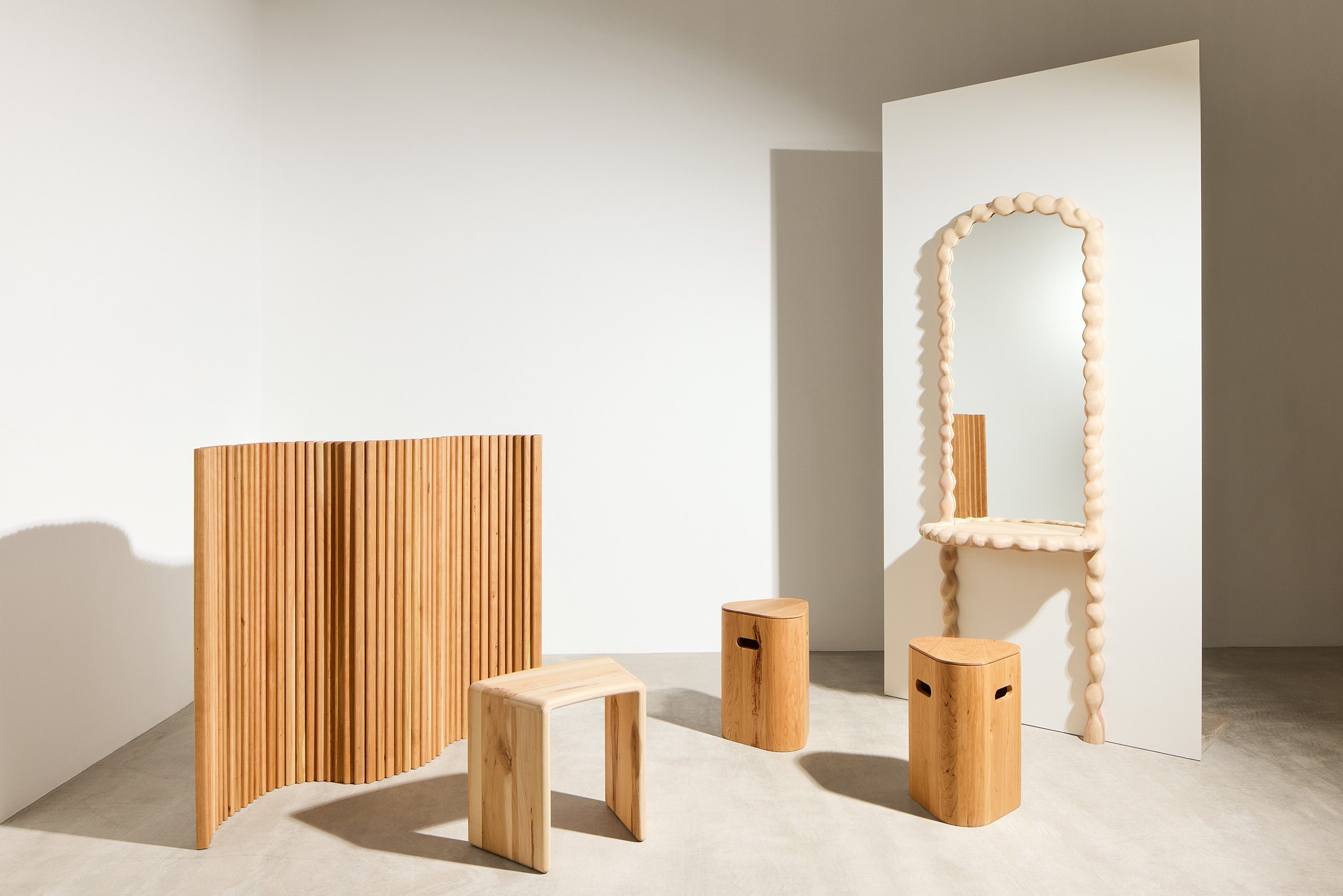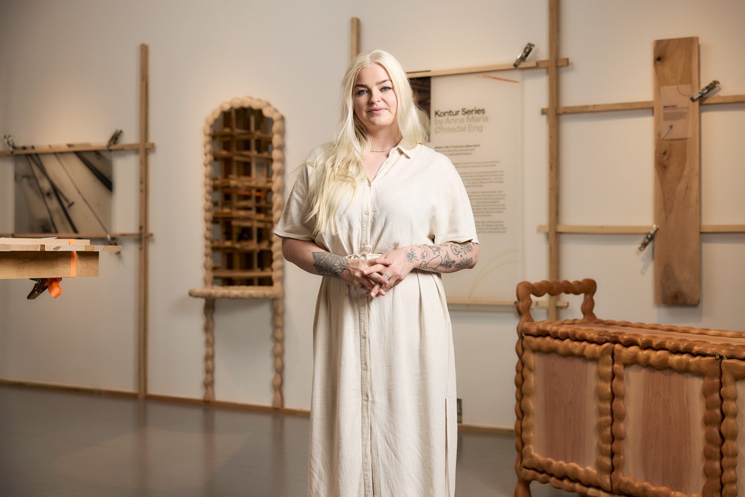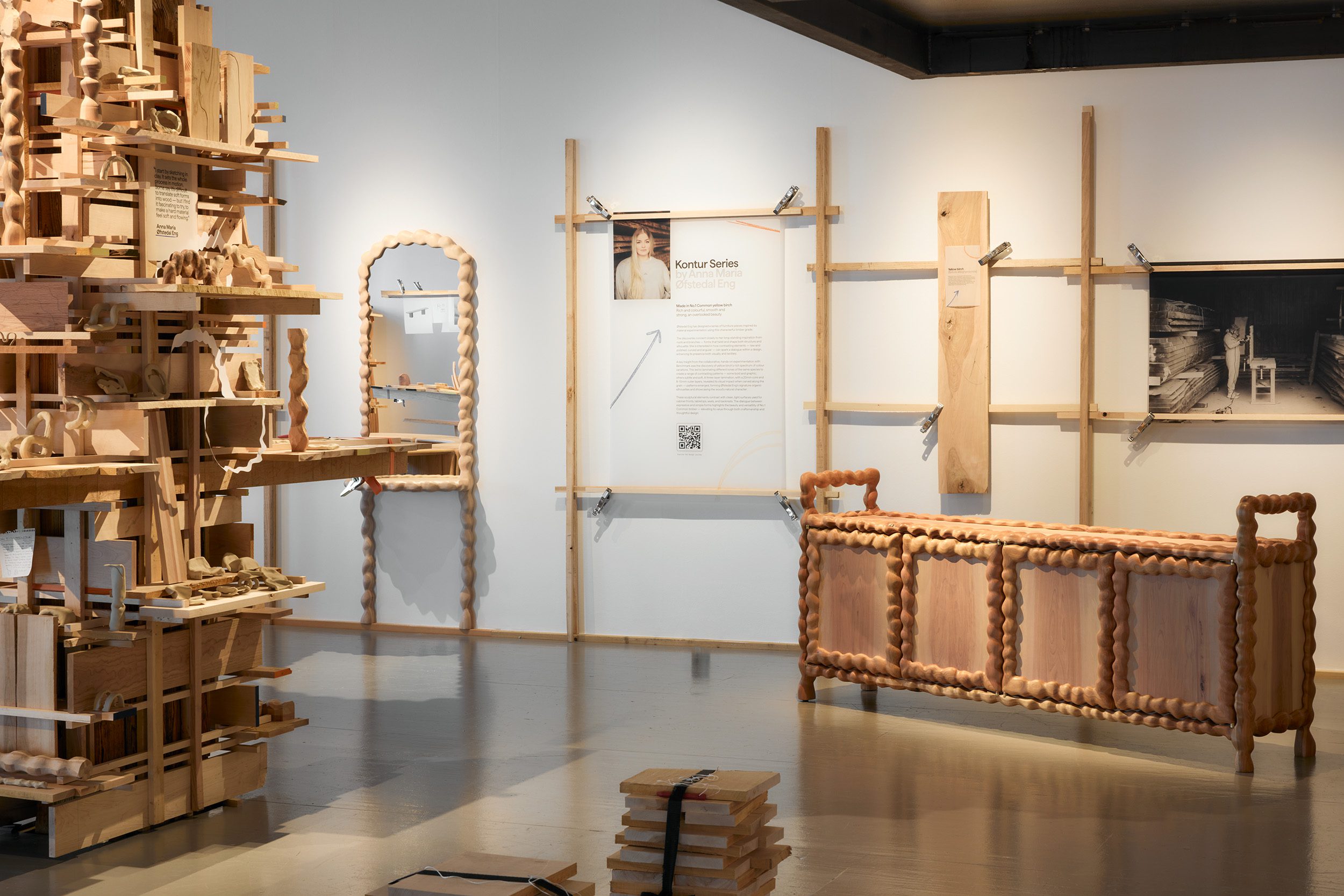 Anna Maria Øfstedal Eng เคารพในสิ่งที่เกิดจากฝีมือของผู้สร้างระหว่างกระบวนการสร้างผลงานเสมอ เธอยกย่อง ‘ความไม่สมบูรณ์แบบ’ เสมือนสัญลักษณ์ของความตรงไปตรงมาและความโปร่งใส Øfstedal Eng ออกแบบตู้และกระจกติดผนังที่ได้รับแรงบันดาลใจจากการทดลองกับวัสดุอย่างไม้ yellow birch ซึ่งเต็มไปด้วยความเฉพาะตัว เริ่มต้นด้วยแรงบันดาลใจจากรากและกิ่งก้านที่เธอสนใจมาเป็นระยะเวลานาน ฟอร์มที่บิดไปมานี้ก่อตัวเป็นทั้งโครงสร้างและโครงร่างของเฟอร์นิเจอร์ สีสันที่หลากหลายของไม้ชนิดนี้ยังนำไปสู่การทำ laminate ไม้ชนิดเดียวกันเพื่อแสดงโทนและลวดลายที่แตกต่างกันออกมาเป็นแพทเทิร์น