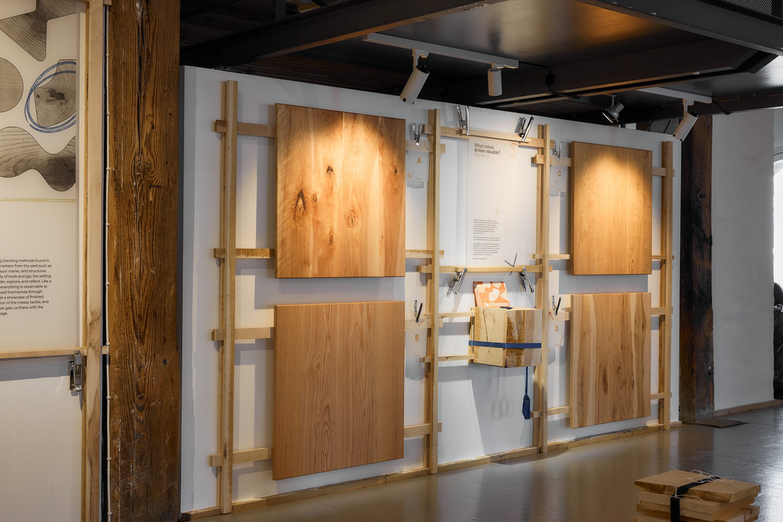 ในนิทรรศการนี้ AHEC ได้ทำงานร่วมกับ Benchmark ผู้ผลิตเฟอร์นิเจอร์แถวหน้าของอังกฤษ เพื่อแสดงศักยภาพของไม้ No.1C โดยได้ว่าจ้างนักออกแบบ 3 คน ได้แก่ Andu Masebo ซึ่งทำงานโดยยึดความเรียบง่าย ความสามารถในการเข้าถึงผู้ใช้งาน และการเลือกใช้วัสดุเป็นหลัก Daniel Schofield ซึ่งมีพื้นเพด้านการออกแบบกราฟิกและฝีมือในฐานะช่างไม้ และ Anna Maria Øfstedal Eng ผู้สนใจการหยิบเอา ‘ความย้อนแย้ง’ มาใช้ในการสร้างสรรค์ผลงาน ตัวนิทรรศการ ‘No.1 Common’ เองยังได้รับการออกแบบโดย KUF Studios สตูดิโอของนักออกแบบชาวเดนมาร์กอย่าง Kia Utzon-Frank อีกด้วย