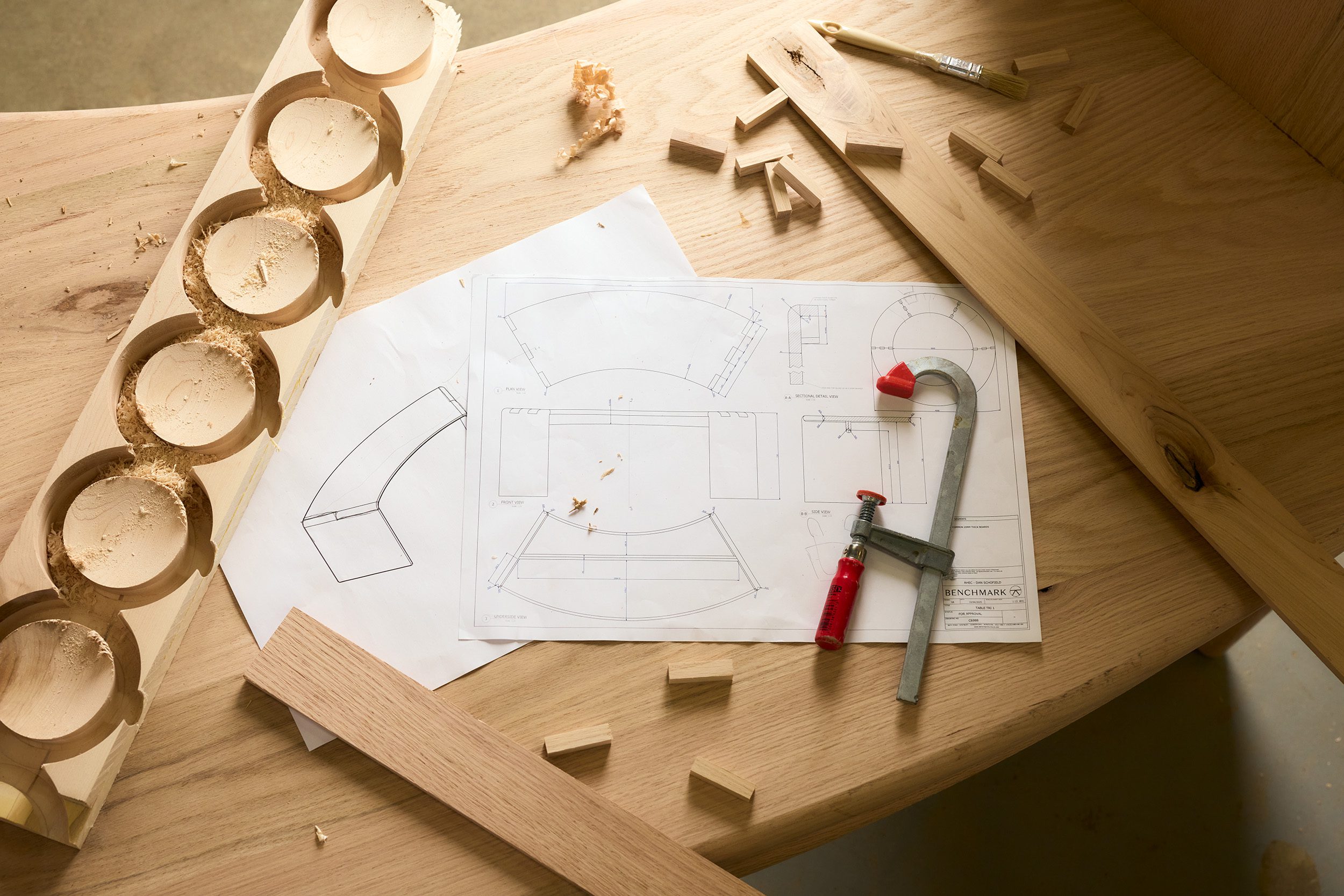 Schofield ใช้ไม้ No.1C cherry ในการสร้างสรรค์เฟอร์นิเจอร์ขึ้นมาชุดหนึ่ง ประกอบด้วยโต๊ะ ม้านั่ง เก้าอี้สตูล และฉากกั้นที่มีความสูงหลากหลาย ทั้งหมดเพื่อตอบรับความต้องการพื้นที่ทำงานที่ยืดหยุ่นซึ่งเพิ่มขึ้นในปัจจุบัน โดยทั่วไปไม้ No.1C มักจะต้องผ่านกระบวนการมากมายเพื่อให้คุณสมบัติตามธรรมชาติของมันเหมาะกับการผลิตชิ้นงานขนาดใหญ่ อาทิ ตาไม้ (knots) การเปลี่ยนสี (colour shifts) และลายไม้ที่ผิดปกติ (irregular grain) แต่นอกจากจะไม่ซ่อนสิ่งเหล่านี้แล้ว Schofield ยังคิดค้นองค์ประกอบที่จะโอบรับพวกมันขึ้นมาใหม่ ด้วยการใช้วิธีง่ายๆ แต่เห็นผลดีเพื่อประสานรอยแยกและอุดรูบนไม้ ผลักดันศักยภาพของ No.1C สู่ขั้นสูงสุด