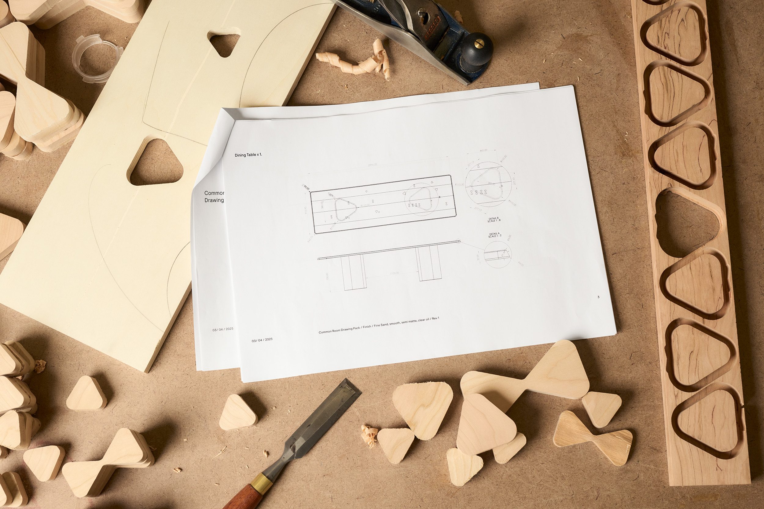 butterfly joint ที่พบในงานฝีมือตามปกติจะมีเหลี่ยมมุมคม ทว่าในงานนี้กลับถูกทำให้มนเพื่อเพิ่มความเร็วการผลิตไปพร้อมๆ กับเน้นย้ำว่ามันถูกสร้างโดยเครื่องจักร รูปร่างสามเหลี่ยมกลมมนช่วยให้งานในคอลเล็กชันนี้มีความกลมกลืนเป็นอันหนึ่งอันเดียว เรียกว่าเป็นทั้งฟังก์ชันและสไตล์