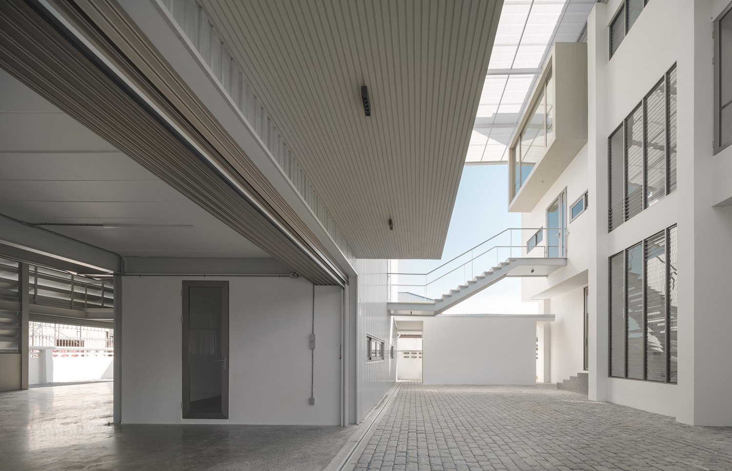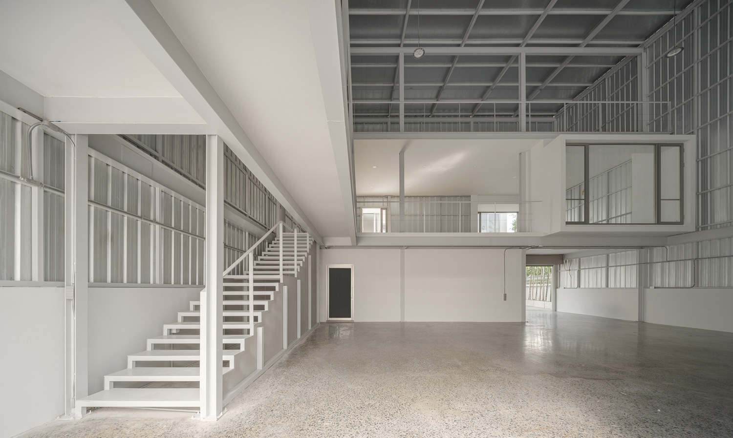 จากโจทย์ที่ได้รับโดยเจ้าของโครงการ สถาปนิกจาก Collage Design Studio ได้ทำการจัดเรียงสเปซให้ดูยืดหยุ่นมากขึ้น อาคารด้านหน้าถูกจัดผังใหม่ ตำแหน่งบันไดที่ชั้น 1 ถูกขยับไปไว้ด้านหลัง มีการรื้อพื้นบางส่วนออกให้สเปซโถงบันไดมีความลื่นไหลมากขึ้น สามารถเชื่อมโยงสายตาไปได้ถึงชั้น 3 จากพื้นที่ภายในมีลักษณะดูทึบ การใช้สีอ่อนทำให้พื้นที่ใหม่มีขนาดกว้างขึ้น อาคารโกดังด้านหลังถูกปรับจากพื้นที่เก็บของกลายเป็นสตูดิโอสำหรับทำงานศิลปะ พร้อมกับเตรียมพื้นที่ให้เป็น gallery จากเดิมที่พื้นที่ใช้สอย 2 ชั้น ถูกปรับปรุงให้เป็น 3 ชั้นในรูปแบบชั้นลอย ผลลัพธ์ของสเปซมีความลื่นไหลจากการไม่สร้างเต็มพื้นที่ อาคารทั้งส่วนสำนักงานและสตูดิโอถูกเชื่อมกันด้วยทางเดินเป็นสะพานเชื่อมที่ชั้น 2 พื้นที่ระหว่างอาคารทั้ง 2 กลายเป็นคอร์ทที่ทำหน้าที่ได้อเนกประสงค์ พร้อมกับเชื่อมโยงสเปซชั้น 1 ของทั้งสองอาคารให้เป็นหนึ่งเดียวกัน ลดความอึดอัดจากพื้นที่หนาแน่นของย่านซอยสุขุมวิท 81