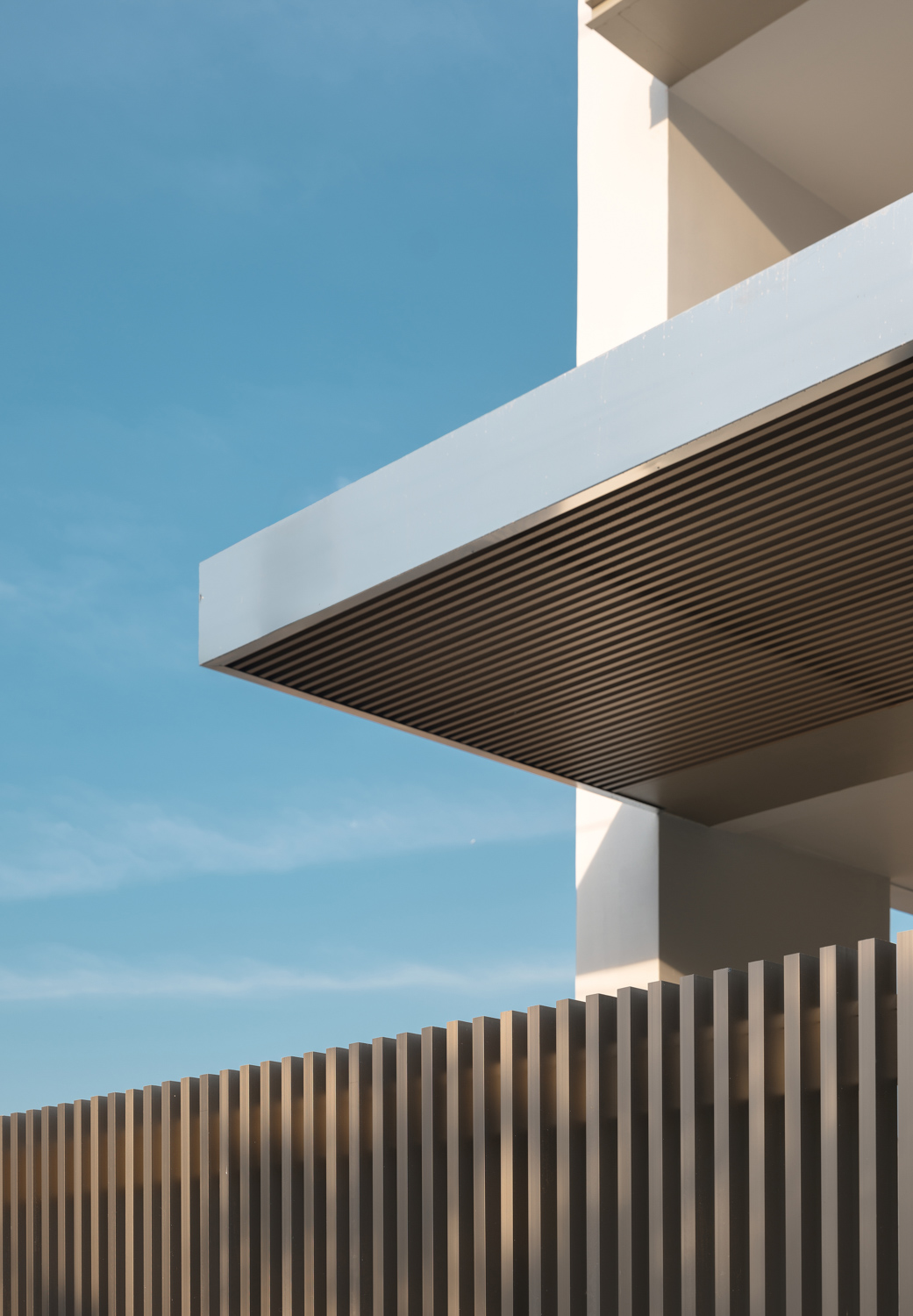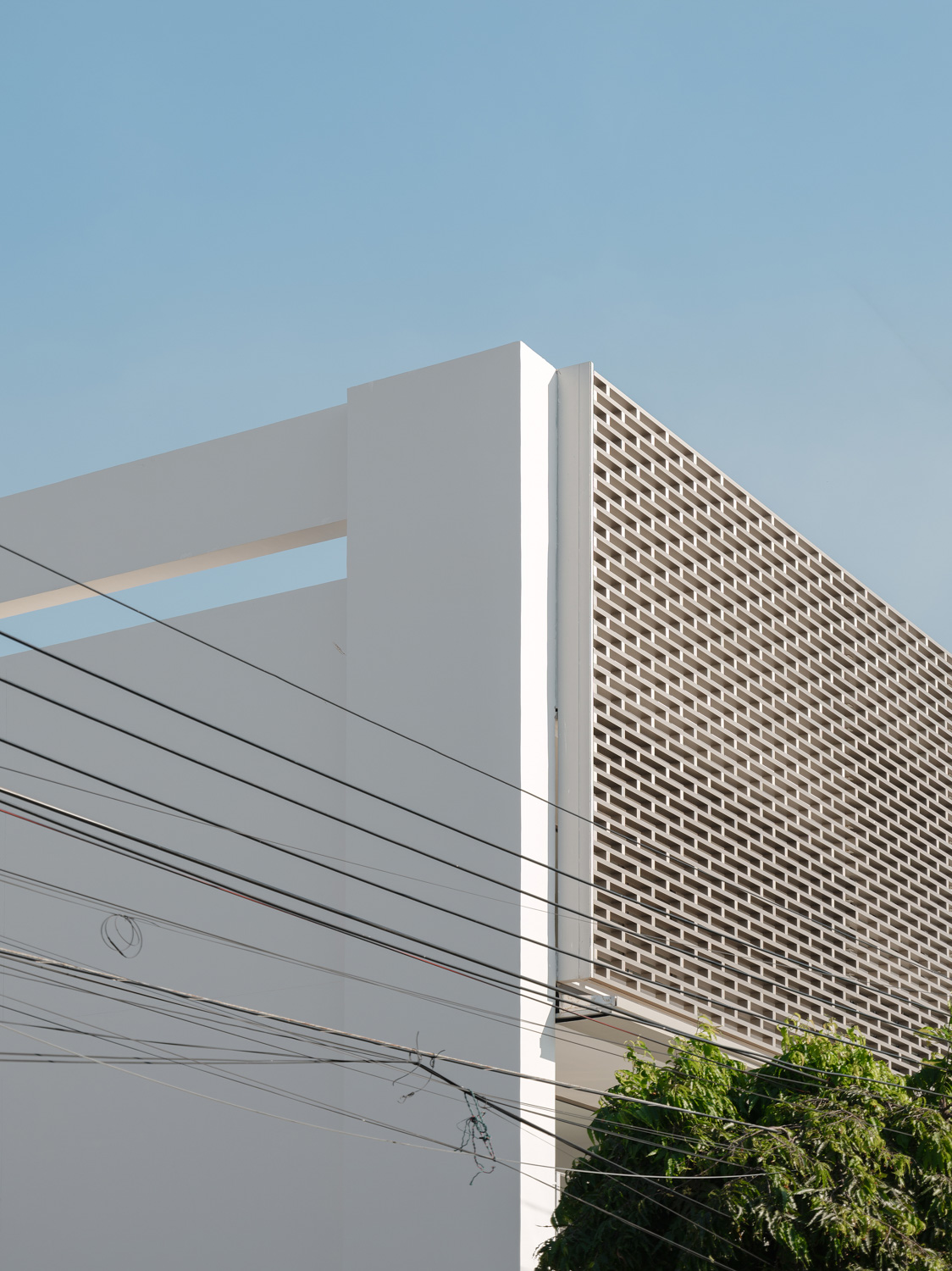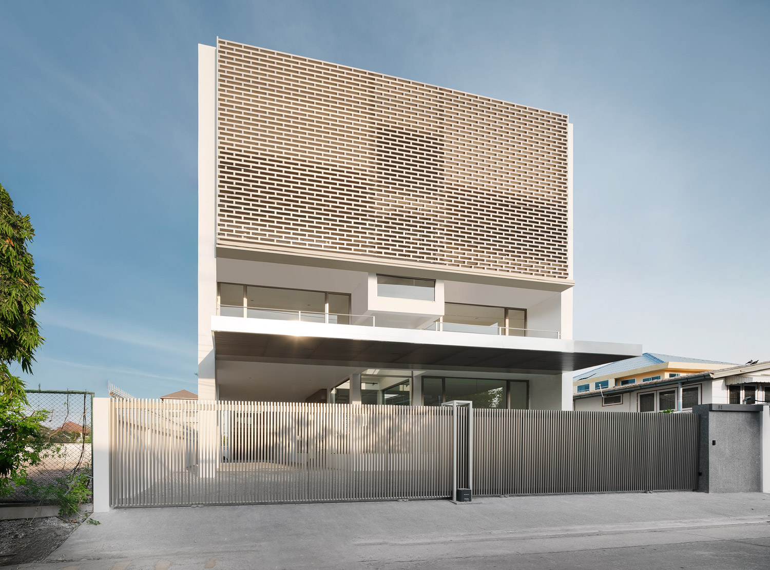สถาปนิกออกแบบโดยประยุกต์วงกบอลูมิเนียมขนาด 50×100 มิลลิเมตร วัสดุที่คุ้นชินกับการเป็นวงกบประตูหน้าต่าง ให้กลายเป็นแผงบังแดดวางในแนวนอนพาดยาวคลุมด้านหน้าอาคาร และเพื่อป้องกันวงกบอลูมิเนียมมีอาการแอ่นจนตกท้องช้าง จึงออกแบบให้วงกบอลูมิเนียมพลิกในแนวตั้งเรียงรูปแบบไขว้เหมือนการก่ออิฐจากเหตุผลด้านโครงสร้าง
