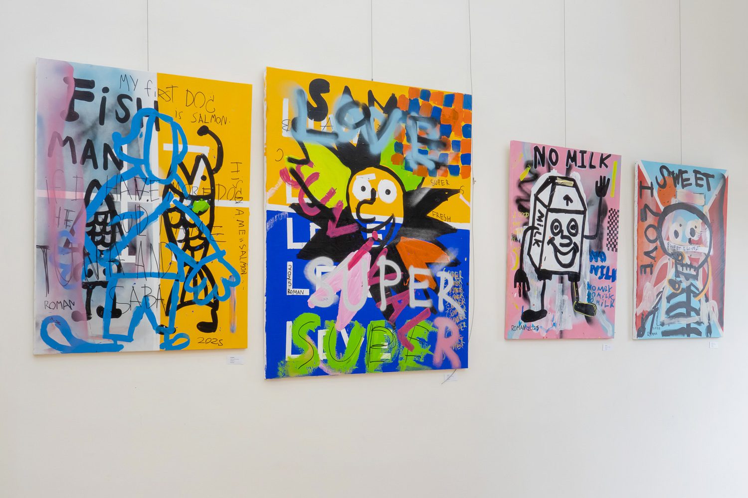 โรมันไม่ชอบทานนม แต่ถ้าเป็นขนมหวานล่ะก็ ‘Sweet I love it’ เวลาโรมันมีปัญหาแม่จะเป็นคนที่คอยช่วยเหลืออยู่เสมอ ในภาพชื่อ‘Mother’s boys’ โรมันเขียนถึงแม่เอาไว้ว่า ‘Mom help me every time when I have problem. Mom is a super hero. THIS IS MY BEST HERO.’ (เสียงฉาบต้องมา) ผู้ชมยังได้รับรู้ชีวิตประจำวันของศิลปินผ่านงานชื่อ ‘Leg Cream’ เพียงยืนตรงหน้าภาพ คุณจะได้ยินเสียงแม่ร้องเตือนว่าอย่าลืมทาครีมที่ขา ยังมีเสียงพ่อคอยย้ำเตือนเรื่องอย่าลืมผูกเชือกรองเท้า ซ้ำๆ วนเป็นลูปอยู่ในภาพสีแดงสด