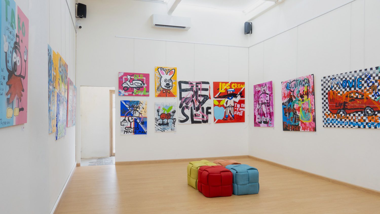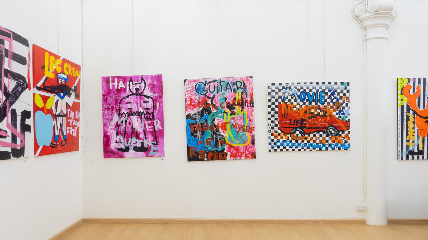 โรมันใช้เวลาทั้งหมด 4 วันในแกลเลอรีเพื่อสร้างงานทั้ง 16 ชิ้น รวมติดตั้งพร้อมแสดง โดยมีครอบครัว พ่อ แม่ และน้องชาย เป็นสายซัพพอร์ต ขนเฟรม อุปกรณ์ ล้างแปรง เทน้ำ… เขาวางแผนการทำงาน (การเล่าเรื่อง) ของเขา เป็นระบบ เริ่มจากสเก็ตช์ไอเดียคร่าวๆ ในสมุดโน้ต ปูพื้นชั้นแรกทุกๆ ภาพตามแผน ก่อนจะเริ่มทับชั้นต่อๆ มาด้วยเทคนิคอันหลากหลาย ทั้งที่มีความชำนาญและที่อาศัยความกล้า ตัดสินใจทำสิ่งที่ยังไม่เคยทำมาก่อน การปาดฝีแปรงที่ไม่ติดว่าแบบนี้ผิดหรือถูก การเลือกคู่สีที่ใช้สัญชาตญาณล้วนๆ ส่วนที่โดดเด่นที่สุดน่าจะเป็นการเล่าเรื่องผ่านรูปทรง เส้นสาย และสี ที่แสดงถึงความเป็นอิสระ ความสนุก ความรู้สึกของวัยปัจจุบัน