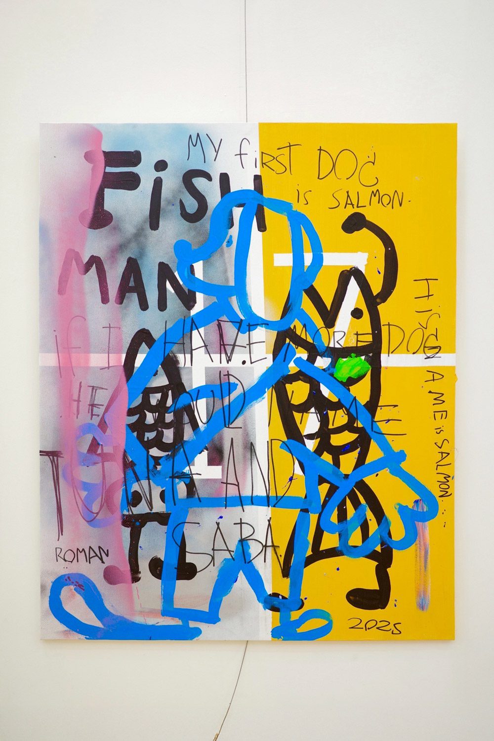 หมาตัวแรกของโรมันคือพันธุ์บีเกิ้ล ที่โรมันเก็บเงินจากการวาดภาพขายด้วยตัวเองเพื่อเป็นเจ้าของ โรมันตั้งชื่อให้มันว่า ‘แซลมอน’ เนื่องจากตัวเองชอบทานปลาแซลมอนมาก ผู้ชมจะได้เห็นแซลมอนที่เป็นมนุษย์ปลาอยู่บนพื้นสีเหลือง และมีแซลมอนในเวอร์ชันน้องหมาซ้อนทับอยู่ชั้นบน