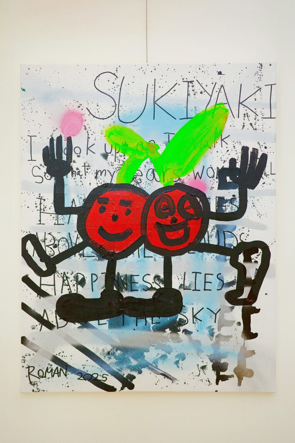 โรมันบันทึกเนื้อเพลงท่อนนี้ไว้บนงาน‘Sukiyaki’ ของเขา งานนี้เรียบง่าย ไม่ใช้สีสันฟาดฟันกันฉูดฉาด ทว่ามีความ subtle sentimental และสุดจะมนุษย์นิยม ดูแล้วดูอีก ค่อยๆ ค้นหาความหมายแห่งบทกวีเบื้องหลัง ที่โดนทับด้วยสีชั้นบนสุด ค่อยๆ ปะติดปะต่อ ในใจพลันได้ยิน เสียงดนตรี เสียงร้อง ช่องว่างของกาลเวลา บรรจุอยู่ด้วยกัน…
