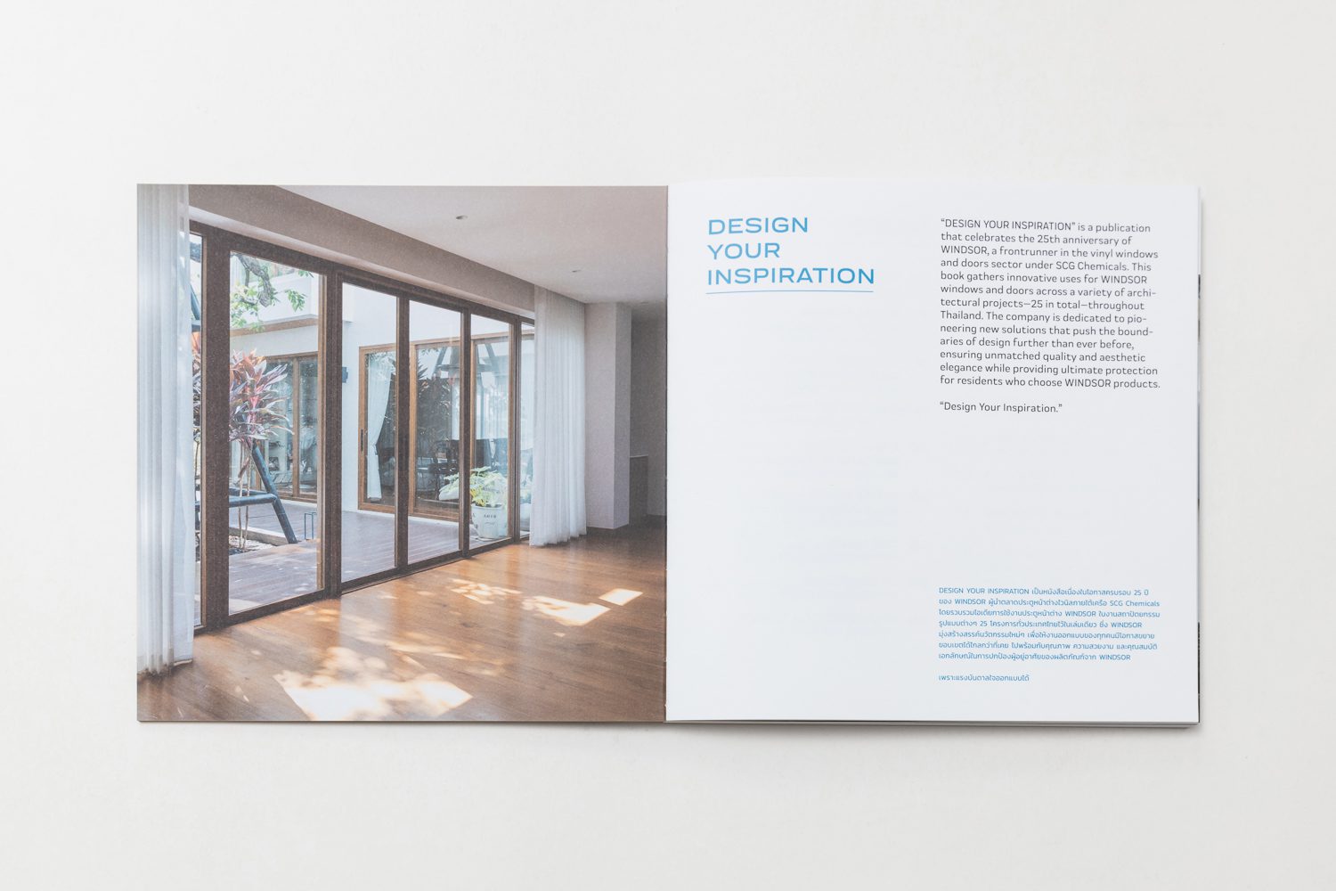 DESIGN YOUR INSPIRATION เป็นหนังสือที่รวบรวมไอเดียการใช้งานประตูหน้าต่าง WINDSOR ในสถาปัตยกรรมรูปแบบต่างๆ ตั้งแต่บ้านพักอาศัย คอนโดมิเนียม รวมถึงโรงแรมและรีสอร์ทกว่า 25 โครงการทั่วประเทศไทยไว้ในเล่มเดียว สำหรับหลายคนกรอบประตูหน้าต่างคงเป็นชิ้นส่วนท้ายๆ ที่คิดถึงหลังจากเลือกสไตล์การตกแต่งในบ้านแล้ว แต่หากมองในมุมกลับกัน ช่องเปิดหรือประตูหน้าต่างเป็นสิ่งที่ทุกอาคารต้องมี การมองถึงความเป็นไปได้ของมันที่อาจเข้ามาต่อยอดองค์ประกอบอื่นๆ ในงานออกแบบ ก็จะช่วยให้ผู้ออกแบบสามารถตัดสินใจบางเรื่องได้ง่ายขึ้น