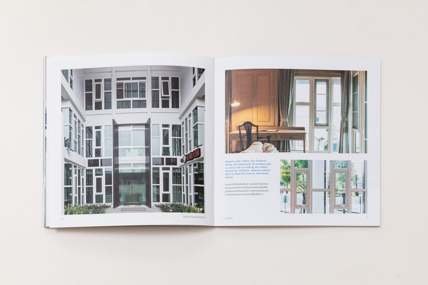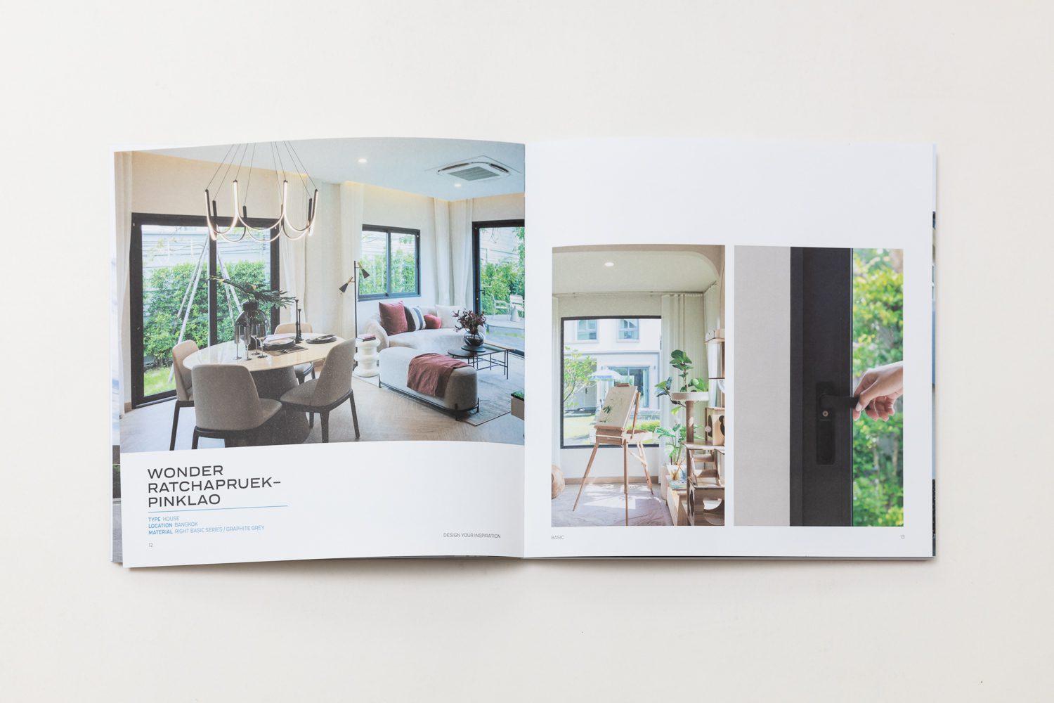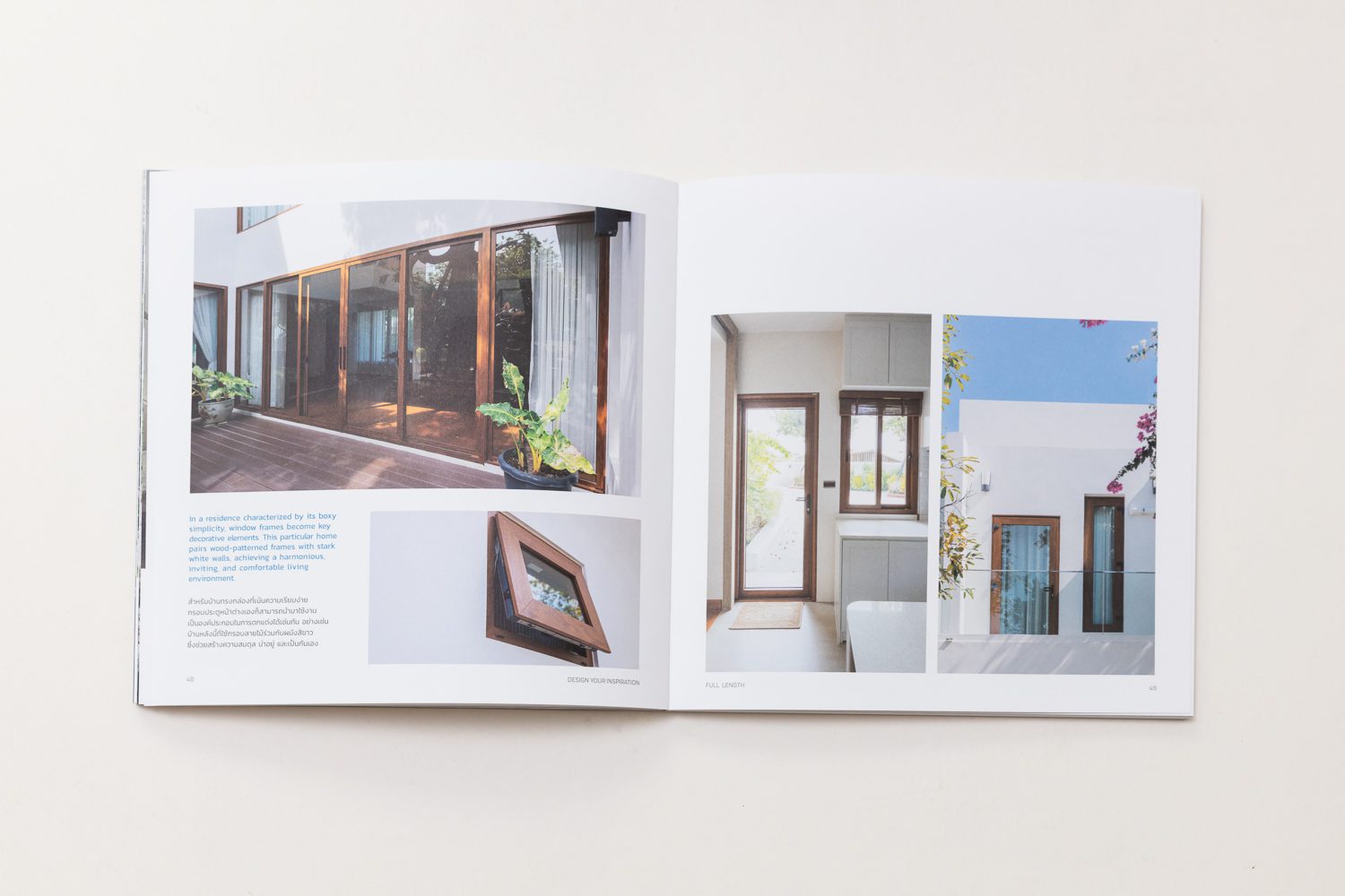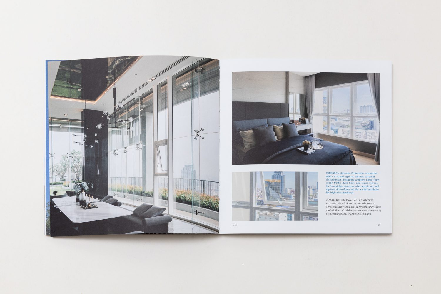 WINDSOR เปิดให้ผู้อ่านท่องไปในสเปซที่เกิดขึ้นมากกว่าการใช้ถ้อยคำบรรยาย มุมมองภายในเล่มก็มีทั้งภายในและภายนอก ให้ทุกคนได้ลองสำรวจว่าประตูหน้าต่างส่งผลต่อรูปลักษณ์ของอาคารอย่างไรบ้าง ทั้งด้านวัสดุ สัดส่วน และการเลือกใช้สี ซึ่ง WINDSOR ก็มีสีมาตรฐานอย่างสีขาว สีเทา และสีดำ นอกจากนี้ยังมีสีทีค (Amber Teak) และสีวอลนัท (Dark Walnut) ที่มีผิวสัมผัสราวกับไม้จริงด้วยเทคโนโลยีฟิล์มลามิเนตจากเยอรมนีด้วย