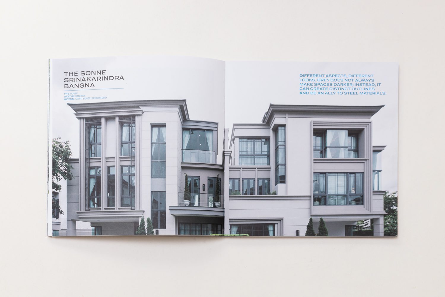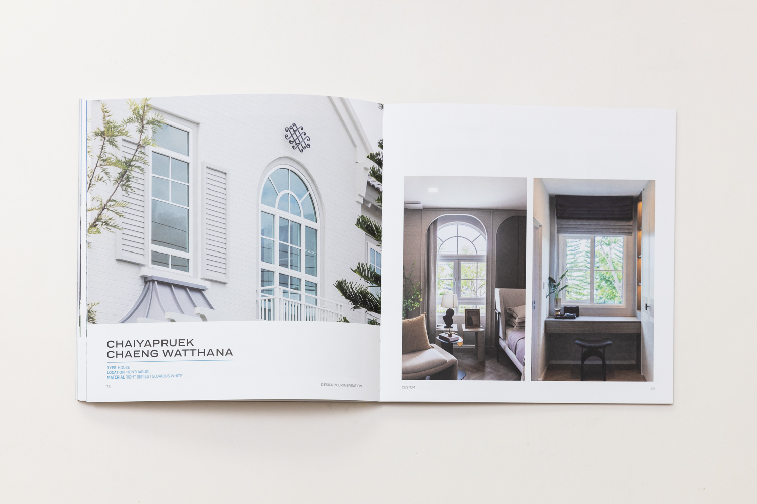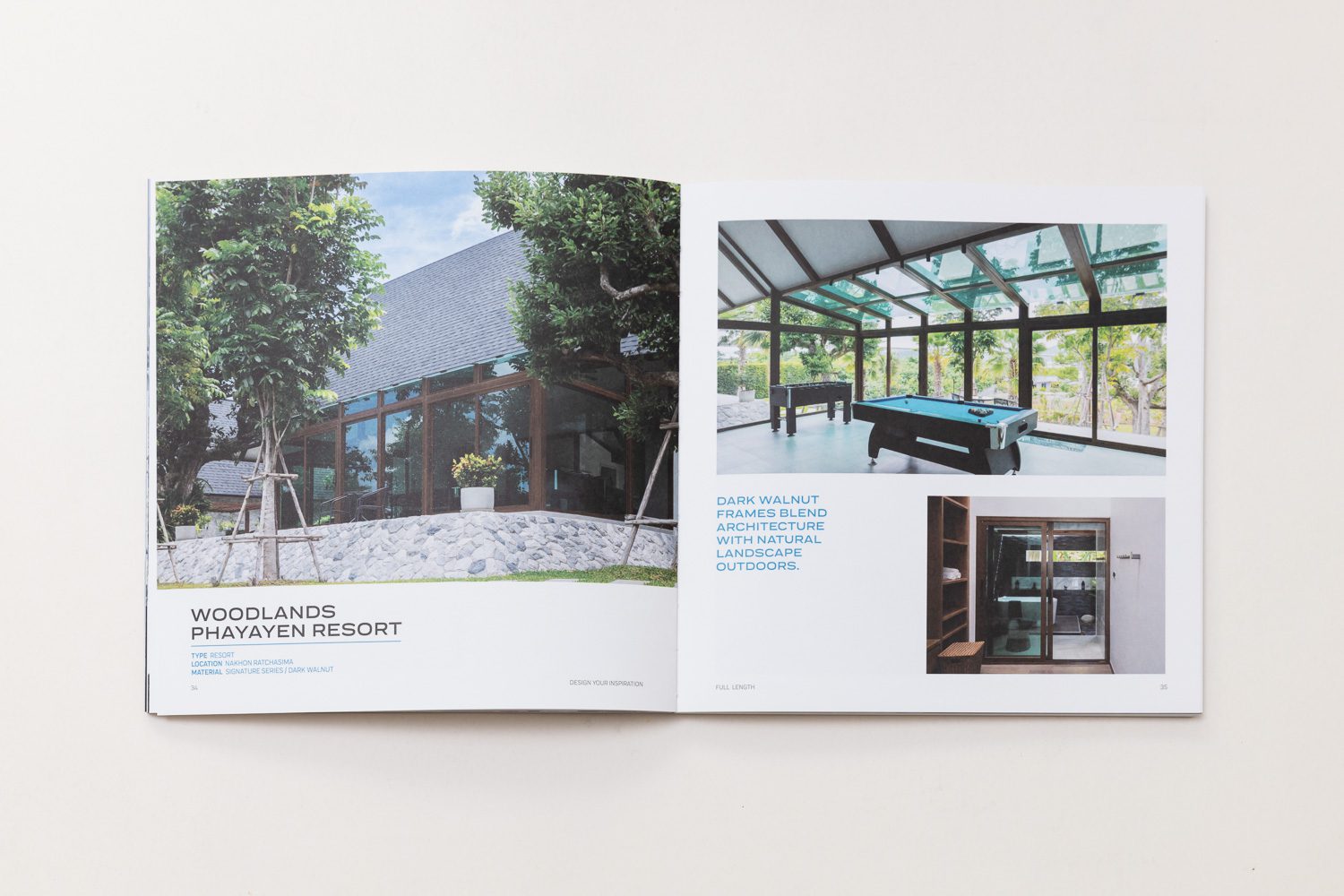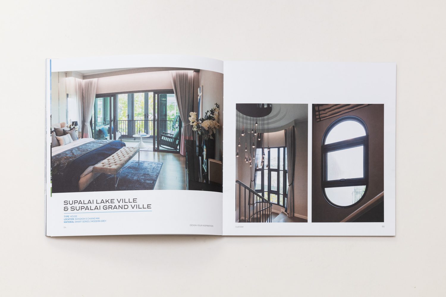 WINDSOR เปิดให้ผู้อ่านท่องไปในสเปซที่เกิดขึ้นมากกว่าการใช้ถ้อยคำบรรยาย มุมมองภายในเล่มก็มีทั้งภายในและภายนอก ให้ทุกคนได้ลองสำรวจว่าประตูหน้าต่างส่งผลต่อรูปลักษณ์ของอาคารอย่างไรบ้าง ทั้งด้านวัสดุ สัดส่วน และการเลือกใช้สี ซึ่ง WINDSOR ก็มีสีมาตรฐานอย่างสีขาว สีเทา และสีดำ นอกจากนี้ยังมีสีทีค (Amber Teak) และสีวอลนัท (Dark Walnut) ที่มีผิวสัมผัสราวกับไม้จริงด้วยเทคโนโลยีฟิล์มลามิเนตจากเยอรมนีด้วย