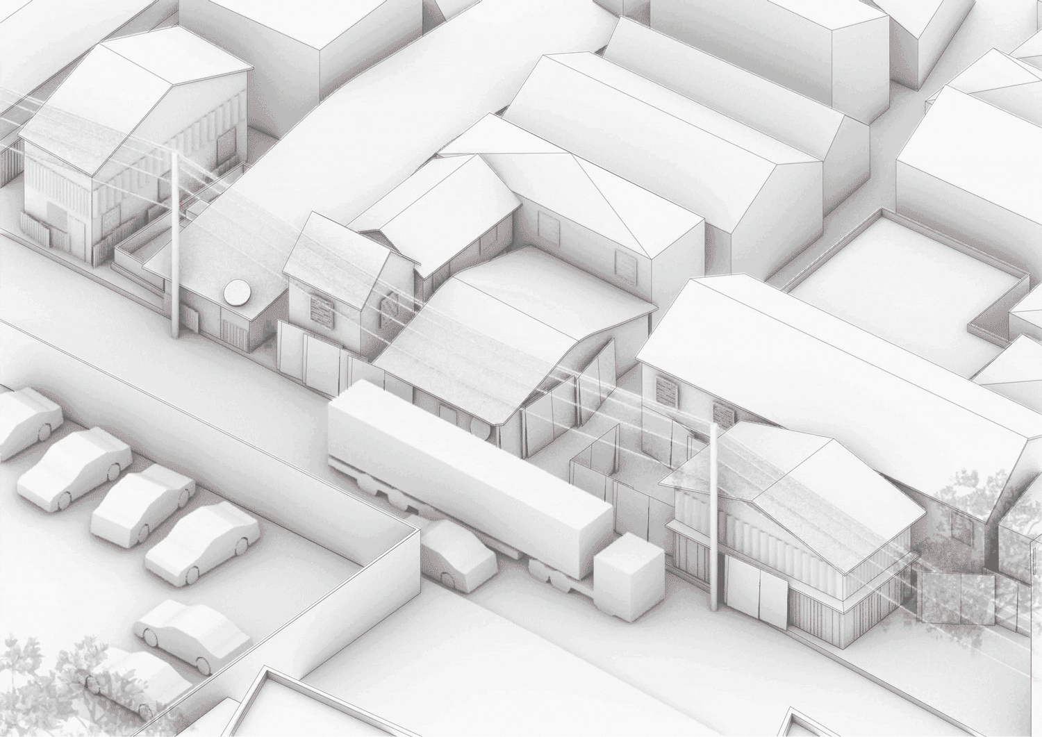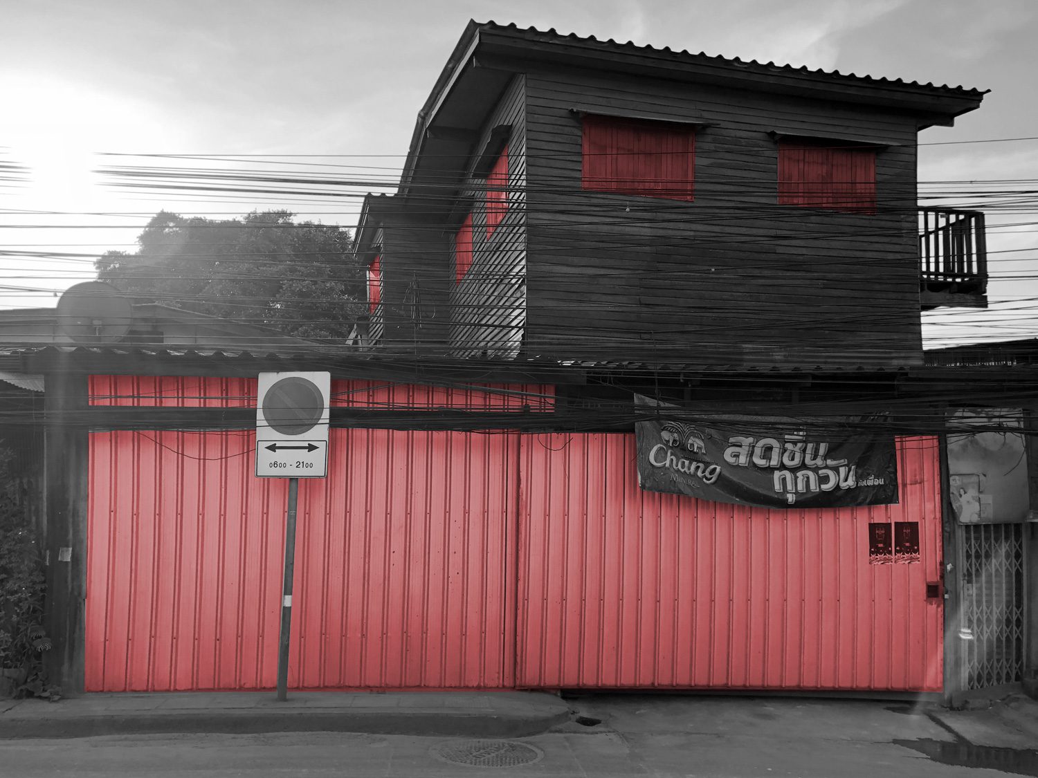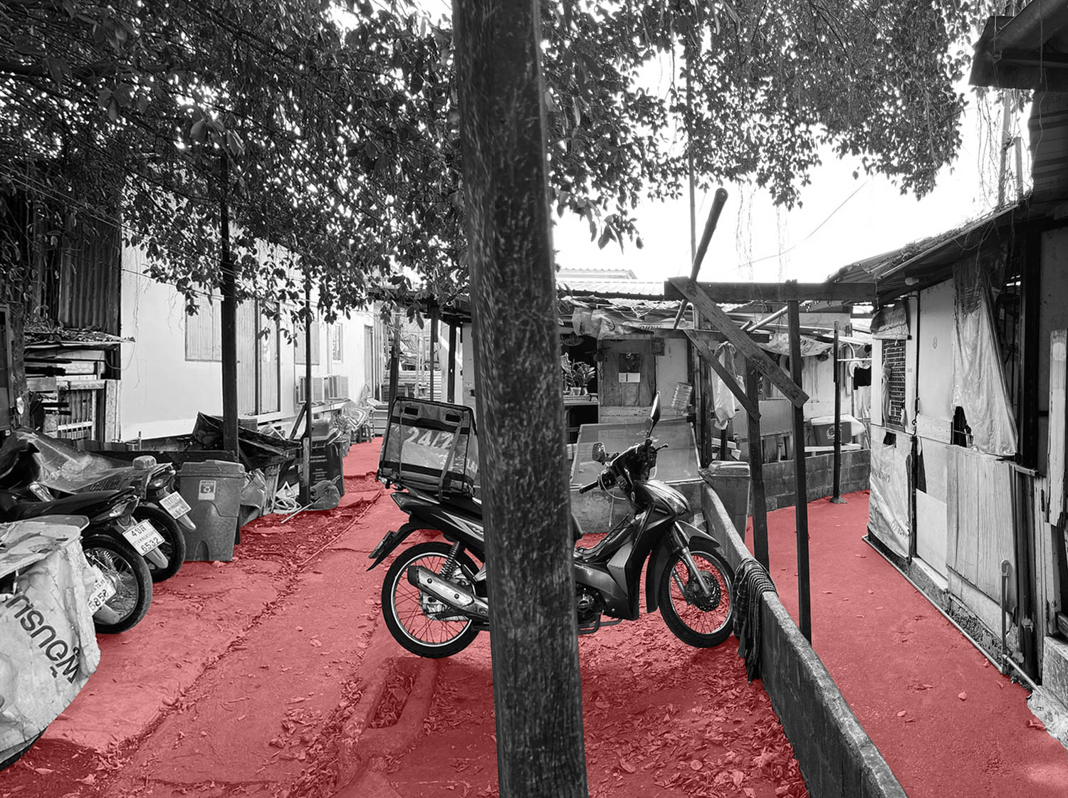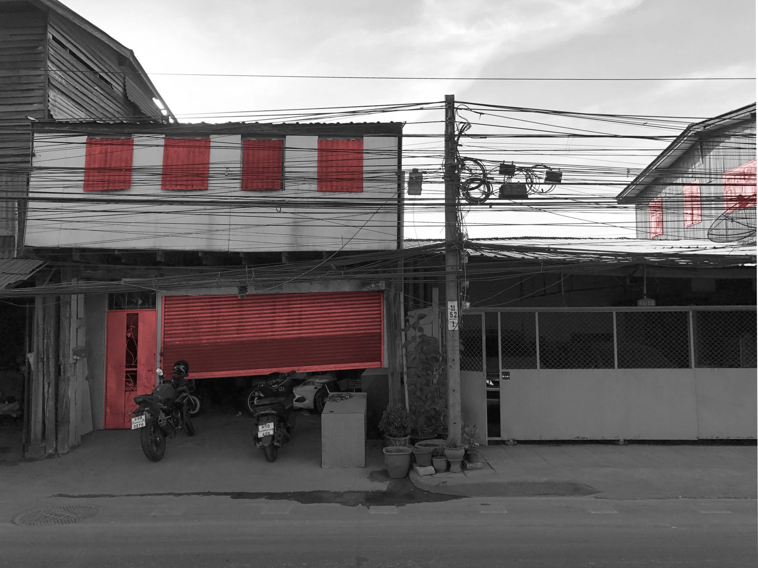 ฟากหนึ่งของหมู่บ้านที่ติดถนนสาธารณะต้องเผชิญกับฝุ่นละอองจากการผลิตของโรงงานปูนซีเมนต์อย่างต่อเนื่อง ขณะที่รถบรรทุกหินและทรายหลายสิบคันแล่นผ่านทุกวันยิ่งซ้ำเติมสภาวะแวดล้อมที่เสื่อมโทรมลงเรื่อยๆ ในการรับมือกับสถานการณ์นี้ชาวบ้านได้ปรับเปลี่ยนบ้านของตนให้กลายเป็นพื้นที่ป้องกันภัย โดยใช้วัสดุราคาประหยัดที่หาได้ทั่วไปในท้องถิ่น ไม่ว่าจะเป็นไม้กระดาน ผ้าใบพีวีซี หรือแผ่นเมทัลชีท ปิดผนึกช่องเปิดหน้าต่างและผนัง จนเป็นบังเกอร์ที่คอยป้องกันมลพิษ ผิวอาคารที่เกิดขึ้นจากการปรับตัวนี้มุ่งเน้นความปลอดภัยและสุขภาพของผู้อยู่อาศัย เป็นกำแพงกายภาพที่คั่นกลางระหว่างชุมชนกับสภาพแวดล้อมอุตสาหกรรมอันเป็นปฏิปักษ์
