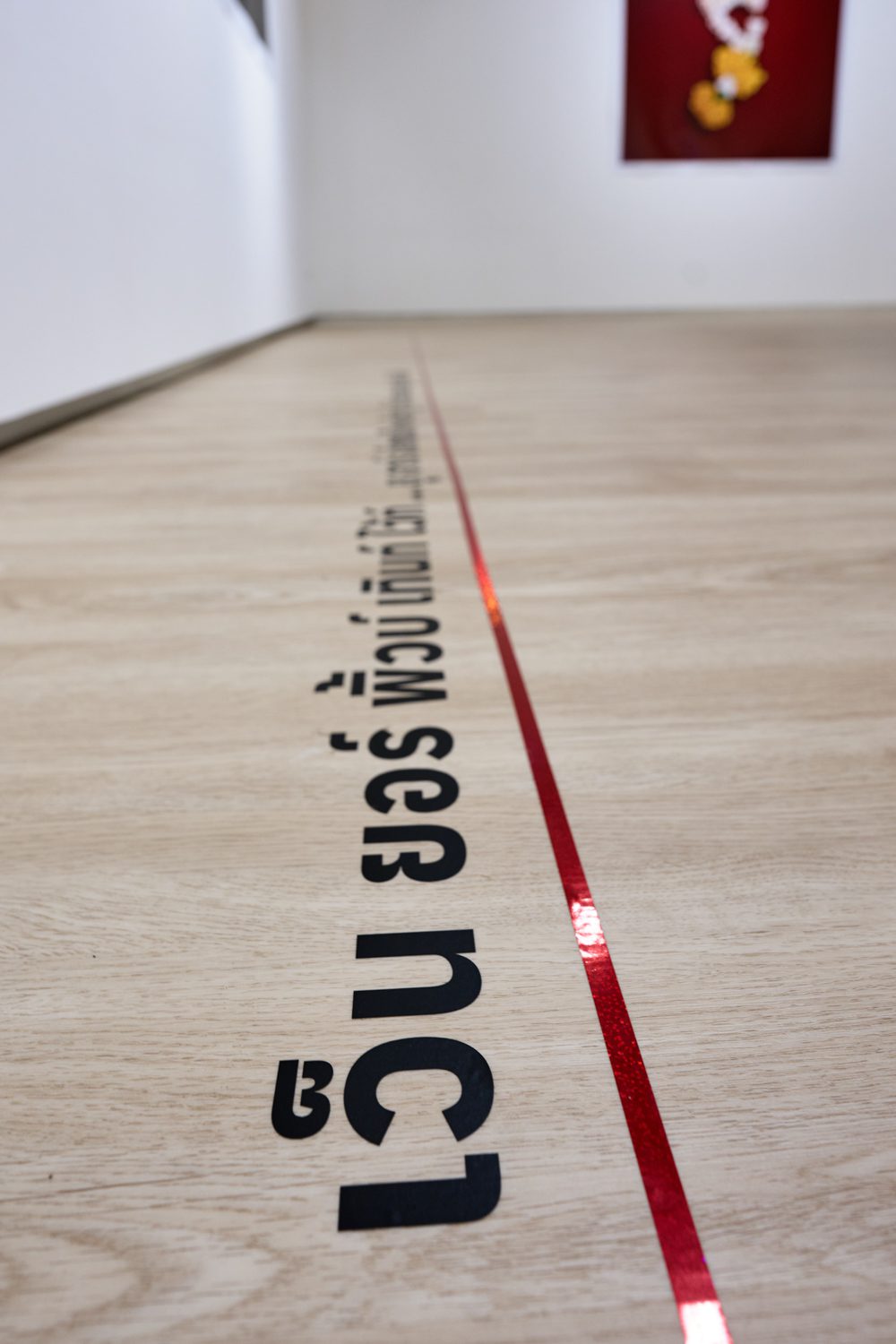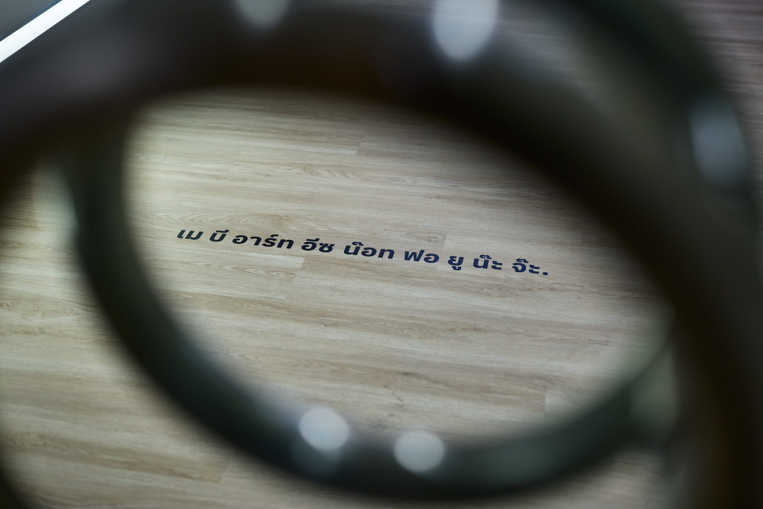 ตลอดทั้งนิทรรศการจึงเต็มไปด้วยปรบท (paratexts) ที่ถูกประกบติดไว้ทั้งบนพื้นและผนัง ราวกับเป็นคำถามและคำตอบที่สร้างระยะบางอย่างเพื่อประกอบกับผลงานแต่ละชิ้น ยกตัวอย่างเช่น ‘เม บี อาร์ท อีซ น็อท ฟอ ยู น๊ะ จ๊ะ’ (บางทีศิลปะอาจจะไม่เหมาะกับคุณนะจ๊ะ), ‘เล็ท มี เทล ยู ออฟ ว็อท ทู ติ้งค์’ (ให้ฉันบอกสิ่งที่คุณต้องคิด) หรือที่น่าสนใจเป็นพิเศษคือการวาง ‘เว็น ยอร์ พิ้วบ์ เทินท์ ไว้ท์ … ยู อาร์ เอ็กซเป็ก-เต็ท ทู โนว์ ซรรม ฌิฐ อเบ้าท์ ไล้ฟ’ (เมื่อขนเพชรของคุณเปลี่ยนเป็นสีขาว… คุณย่อมถูกคาดหวังให้ต้องรู้เชี่ยอะไรสักอย่างเกี่ยวกับชีวิต) ซึ่งถูกจัดวางใต้ภาพถ่ายเส้นขนสีขาว (ขนหงอก) บนพื้นหลังสีดำทั้งสี่ชิ้น