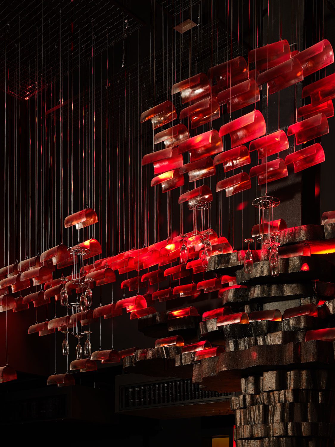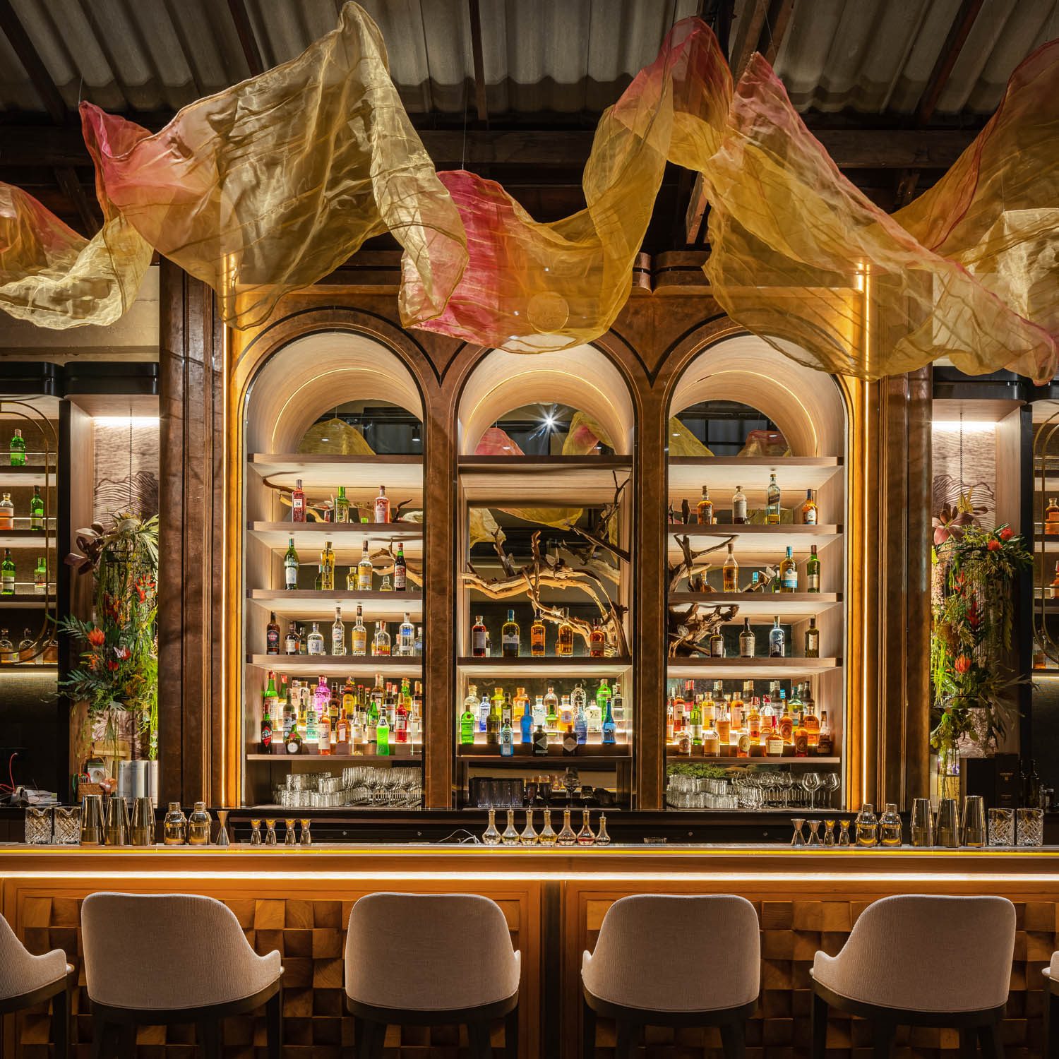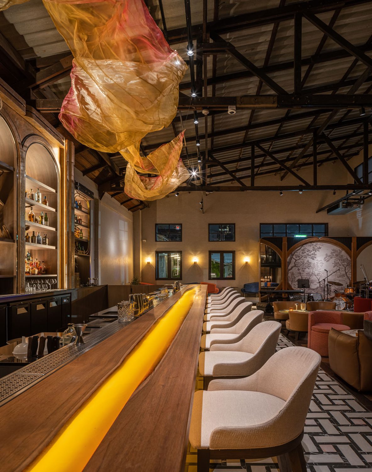 ในส่วนของไม้ที่ใช้เองก็จะมาจากกระบวนการเก็บเกี่ยวอย่างยั่งยืน และเราได้สอดแทรกเรื่องราวไว้ในส่วนต่างๆ ทั้งส่วนบาร์ ที่นั่งต่างๆ รวมไปถึงส่วนชั้นบนที่เราออกแบบให้คล้ายกับหอคอยปราสาทตามตำนาน เป็นห้อง VIP ของร้าน ซึ่งเราได้ดีไซน์ประสบการณ์และอารมณ์ในการอยู่ในพื้นที่ร้าน นำเอาความหมายมาคลี่คลายเพื่อสะท้อนโจทย์ในการออกแบบจุดต่างๆ เช่น นำปีกผีเสื้อที่ขยับมาอยู่ในองค์ประกอบเล็กๆ อย่างพื้นกระเบื้อง และพื้นไม้ ถ้าสังเกตจะเห็นรายละเอียดที่เราใส่ไปในจุดต่างๆ