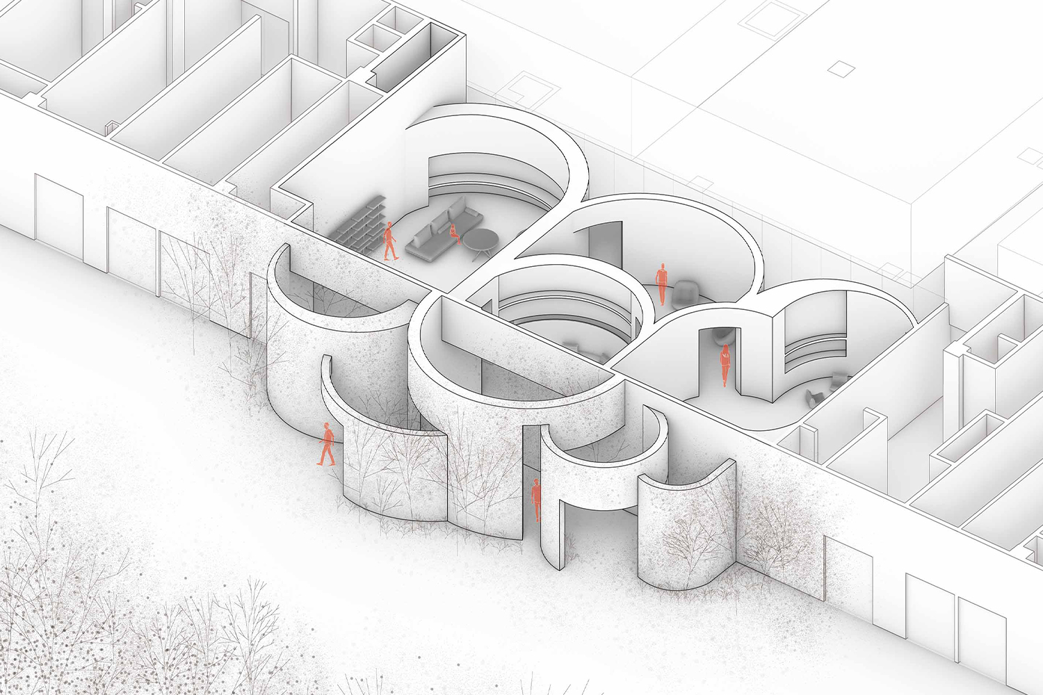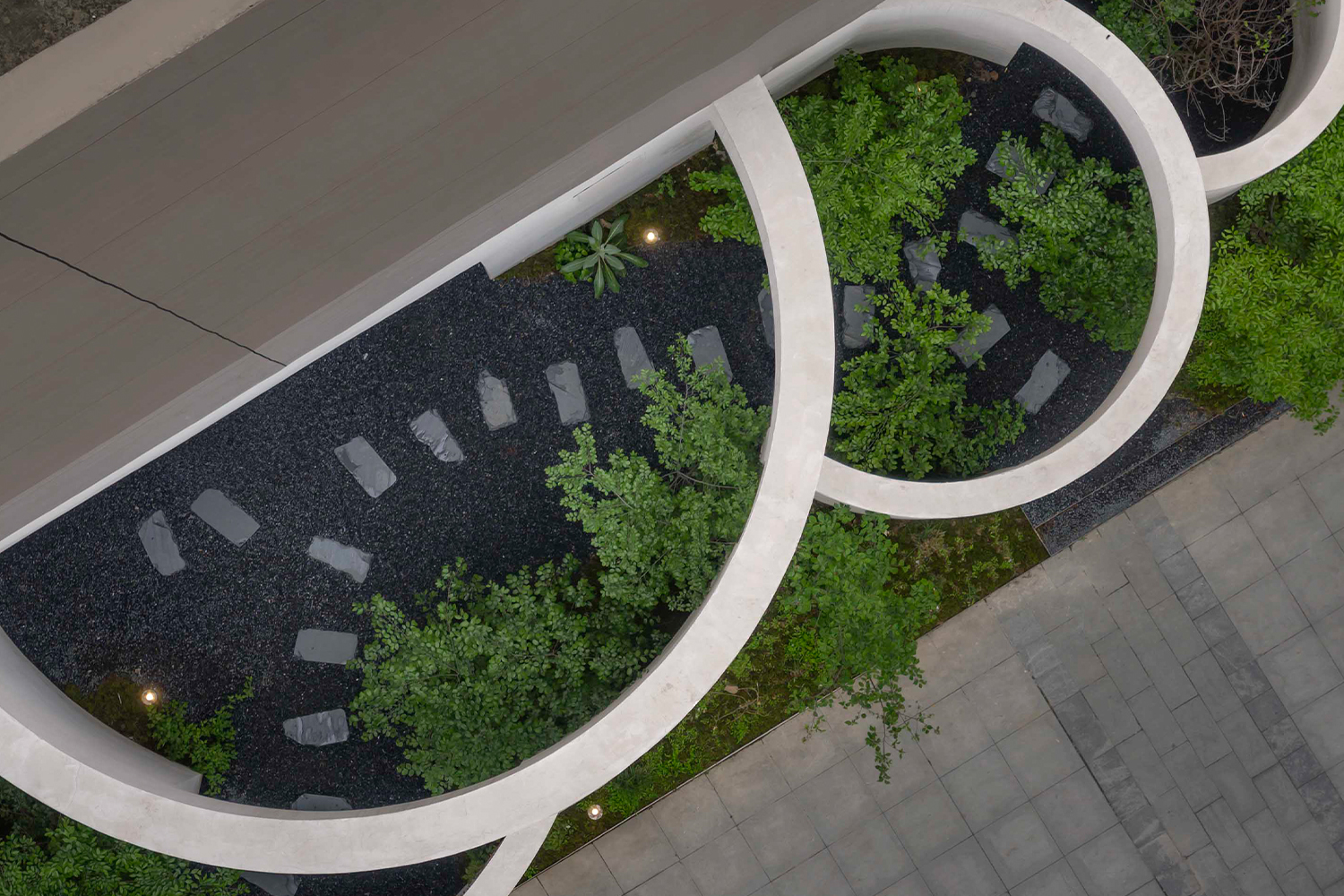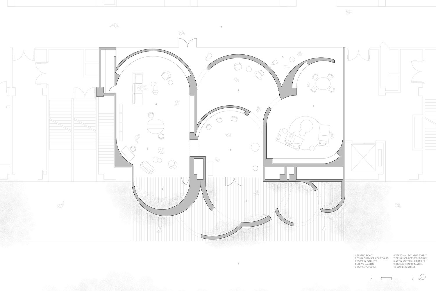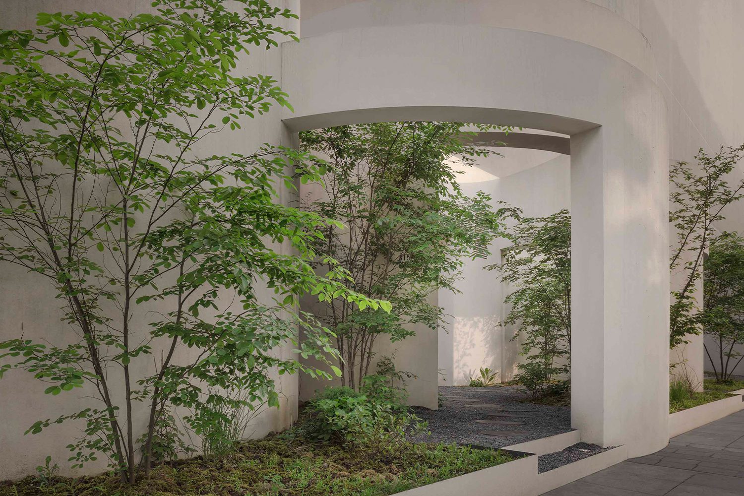 เนื่องด้วยพื้นที่ด้านนอกที่เต็มไปด้วยความวุ่นวายและเสียงรบกวนจากภายในเมือง HAS design and research จึงต้องการสร้างพื้นที่ที่เปรียบเสมือน ‘ตัวกรอง’ เพื่อแยกความวุ่นวายออกจากประสบการณ์ของผู้มาเยือน กลายมาเป็นกำแพงโค้งสีขาวบริเวณทางเข้า สลับโค้งซ้อนกันไปเรื่อยๆ ตามความสูงต่ำ พร้อมแทรกด้วยพรรณไม้สีเขียวชอุ่มที่ตัดกับกำแพงขาว โดยกำแพงนี้ไม่ได้นำเสนอในมุมของความงามเท่านั้น หากยังมีหน้าที่ลดเสียงรบกวนจากภายนอก และยังกลายเป็น echo chamber หรือห้องสะท้อนเสียงแบบธรรมชาติ โดยเสียงที่เกิดขึ้นภายในลานกว้างแทรกระหว่างกำแพงจึงคล้ายกับบทกวีที่โอบล้อมผู้มาเยือนแบบไม่ทันรู้ตัว