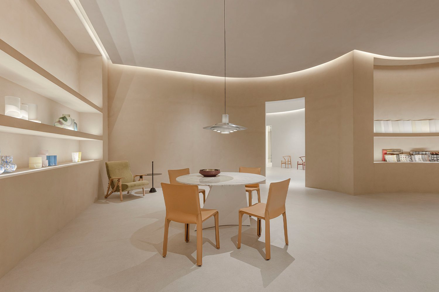 นอกจากนี้แล้ว กำแพงสีขาวโค้งมนหลังนี้ยังทำหน้าที่เชื่อมต่อระหว่างพื้นที่ภายในและภายนอกได้อย่างแนบเนียนและลงตัว เพราะเมื่อเดินผ่านด้านหน้าก็จะพบกับแกลเลอรีหลัก ออกแบบด้วยรูปทรงโค้ง พร้อมกำแพงสูงเช่นเดียวกัน แถมลูกเล่นด้วยช่องแสงด้านบนกับความสูง 5 เมตร พร้อมด้วยพื้นที่ป่าเต็มไปด้วยต้นไม้ตามฤดูกาล ทำงานสอดประสานกับการเคลื่อนตัวของดวงอาทิตย์ ฉายแสงและเงาอันเป็นเอกลักษณ์แต่ละช่วงเวลาผ่านช่องแสง มอบความรู้สึกเหนือกาลเวลาและนิรันดร์