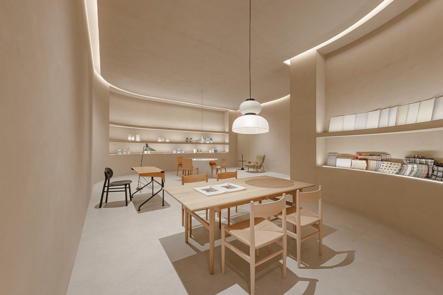 ในขณะที่อีกด้านหนึ่งของพิพิธภัณฑ์แห่งนี้คือห้องสมุดศิลปะและวัสดุ ออกแบบด้วยผนังต่อเนื่องราวกับไม่มีจุดสิ้นสุด ผสานงานศิลปะร่วมสมัยจากเอเชีย เข้ากับเฟอร์นิเจอร์ไม้ทำมือซึ่งผ่านการออกแบบอย่างประณีต เพื่อสร้างประสบการณ์การชมที่ผ่อนคลาย ปราศจากแรงกดดันและเปิดรับความงามอย่างเป็นธรรมชาติให้กับผู้เข้าชมทุกคน