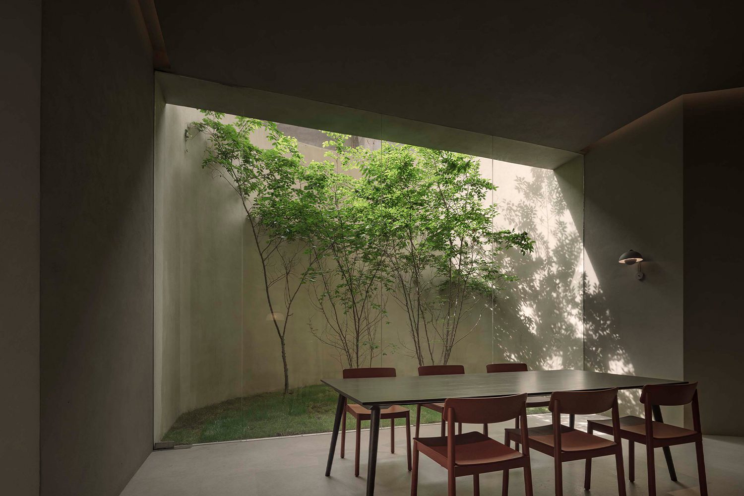 Simple Design Archive ยังเลือกใช้กำแพงที่ต่อเนื่องกันเพื่อทำหน้าที่มากกว่าการแบ่งพื้นที่ระหว่างภายนอกและภายใน กำแพงเหล่านี้ยังกลายเป็นองค์ประกอบสถาปัตยกรรมที่ใช้กำหนดทิศทาง จัดวางงานจัดแสดง และเก็บรักษาวัสดุต่างๆ ไปพร้อมกัน ภายใต้แนวคิดของโครงการทีมออกแบบพยายามสร้างพื้นที่พักพิงทางจิตวิญญาณที่ให้ความรู้สึกเสมือนสถานที่ศักดิ์สิทธิ์ และสามารถหลอมรวมพื้นที่ภายในกับภายนอกเข้าด้วยกันอย่างกลมกลืน