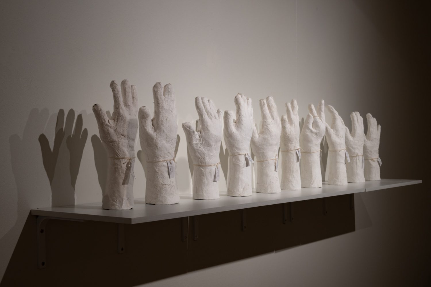 นอกจากการเล่าเรื่อง ‘ในคุก’ แล้ว ในนิทรรศการนี้ยังมีการจัดแสดง ‘A Show of Hands’ โครงการต่อเนื่องระยะยาวของ เถ่ง ลิน ที่ริเริ่มมาตั้งแต่ปี 2013 จนถึงปัจจุบัน เขาได้ออกเดินทางไปเพื่อพบกับเหล่าอดีตนักโทษทางการเมืองที่กลับมาใช้ชีวิต ‘นอกคุก’ เถ่ง ลิน ได้ทำการบันทึกเรื่องราวของพวกเขาเหล่านั้นเอาไว้ผ่านการทำทะเบียน (archive) ข้อหาและระยะเวลาของการถูกคุมขัง วิดีโอสารคดีที่บันทึกบทสนทนาที่ว่าด้วยบาดแผลและความหวัง และประติมากรรมปูนปลาสเตอร์ที่ขึ้นรูปจากมือของเหล่าอดีตนักโทษที่กลับคืนสู่สังคม จากครั้งหนึ่งที่เขาเคยแขนหักและต้องเข้าเฝือก เถ่ง ลิน จึงนำเอาเรื่องราวของ ‘การแตกหัก การซ่อมแซม และการเยียวยา’ มาพัฒนาเป็นผลงานชุดนี้