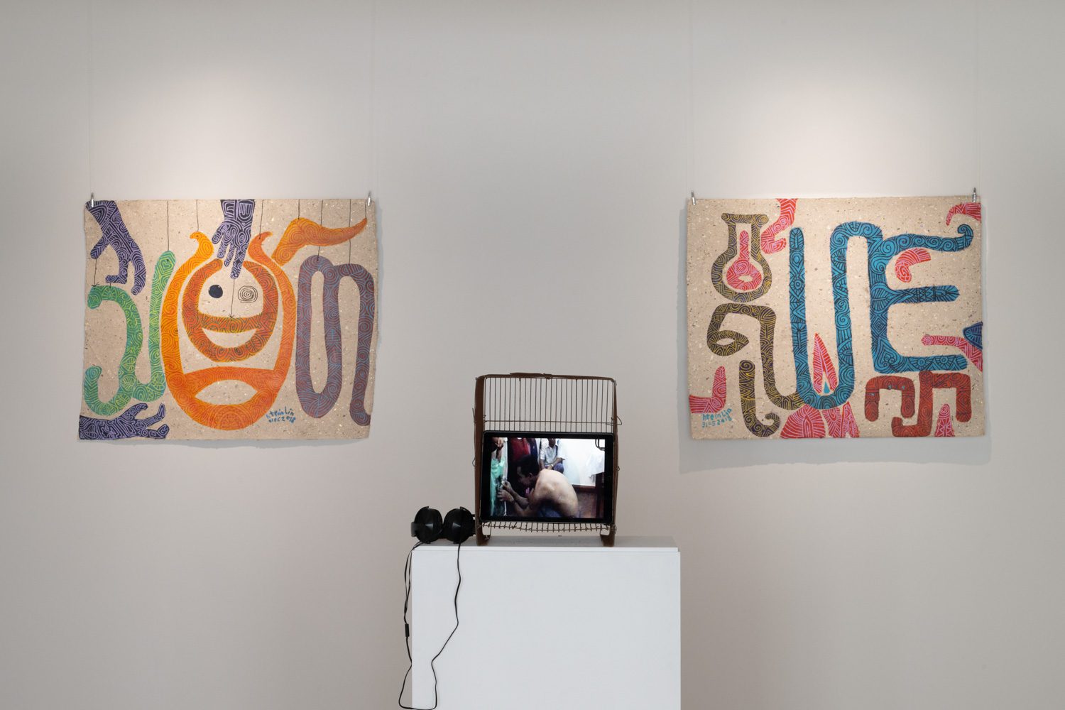 สำหรับนิทรรศการ ‘အက္ခရာ’ (Ek Kha Ya) เถ่ง ลิน (Htein Lin) ศิลปิน อดีตนักโทษทางการเมือง และหนึ่งในอดีตสมาชิกขบวนการนักศึกษา ‘8888 Uprising’3 ได้ทำการคัดเลือกตัวอักษร คำ และข้อความที่สื่อถึงความรุนแรงระหว่างรัฐและประชาชนมาใช้สร้างผลงานลงบนกระดาษลัง อักษรเมียนมาแต่ละตัวถูกเขาเขียนและบรรจุภาพความรุนแรง สัญลักษณ์ และความหมาย ให้ซ้อนทับเข้าไปความหมายจากคำดั้งเดิม คำจึงผสานเข้ากับภาพ ช่วยกัน ‘เรียก’ และ ‘ร้อง’ ถึงสิ่งที่มักถูกสะกดให้ ‘เงียบ’