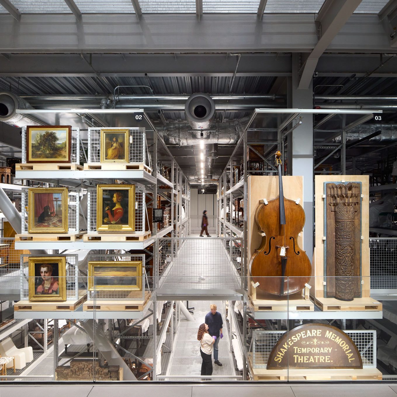 ชิ้นงานที่มีขนาดไม่ใหญ่มากจะถูกวางบนชั้น แบ่งตามหมวดหมู่ไว้อย่างหลวมๆ เพื่อให้ทางพิพิธภัณฑ์สามารถเคลื่อนย้ายการจัดวาง และปรับเปลี่ยนรูปแบบเนื้อหาการจัดแสดงได้ตามต้องการ ชิ้นงานบางส่วนจะถูกจัดกลุ่มเป็นธีมตามที่ V&A ต้องการบอกเล่าเรื่องราวเป็นพิเศษในขณะนั้น นอกจากนั้น ชิ้นงานส่วนใหญ่ไม่มีคำอธิบายรายละเอียด แต่จะมีหนังสือแคตตาล็อกเล่มใหญ่ ที่รวมชิ้นงานที่จัดแสดงทั้งหมดไล่ตามลำดับเลขของชั้นจัดแสดงวางไว้ตามจุดต่างๆ ให้ผู้เข้าชมสามารถเปิดอ่านได้