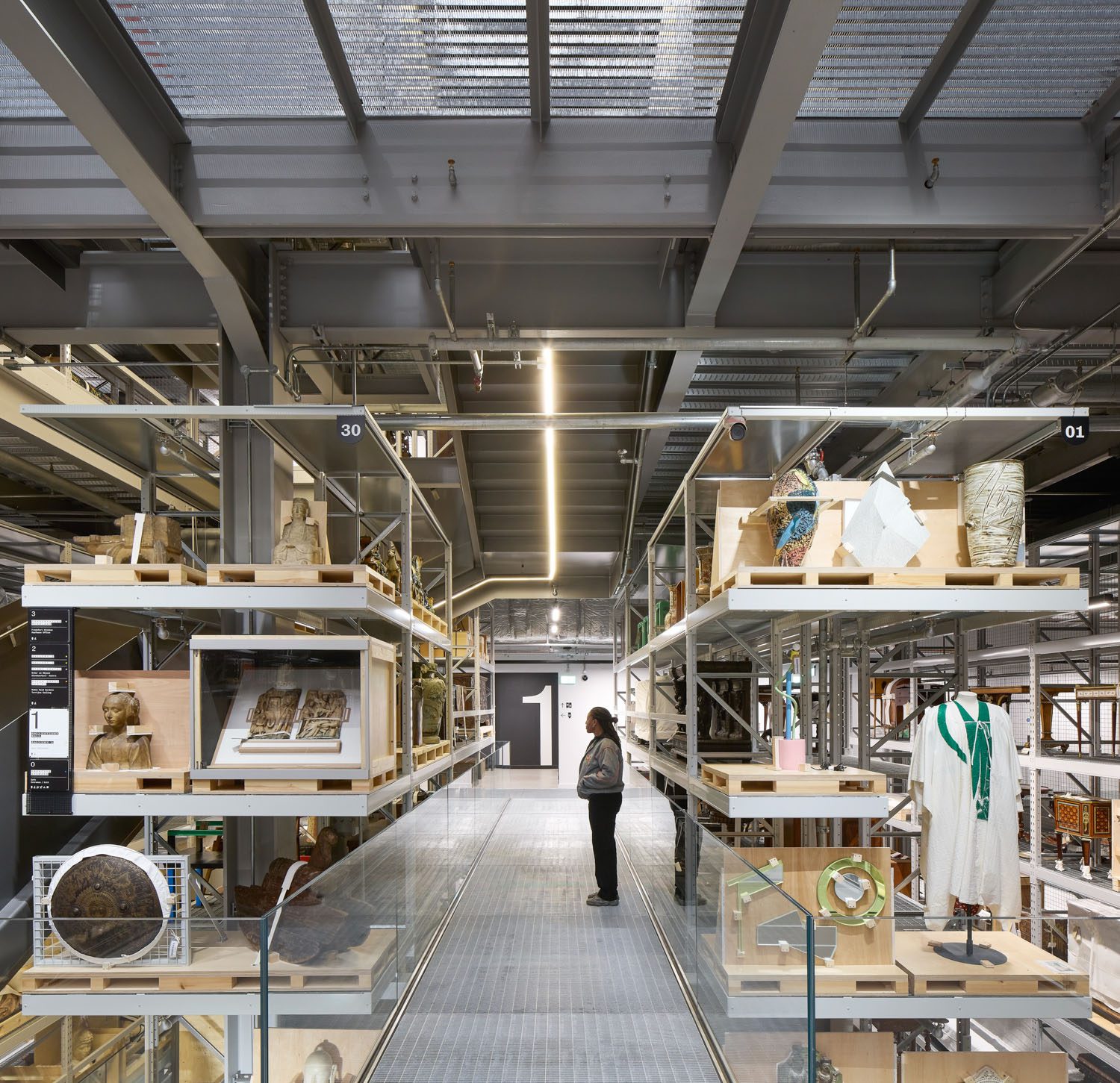 ชิ้นงานส่วนใหญ่ถูกจัดแสดงบนชั้นโดยไม่มีกระจกหรือราวกั้น แต่ละแถวของชั้นจะมีเลขกำกับไว้แบบเดียวกันกับระบบของคลังเก็บของ