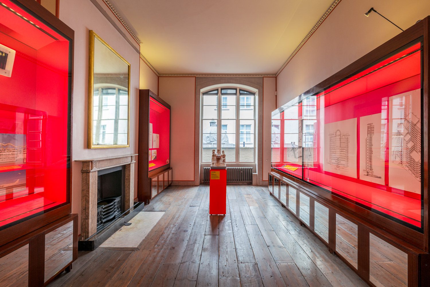 ภาพของห้องที่สองของนิทรรศการหลัก ที่แสดงแบบที่วาดด้วยมือขนาดใหญ่ และมีแบบจำลอง Drawing Gallery อยู่ตรงกลาง