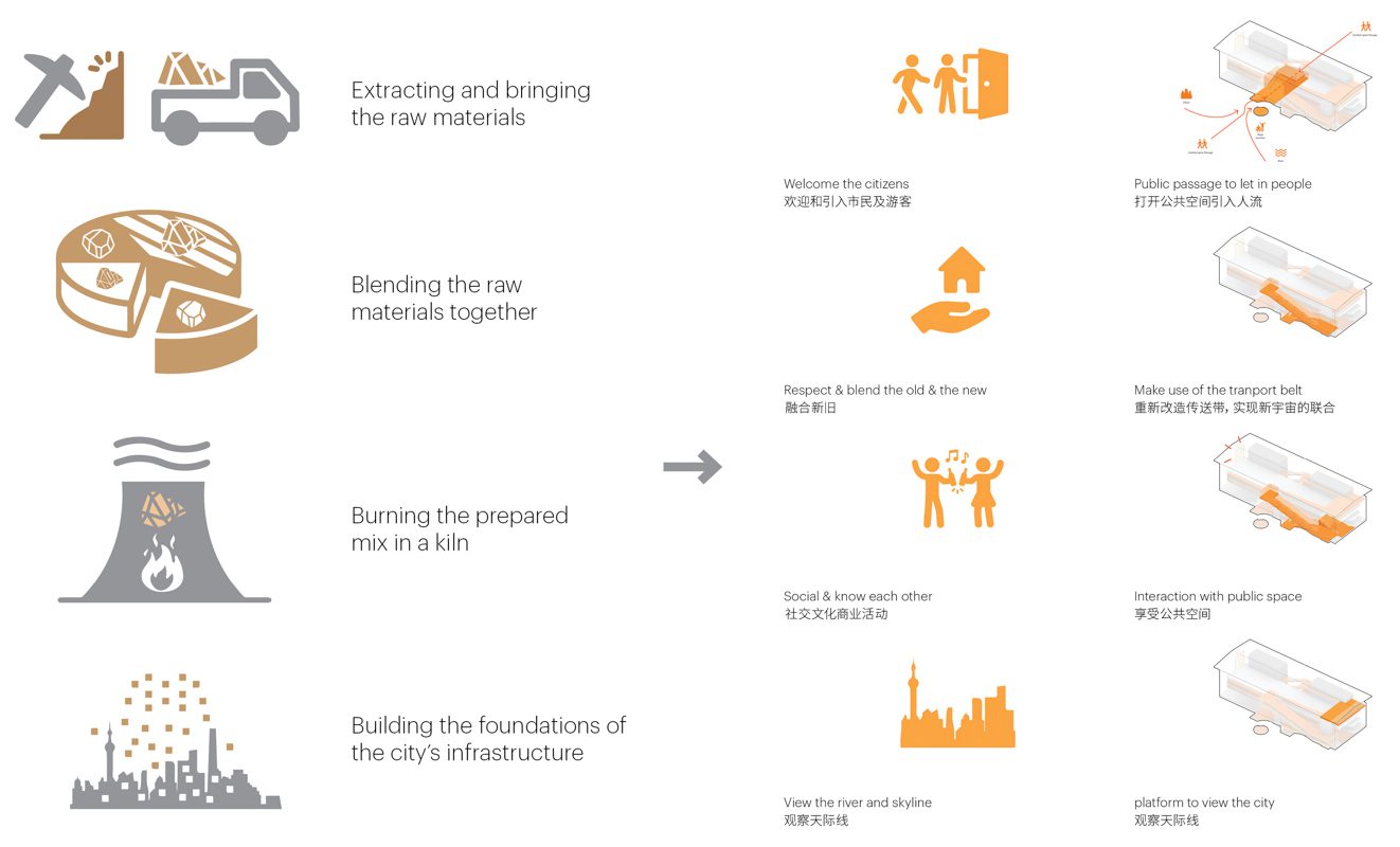 ซึ่งพื้นที่โรงงานปูนซีเมนต์ทั้งในส่วนใช้งานเดิม และในส่วนที่ไม่เคยเปิดใช้เนื่องจากยังสร้างไม่เสร็จ ก็ได้ถูกทำให้เสร็จเรียบร้อยโดยการปรับปรุงพื้นที่อาคารให้กลายเป็นโรงแรม ร้านค้าและร้านอาหาร อีกทั้งตัวอาคารแต่ละหลัง ก็ทำหน้าที่เอื้อประโยชน์ให้แก่กันละกัน อย่างเช่น อาคาร M Factory ที่เปรียบเสมือนบิลบอร์ดขนาดยักษ์ที่คอยดึงดูดผู้คนเข้ามาในโครงการ และอาคารที่เหลือต่างๆ กับพื้นที่สาธารณะริมแม่น้ำ ก็มีหน้าที่สำหรับการรองรับกิจกรรมต่างๆ ตามแต่ความต้องการของผู้ที่เข้ามาในพื้นที่โครงการ