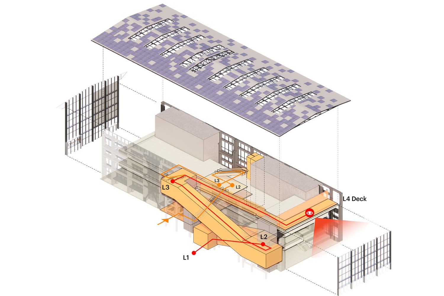 ในส่วนของงานออกแบบสถาปัตยกรรมที่ทาง MVRDV รับผิดชอบหลักๆ ในโครงการ จะมีด้วยกันอยู่สองอาคารคือ อาคารแรก M FACTORY ที่แต่เดิมเป็นโรงงานที่มีโครงสร้างพาดช่วงกว้างตามรูปแบบมาตรฐาน ซึ่งทาง MVRDV ต้องการให้องค์ประกอบใหม่ที่จะใส่เข้าไปในนั้นทำหน้าที่เชื่อมต่อฟังก์ชั่นและกิจกรรมใหม่ ที่จะเกิดขึ้นภายในอาคารให้มีความต่อเนื่องกัน นำไปสู่การออกแบบบันไดสีส้มสะดุดตาที่เปรียบเสมือนสายพานที่ทำการลำเลียงผู้คนขึ้นลงไปมา ประกอบกับการแบ่งสรรฟังก์ชั่นการใช้งานอาคารขึ้นมาใหม่เพื่อให้สอดรับกับไลฟ์สไตล์ในปัจจุบัน โดยมีชั้นล่างอาคารจะเป็นตลาดที่ชื่อว่า Bloomarket ตลาดที่ผสมผสานการทานอาหารปกติธรรมดากับประสบการณ์การทานอาหารแบบ fine dining รวมเข้าไว้ด้วยกัน และในส่วนของพื้นที่ชั้นบนจะเป็นพื้นที่เปิดโล่งขนาดใหญ่ที่ไม่มีเสาตรงกลาง เหมาะสำหรับรองรับกิจกรรมที่หลากหลาย ทั้งการจัดอีเว้นท์ คอนเสิร์ต แฟชั่นโชว์ นิทรรศการ หรือการจัดงานประชุมต่างๆ ได้